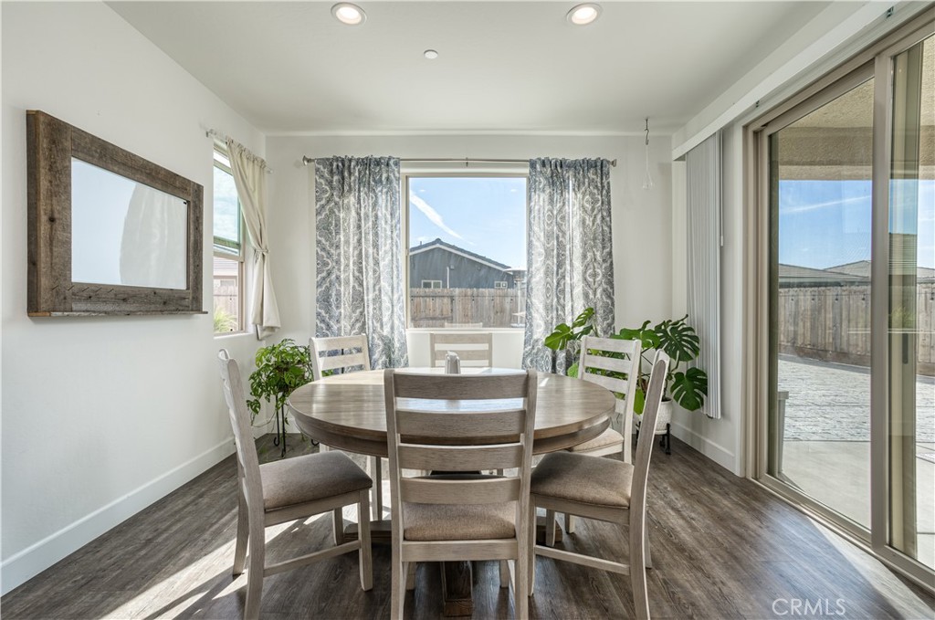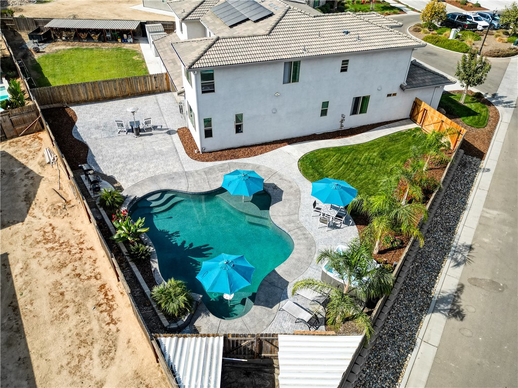 Located near the award-winning Ridge Creek Dinuba Golf Club, this stunning 7-bedroom, 4-bathroom home built in 2021 offers 3,671 sq ft of thoughtfully designed living space on a generous 14,810 sq ft lot, within the gated Ridge Creek Estates community. The expansive open-concept floor plan features a spacious living area that seamlessly flows into the gourmet kitchen, complete with a walk-in pantry and a charming coffee nook perfect for everyday living and entertaining. Dual-pane windows throughout bring in beautiful natural light, while 20 leased solar panels (PPA) provide energy efficiency and cost savings. The main level features both an ADA-compliant bedroom and bathroom, along with the primary suite, offering convenient single-level living. The luxurious primary retreat showcases spa-like dual shower heads, separate vanities, and walk-in closets. Upstairs, you'll find five additional guest bedrooms and two bathrooms, providing flexible space ideal for a home office, playroom, gym, or guest accommodations. A fun and unique touch awaits under the stairs: a custom Harry Potter-inspired closet. The 4-car garage is equally impressive, featuring a rare pass-through bay for easy backyard access and loading. Step outside to your private resort-style backyard, complete with a saltwater pool and spa, three fountains, custom stamped concrete for entertaining and BBQs, and discreetly fenced storage for patio furniture and pool equipment. An additional fenced grassy yard provides space for games, gardening, or extra storage. Residents enjoy golf life living, along with access to scenic walking trails that enhance the lifestyle appeal of this exceptional community. Don't miss this rare opportunity to own a large, modern home in one of Dinuba's most desirable gated neighborhoods.