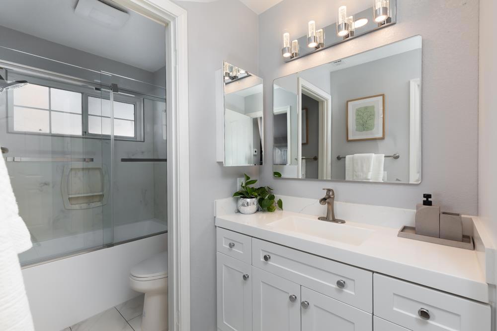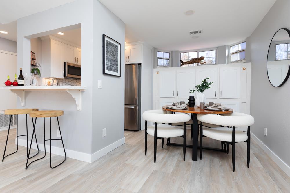 Welcome to this beautifully remodeled upstairs condo in Willow Glen,a bright, one-bedroom, one-bath home that blends comfort and modern style. Step inside to a spacious open floor plan highlighted by vaulted ceilings, new flooring, and contemporary paint colors. The modern kitchen features stainless steel appliances, a reverse-osmosis water system, and ample cabinetry for easy cooking and storage. The bedroom features a huge walk-in closet, and the spa-like bathroom includes an extra-deep soaking tub plus a custom towel closet. For convenience, enjoy in-unit laundry with a washer and dryer, and a private one-car garage for secure parking and storage. The condo is move-in-ready, with new central air conditioning, furnace, water heater, and ductwork throughout. Entertain in the open living and dining areas or enjoy the kitchen's counter bar and formal dining space. Custom-built-in cabinetry offers extra storage in the dining area. A large sliding glass door opens to a private patio overlooking serene, landscaped grounds. HOA fee covers water, garbage, and exterior maintenance. You'll also have a dedicated parking spot (#7). Just a short walk from downtown Willow Glen and the Los Gatos Creek Trail, with easy access to Highway 280, Caltrain, and Light Rail, makes commuting simple.