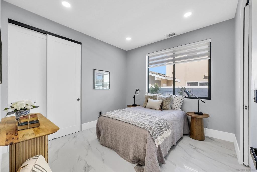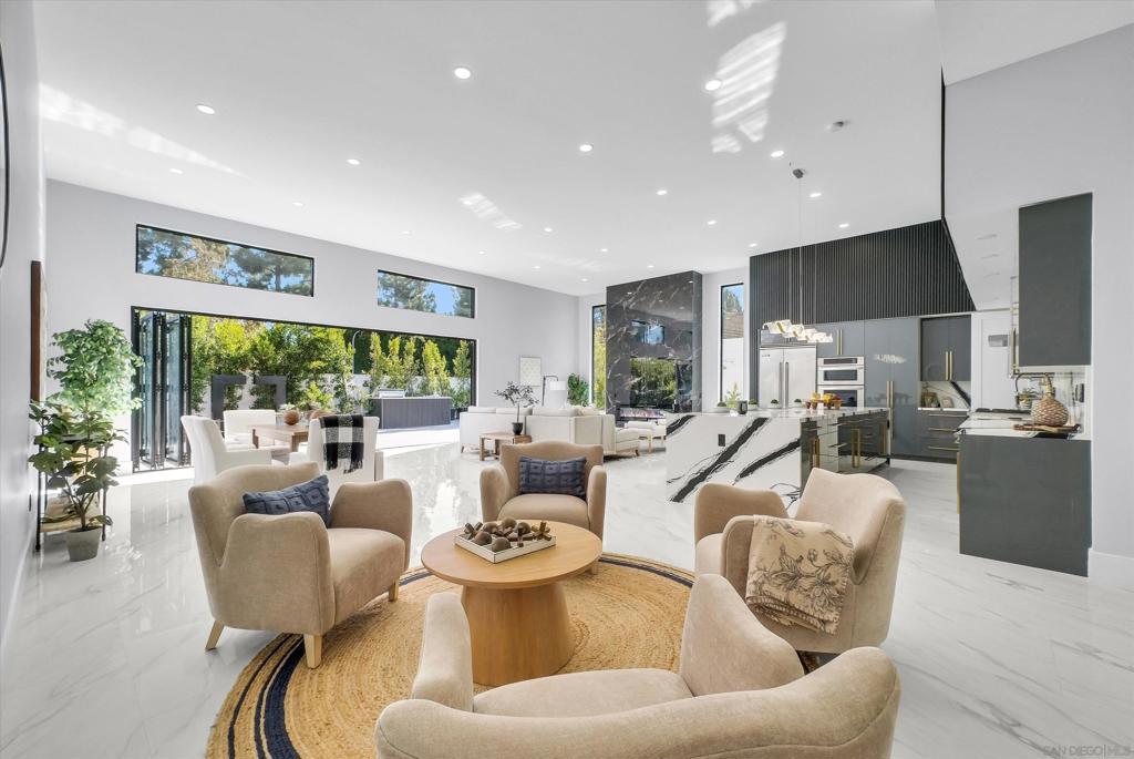 A stunning architectural masterpiece blending modern design with luxury comfort. This fully renovated single-story home showcases soaring ceilings, sleek porcelain floors, and an open-concept great room that flows seamlessly to an entertainer’s patio through massive glass doors. The gourmet kitchen features custom cabinetry, waterfall marble counters, and designer lighting. The primary suite offers a spa-inspired bath with freestanding tub, rainfall shower, and LED backlit mirrors, plus a custom-built walk-in closet. Every detail—from the linear LED fixtures to gold-accented hardware—reflects sophisticated craftsmanship. Low-maintenance landscaping, sleek curb appeal, and a modern glass garage door complete this exceptional residence—perfectly designed for today’s lifest