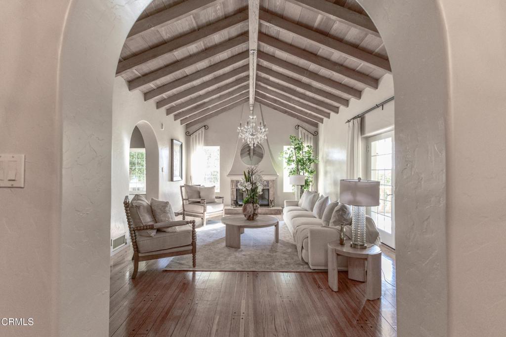 This stunning single-level Spanish Mediterranean pool home offers 4 bedrooms on an expansive 19,930 sq ft lot. Largely rebuilt and expanded in 2004 by the retired general contractor owner, the very well cared for main residence spans 4,155 sf and includes a rear 662 sf guest house. Known for its award-winning schools, the location combines privacy, scale, and convenience. A long front walkway is framed by manicured lawns leading to a spacious covered porch with a stone fountain. Inside, the foyer opens to a formal dining room with high-beamed vaulted ceilings and a fireplace, complemented by generous living spaces ideal for both everyday living and entertaining. Hand-painted tile accents throughout the home add warmth and character, reinforcing the Spanish Mediterranean design. The gourmet chef's kitchen features professional-grade stainless steel appliances, a walk-in pantry, built-in desk, and abundant cabinetry and counter space. The primary suite is a true retreat with a fireplace, dual closets, and a spa-inspired bath offering dual vanities, a soaking tub, and a separate shower with designer tile. Additional highlights include a wet bar, movie theater, whole-house generator, surround sound, security system, and solar power for the pool. The resort-style backyard is designed for entertaining with alfresco dining patios, saltwater pool and spa, and a detached guest house surrounded by lush landscaping. A three-car garage faces the rear and is accessed by a long gated driveway, breezeway, and spacious motor court suitable for multiple automobiles.