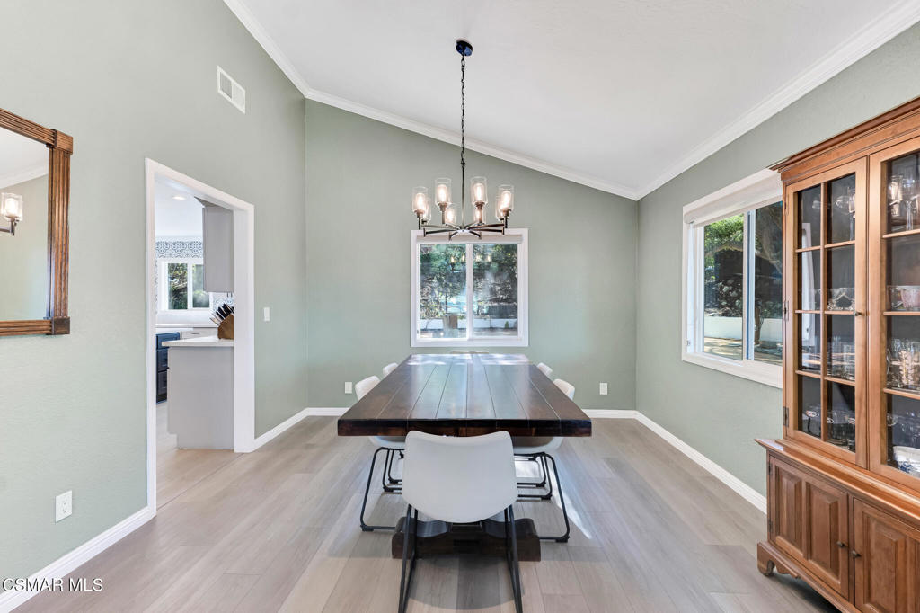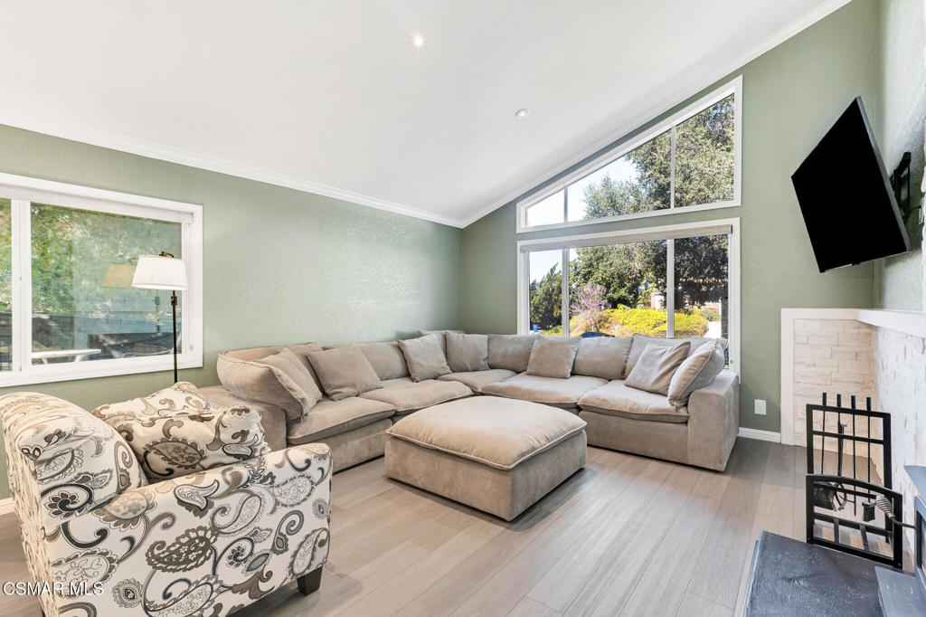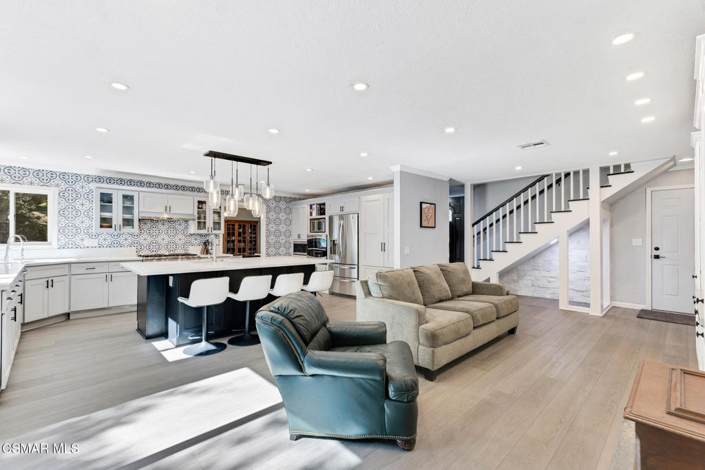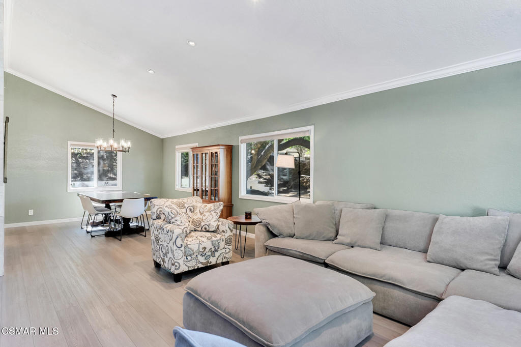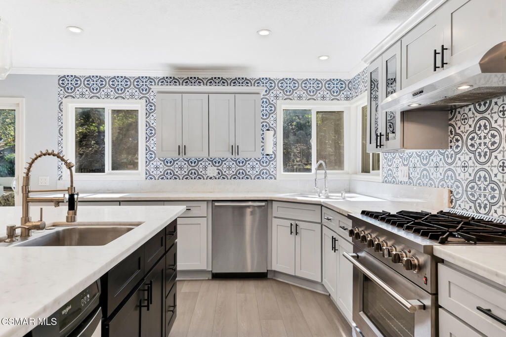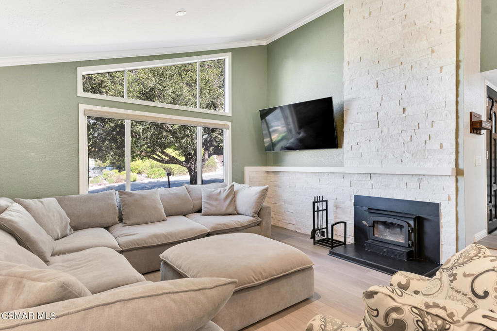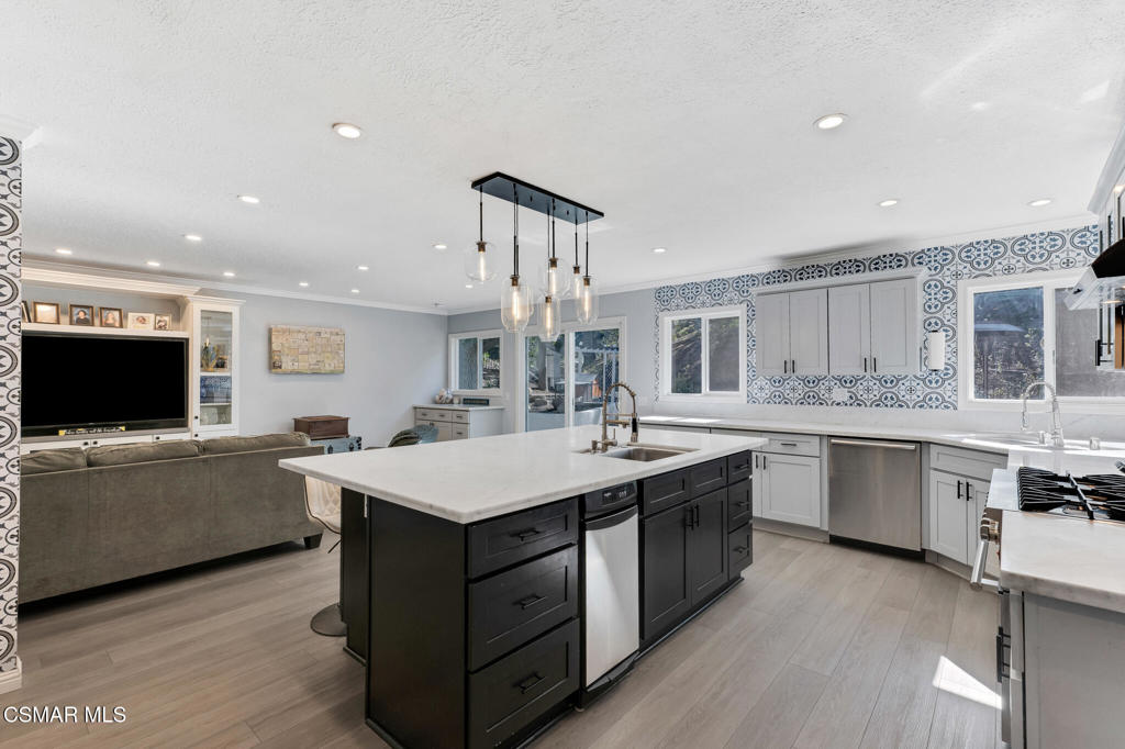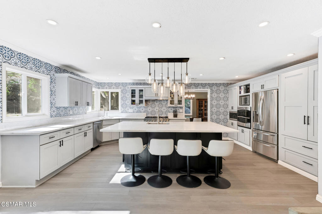 Beneath a breathtaking canopy of five mature oak trees--including one truly massive heritage oak--this exceptional Thousand Oaks property unfolds like a private compound, offering rare flexibility, privacy, and multi-structure potential on a premier corner lot. Expansive new lawns, stacked-stone accents, updated exterior lighting, and new garage doors create striking curb appeal and an estate-like presence that immediately sets the tone. Inside, soaring ceilings and abundant natural light illuminate upgraded flooring and recessed lighting throughout. The formal living and dining areas flow beautifully together, anchored by a dramatic stacked-stone fireplace that adds warmth and architectural presence--equally suited for intimate evenings or lively gatherings. At the heart of the home lies a true French Chef-inspired kitchen designed for serious cooking and entertaining at scale. A professional 6-burner gas range is complemented by four ovens serving distinct functions--including an air-fryer oven--while a massive marble-topped island with bar seating anchors the space. A large prep sink with its own dedicated garbage disposal, extensive custom cabinetry, and recessed lighting throughout ensure both form and function. The oversized island opens seamlessly to the family room, creating an expansive great-room layout ideal for gatherings large or small. Sliding glass doors enhance the connection to the outdoors, opening to the serene backyard beyond. A downstairs bedroom and full bath provide exceptional flexibility for guests, multigenerational living, or a private home office. Upstairs, the spacious primary suite features a walk-in closet and newly remodeled en-suite bath. Two additional bedrooms, an upgraded hall bath, versatile loft space, upstairs laundry, and a walk-in attic with extensive storage and potential future expansion complete the upper level. One of the most compelling features of this property is the fully finished 25' x 22' climate-controlled flex studio garage, offering ~600 square feet of additional living-style space beyond the main home (not included in MLS square footage!). Thoughtfully upgraded far beyond a traditional garage, it includes fully insulated walls and ceiling, heating & air conditioning served by the home's HVAC system, oak flooring, closet storage, three dimmable recessed LED lighting zones, two remote-controlled LED ceiling fans, an insulated garage door, and a private exterior entrance with dedicated exterior lighting, and built-in cabinetry including hot & cold water plumbing with a fully roughed-in sink connection beneath cabinet space--ideal for a future kitchenette! A full bathroom is located just steps away in the main home, with potential to add a bathroom within the space. This rare apartment-style flex area offers exceptional versatility and may function as a guest suite, separate living quarters, private-entry office, studio, gym, multigenerational space, or potential future ADU-style conversion.--a level of adaptable space rarely found in Thousand Oaks. Tucked into a private rear corner of the lot beside a seasonal stream and surrounded by mature foliage sits a separate 18' x 10' fully electrified structure complete with interior and exterior lighting, upgraded outlets, and security lighting. Outfitted with built-in cabinetry and generous counter space, this detached retreat provides remarkable flexibility as a workshop, art studio, hobby space, gym, or peaceful backyard office immersed in nature. The backyard itself feels like a private park, with multiple patio areas, drought-conscious landscaping, and remarkable privacy beneath 5 mature oaks forming a stunning natural canopy. It is rare to find this combination of lot size, tree coverage, and multi-structure flexibility within Thousand Oaks. Ideally located near award-winning Conejo Valley schools, parks, hiking & biking trails, and convenient access to the 101 freeway, this is far more than a remodeled home-it is a rare com...