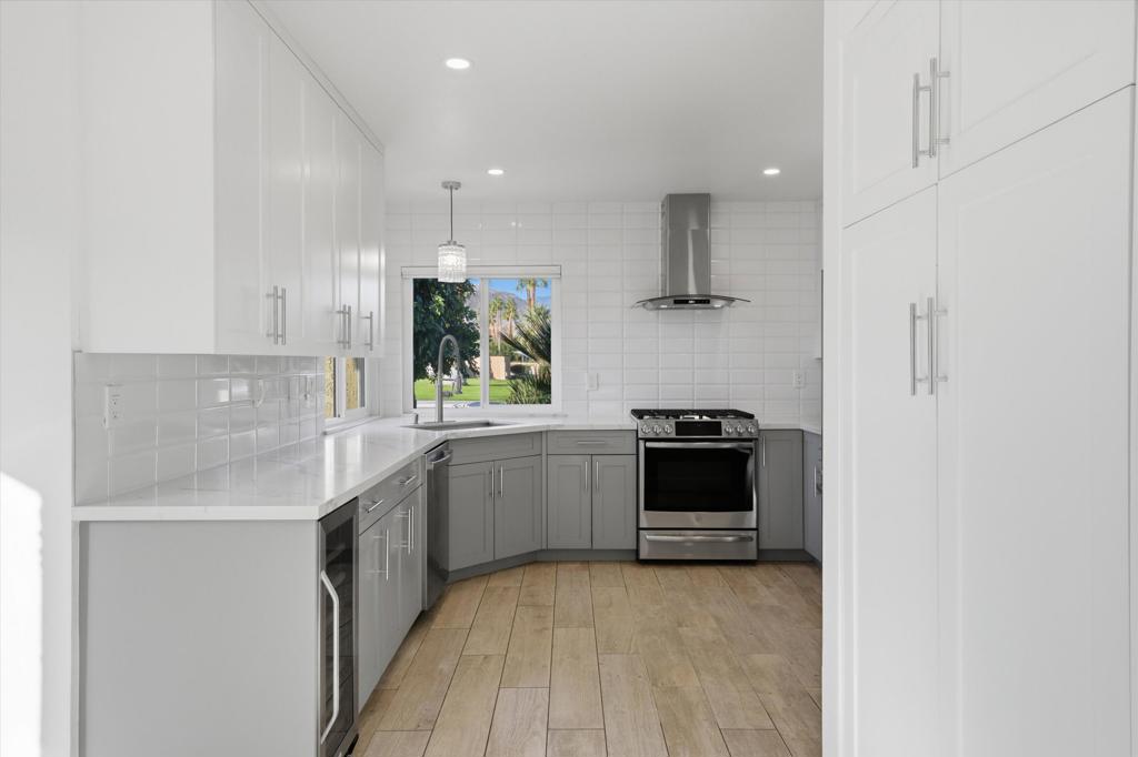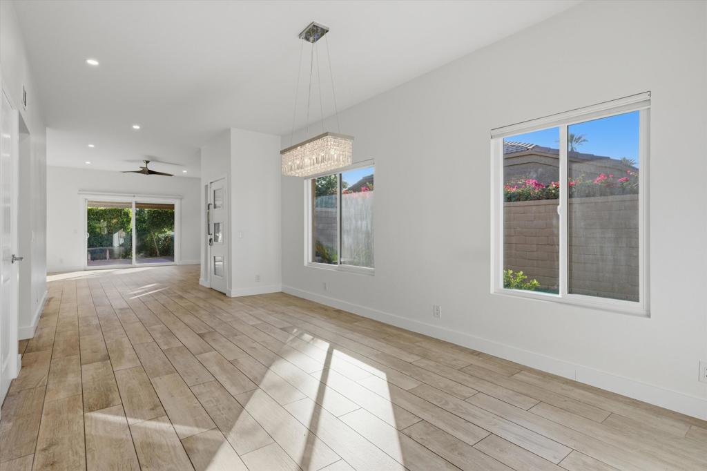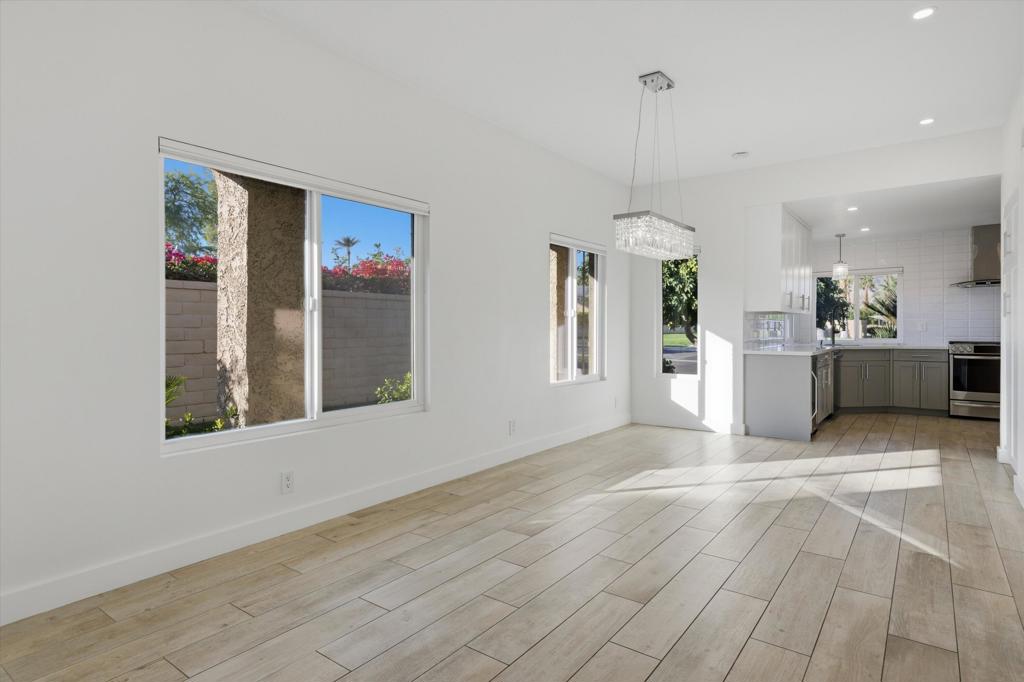 Appreciate this exceptional location, thoughtful design, and the value of high-quality upgrades! Upon entering you'll notice the cohesive design and attention to detail throughout--no mixed finishes. The kitchen is a showstopper with mountain views, a large farmhouse sink, sleek modern cabinetry, stunning white quartz countertops with mosaic backsplash, and high-end stainless GE appliances, including a 5-burner gas range with suspended hood, plus a built-in wine fridge. An attached 2-car garage with lots of storage is conveniently accessed from the kitchen. Throughout the home, all exterior windows & sliders, and interior doors, frames & moldings have been replaced. A new A/C was installed in June 2024. Additional features include wood-plank tile flooring throughout, smooth-finish ceilings, recessed LED lighting with Lutron variable controls, and remote-controlled, variable-height cellular blinds in the living areas and primary bedroom. The open living and dining area is anchored by a striking architectural accent wall and a modern white stone fireplace with rustic wood beam mantle and integrated TV. The primary suite is a true retreat with wall-mounted TV, architectural accent wall, large walk-in closet with custom built-ins, and direct access to the beautiful, private patio. The elegant ensuite bath features double sinks, high-tech mirrors, and an expanded layout showcasing a freestanding soaking tub AND waterfall shower. Two guest bedrooms are thoughtfully separated by a covered atrium with two remote-controlled skylights equipped with rain sensors for automatic closing, convenient built-ins & more. The beautifully tiled guest bath is equally impressive. The spacious gated patio is a private oasis enclosed by tall, lush Ficus hedges and low-maintenance desert landscaping. Ideally located in a very private setting with mountain views, lush greenery, internal location away from busy streets, and no homes behind, this impressive property is directly across from a community pool and spa, guest parking, and community mailbox. The community offers walking paths, tennis, pickleball, 4 community pools/spas with a low HOA fee of $548/month.