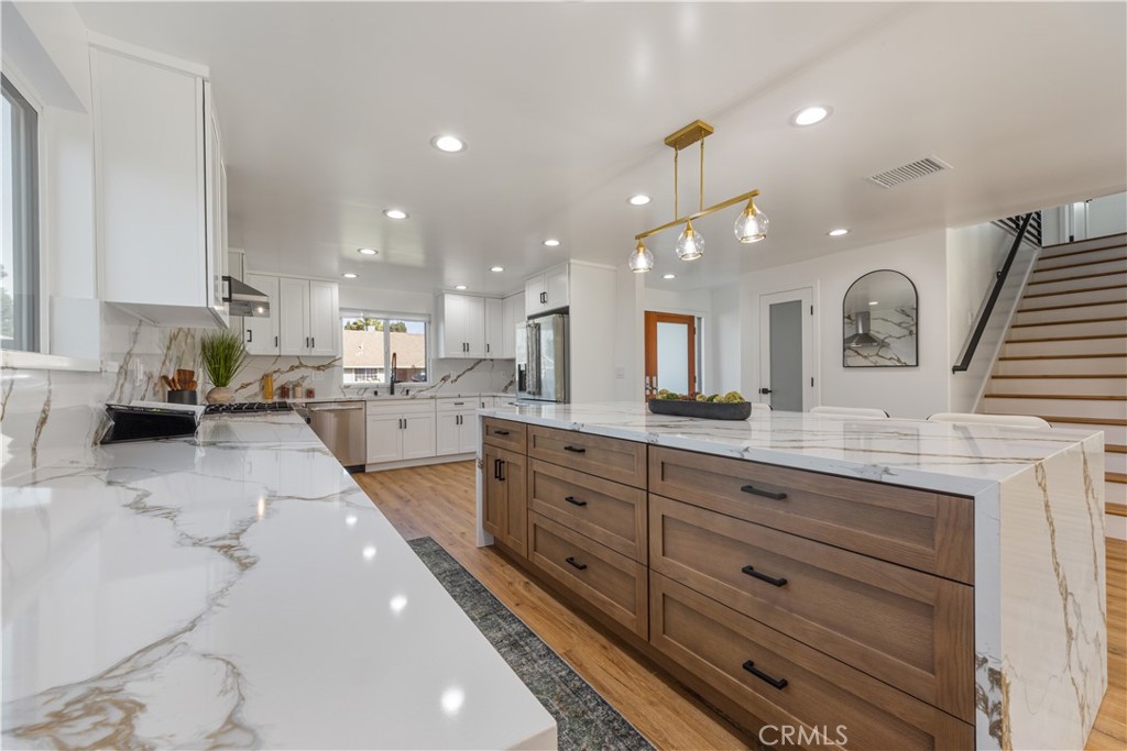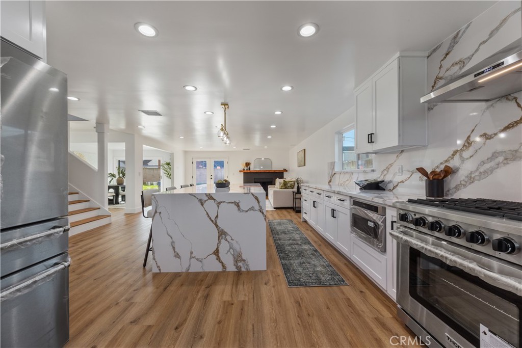 *First Open House: Saturday, February 7th from 1:00–4:00 PM* Welcome to 1812 E Cyrene Drive, Carson, CA 90746 — a completely remodeled and spacious home offering 5 bedrooms plus a bonus room, 3 full bathrooms, and 2,608 sq ft of thoughtfully designed living space on a 5,203 sq ft lot. This impressive home features a highly desirable floor plan with a downstairs bonus room, currently staged as a home office, and a full bathroom on the main level—ideal for guests, multigenerational living, or work-from-home flexibility. All three bathrooms include bathtubs, a rare and valuable feature for families. The heart of the home is the open-concept kitchen and living area, showcasing brand-new shaker cabinets, beautiful quartz countertops, and a large center island with waterfall quartz detailing. The kitchen is equipped with a premium Thor stainless steel appliance package, including a 36-inch gas range (rarely found at this price point in the area), range hood, slide-out microwave, dishwasher, and refrigerator. A cozy fireplace anchors the living room, creating the perfect space for everyday living and entertaining. The main level also includes a formal dining area with sliding doors to the backyard, while the living room features new French doors, providing seamless indoor-outdoor flow and abundant natural light. Upstairs, you’ll find five generously sized bedrooms, including a spacious primary suite designed to comfortably accommodate a king-size bed, dresser, nightstands, and a sitting area. The en-suite primary bathroom offers a large walk-in shower, separate soaking tub, and a large walk-in closet, creating a true retreat. Additional highlights include: -New central air and heating system with Nest thermostat -EV charger in the garage -New garage door and opener Completely remodeled throughout This turnkey home delivers modern finishes, generous square footage, and premium features rarely found together in Carson. A must-see for buyers seeking space, style, and move-in readiness.