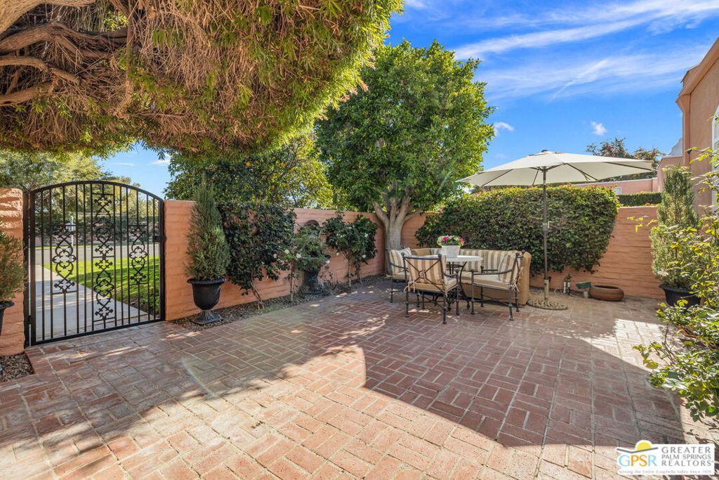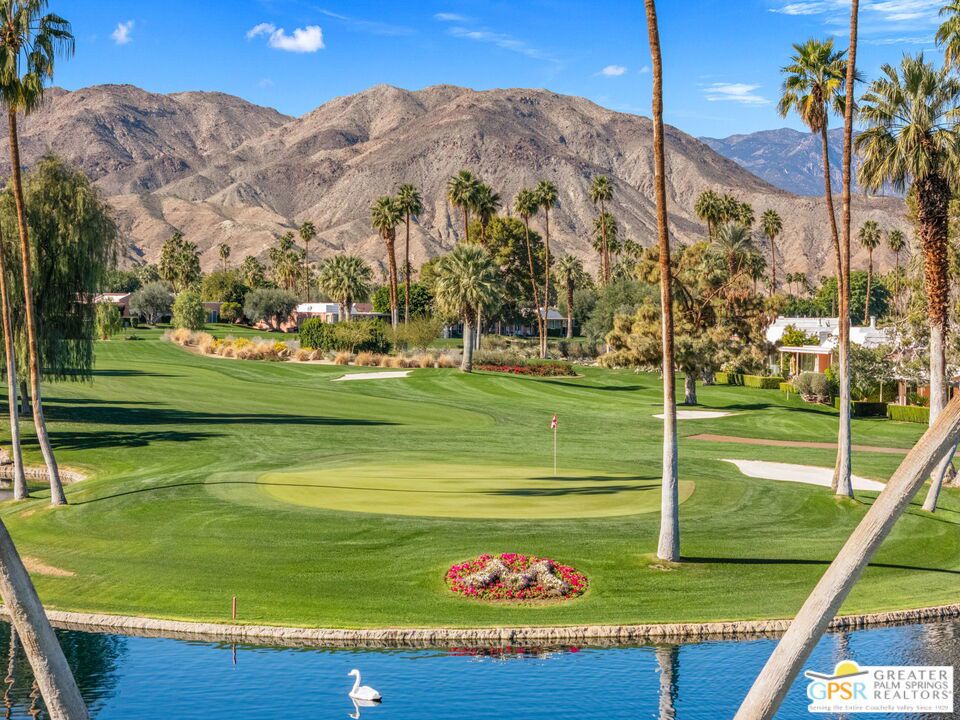 A rare Hollywood Regency restoration behind the gates of Marrakesh Country Club, this turnkey furnished 2 bedroom, 2 bathroom residence is a museum-quality tribute to the original vision of architect John Elgin Woolf thoughtfully elevated for modern desert living. With a privatized west-facing yard and exceptional indoor-outdoor flow, this premier offering stands apart as one of the finest restorations to come to market within this architecturally significant community. A comprehensive restoration was completed in 2024, followed by a fully reimagined kitchen finalized in January 2026, along with freshly painted interiors and new seagrass carpeting. Every decision was guided by extensive research into Woolf's architectural philosophy, with inspiration drawn from his legendary Woodland estate in Beverly Hills - once home to producer Robert Evans. Authentic period elements were meticulously recreated by skilled artisans, including panel and crown mouldings, pilasters, fluted trims, columns, oval window, door crowns, mirrors, urn accents, and Woolf's signature mock "invisible flue" fireplaceall executed with exceptional craftsmanship and finishes. Arrival is cinematic. A gated front courtyard with fountain, rose garden, and generous entertaining space sets the tone before iconic Pullman double doors open to interiors featuring 10-foot ceilings, expansive sliders, Austrian crystal chandeliers, custom moulding treatments, designer and art lighting, and dramatic black and opal marble surfaces. The restored kitchen offers quartz countertops, a Wolf range with ventilation hood, and mountain views, blending period integrity with modern function. Bathrooms feature restored cabinetry, marble counters, and polished nickel fixtures. Both bedrooms are generous in scale and function as primary suites with one enhanced by a retreat-style sitting area and each offering expansive closet space. The residence is ideally positioned on an exceptionally sited lot with a rare large side lawn, inner atrium garden, and an almost private rear garden and patio framed by mountain views, citrus trees, and beautifully maintained HOA grounds. Electric vehicle charging capability is available in the garage. Offered turnkey furnished per inventory for an effortless, immediate move-in experience, this is a truly exceptional opportunity where architectural integrity, refined design, and relaxed desert living converge within one of the Coachella Valley's most celebrated architectural communities.