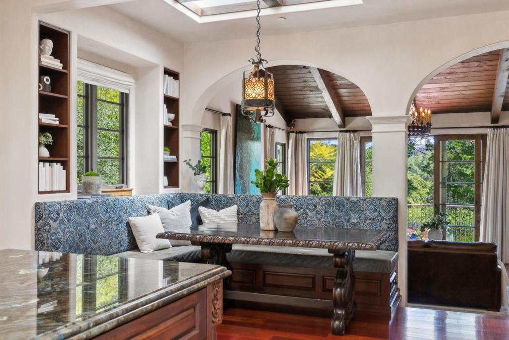 EPIC HOMAGE TO CRAFTSMANSHIP AND LIFE IN THE SUN...One of Hillsborough's Most Elite Custom Remodels, steeped in the Magic of Montecito and Palm Beach. Every inch meticulously curated of high-end caliber inside and out. Ultimate privacy heightens soaring views above canyon, ridgelines, and sun-blessed luminosity. Top flight luxury designer elements of Venetian plaster walls, vaulted ceilings of 14-15 feet, European tilework, mahogany doors, and made-to-order light fixtures by Steven Handelman of Santa Barbara. Wolf, Sub-Zero, Miele, exquisite custom cabinetry, & more. Indoor/Outdoor celebration as a personal resort with saltwater PebbleSheen pool, 3 waterfalls & raised spa. Flat grassy yards, barbecue cove, secret Napa garden of fruit orchard & irrigated veggie beds. The beauty of the floorplan includes 4 bedrooms on the main level, plus private lower level for 5th bedroom, huge media room & 2nd kitchen. This level is the perfect in-law apartment, teen hangout, or poolside media lounge. And shhhh, don't forget the world-class temp-controlled wine cellar as your own speakeasy! Prestige cul-de-sac location within minutes of Nueva & West Schools, & easy Hwy 280 connection to VC realm of Silicon Valley, plus AI, private equity, & biotech of South San Francisco and Financial District.