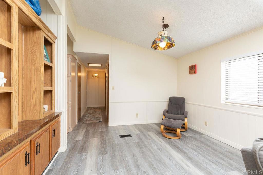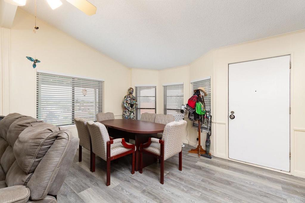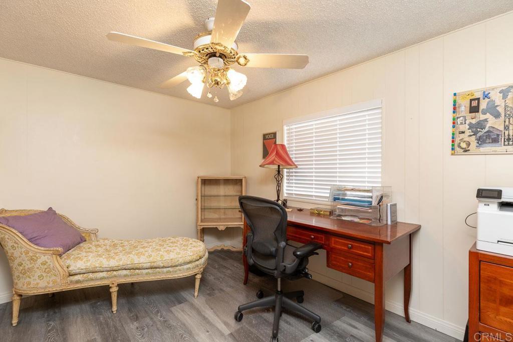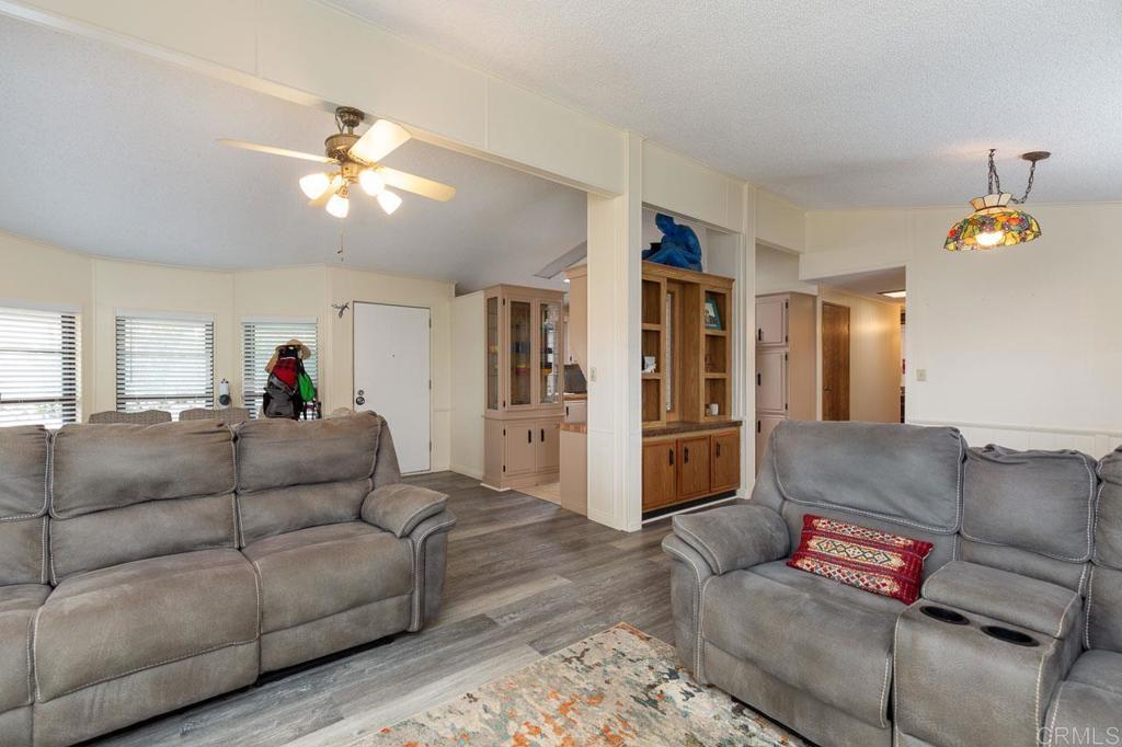 Stunning Mountain Views from Your Private Cul-de-Sac Retreat in Citrus Gardens 55+ Community. Perched at the end of a peaceful cul-de-sac in the desirable Citrus Gardens community of North County Escondido, this charming two-bedroom, two-bath manufactured home captures stunning western mountain views that transform into breathtaking sunsets each evening. A sliding glass door opens from the living area to your private outdoor sanctuary—a covered patio overlooking the San Marcos mountains; with a fenced side yard that's home to your own citrus trees with mature lemon and avocado among established landscaping and raised bed gardens. This tranquil 5,583 square foot lot offers both morning sunrise and evening sunset vistas with no through traffic, creating a peaceful retreat perfect for relaxation and outdoor enjoyment. Inside, vaulted ceilings and an open floor plan create a bright, welcoming space filled with natural light from double-paned windows. Fresh interior paint and vinyl plank flooring flow throughout this west-facing home that welcomes cool cross-breezes, with wide hallways for comfortable navigation. The kitchen features cabinets, a bright garden window, pantry storage, and a gas range, with an open flow perfect for daily living or entertaining guests. The laundry room exceeds expectations with washer/dryer included, plus a built-in desk, extra counter space, and abundant storage—ideal for a workspace or hobby area. Both generously sized bedrooms provide comfort and privacy, with the primary suite featuring a walk-in closet and spa-like bathroom complete with Jacuzzi tub, walk-in shower, and built-in cabinets for plentiful storage. Stay comfortable year-round with a brand new furnace installed in 2024, central air conditioning, and three ceiling fans positioned throughout. The impressive two-car garage features extensive cabinets, a workbench, drawers, and adjustable shelving for all your storage and project needs, plus a spacious driveway accommodating additional vehicles, while a storage shed provides extra space for tools and equipment. Nestled in the intimate 106-home Citrus Gardens 55+ community at the end of a quiet cul-de-sac, this home offers exceptional value with land ownership and no space rent—just a low $195 monthly HOA that covers trash collection, basic cable, and access to resort-style amenities including a clubhouse with banquet facilities, sparkling pool, spa, and shuffleboard courts, with convenient guest parking for visitors. There are no Mello Roos taxes and no land lease fees to worry about. Located minutes from Costco, Vons, restaurants, coffee shops, banking, pharmacy services, Palomar and Kaiser Hospitals, scenic hiking and biking trails, Dixon Lake, Woodland Park, nearby golf courses, and beaches, with easy access to the I-15 freeway and El Norte Parkway bus stops for convenient transportation. This home is eligible for VA, FHA, and Fannie Mae financing options and welcomes one small pet under 16 inches at the shoulder. Schedule your showing today.