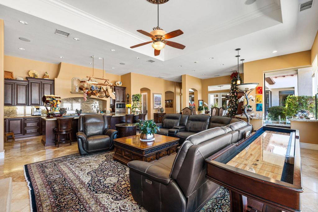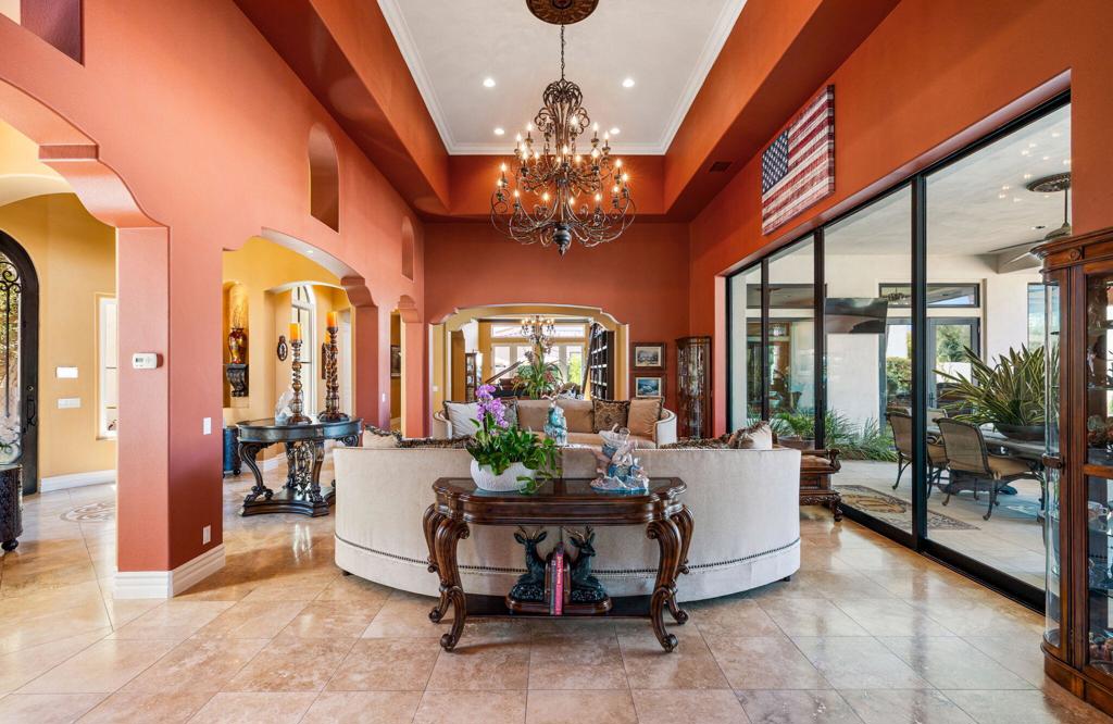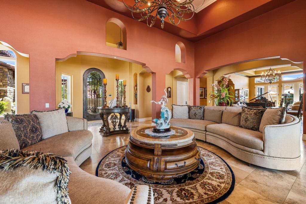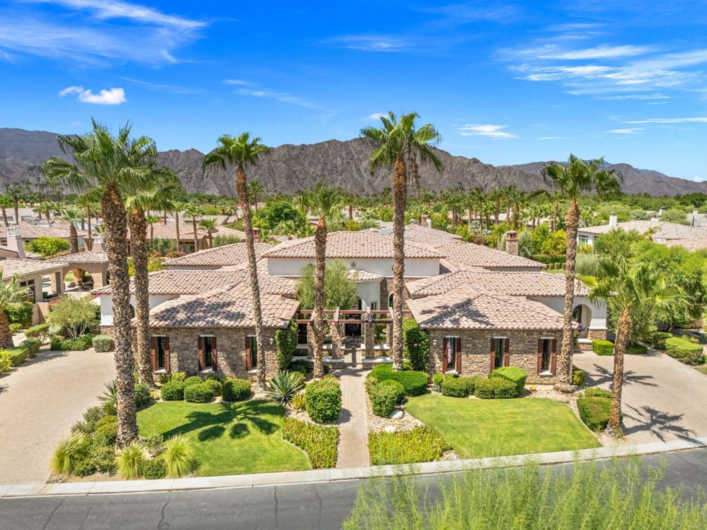 Set against the dramatic backdrop of the Santa Rosa Mountains, this extraordinary estate offers over 5,600 sq. ft. of refined living within the prestigious, guard-gated community of Griffin Ranch. Once part of the legendary Merv Griffin estate, this exclusive 300-acre enclave was thoughtfully designed with an equestrian-inspired vision, attracting those who appreciate both heritage and an exceptional desert lifestyle.From the moment you arrive, the home impresses with commanding curb appeal and timeless architectural presence. Inside, a stately library/office makes a bold statement with bespoke craftsmanship, rich detailing, and striking chandeliers that set the tone for the elegance found throughout.The primary suite is a true private retreat--complete with a sitting area and an exquisitely designed fireplace that adds warmth and understated luxury. Designed for both grand entertaining and everyday comfort, the home features multiple side patios adorned with tranquil fountains, a temperature-controlled wine room, and sweeping mountain views that create a serene desert ambiance.Notable upgrades include whole-home surround sound, extended crown moldings, custom finishes, and designer window treatments. The gourmet kitchen is a chef's showpiece, appointed with Sub-Zero and Wolf appliances, dual Asko dishwashers, and expansive custom cabinetry--ideal for entertaining at any level. A spacious 4-car garage adds both convenience and functionality.The backyard is a blank canvas, offering the rare opportunity to design your own personal oasis--whether that's a resort-style pool, outdoor entertaining pavilion, or tranquil garden retreat.Every detail of this residence reflects superior craftsmanship, sophistication, and thoughtful design--making it one of the desert's most distinguished offerings and a rare blend of luxury, lifestyle, and community.