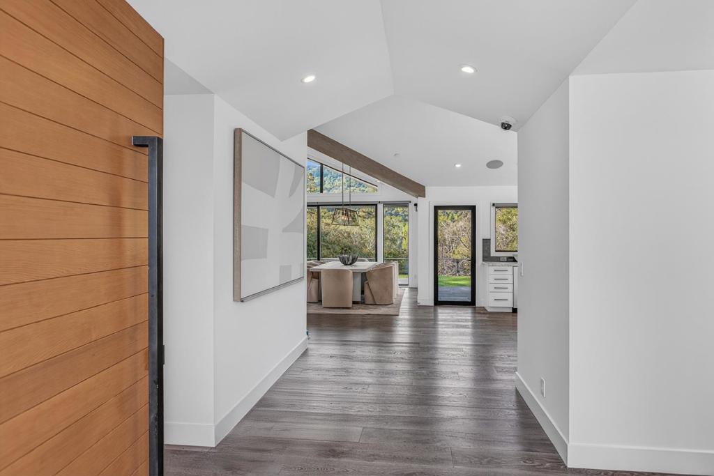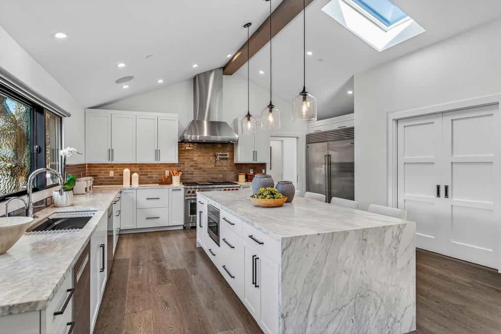 Contemporary single-level main residence with attached two-story ADU on 1.1+ private acres finished in 2021, offering direct Windy Hill views and walking distance to Portola Valley Town Center, library, restaurants, farmers market, and trailheads. Striking modern architecture features walls of glass, soaring ceilings, skylights, and white oak floors throughout. The dramatic great room opens to covered and open terraces and a level lawn just off the living room patio, with rear grounds anchored by a heritage oak. The designer kitchen showcases Calacatta marble surfaces, a waterfall island, and high-end appliances. The main residence includes a dedicated office, four bedrooms, and three and a half baths, highlighted by a serene primary suite with Windy Hill views and a Zen-inspired bath with private garden. A privately located bedroom suite is ideal for guests or an au pair. The attached ADU offers one bedroom, one bath, a full kitchen, and a living room with fireplace, with finishes matching the main home. Gated entry, custom pavers, cedar entry door, fountains, mature landscaping, level synthetic lawn, raised garden beds, and fully fenced grounds complete this desirable property. Total Finished square footage: 4,390 sq. ft. (main house: 3,520 sq. ft. and ADU: 870 sq. ft.)