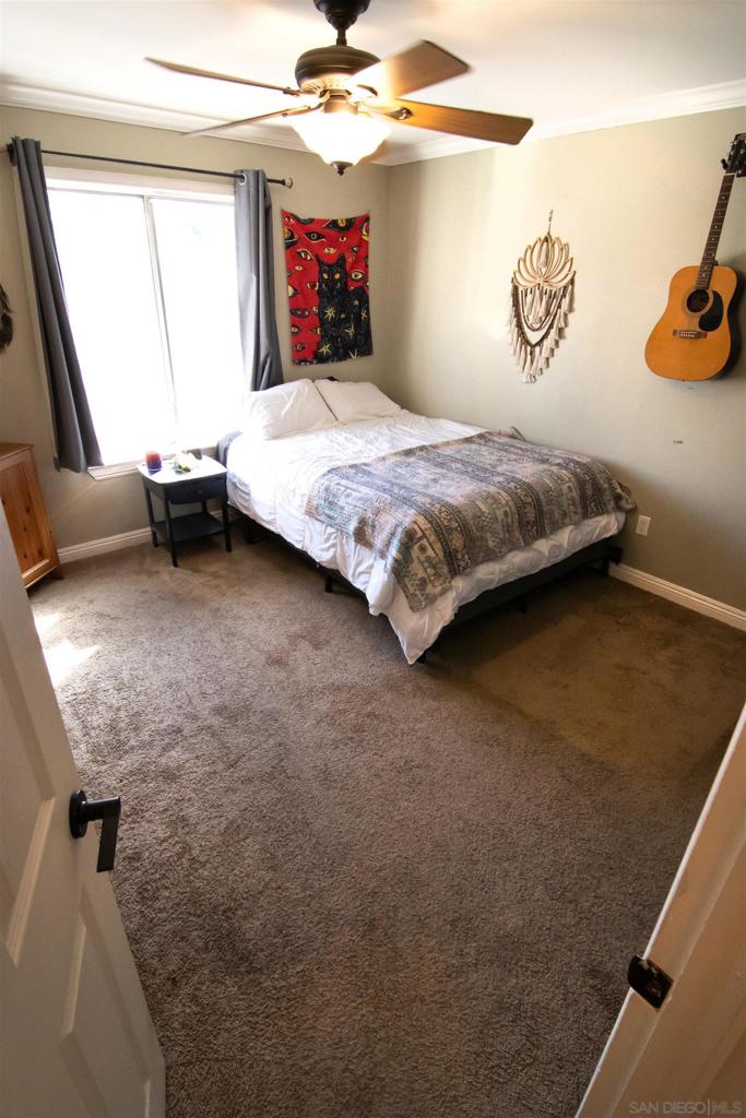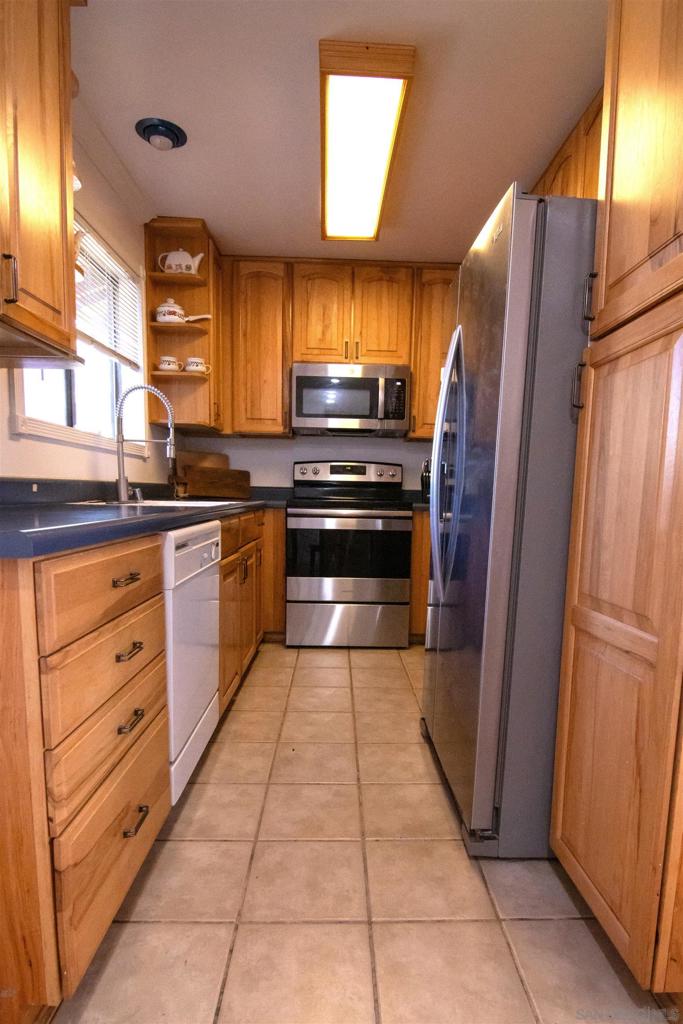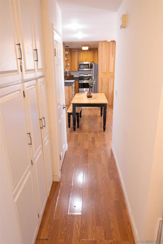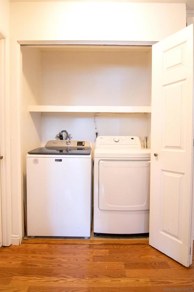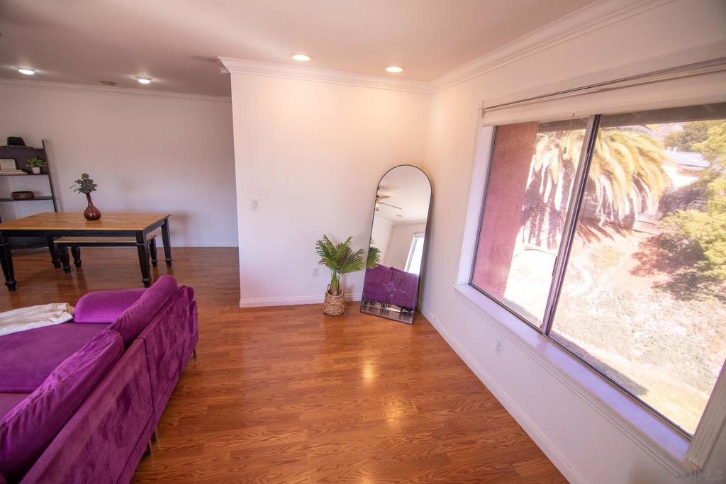 VA approved! Charming upstairs end unit condo with a bright, open floor plan and mountain views from the living area and private patio. This 2 bedroom, 1 bath home features laminate flooring in the living, dining, and hallway, a kitchen with dishwasher and built in microwave, and a full-size washer and dryer inside the unit. Enjoy the convenience of a garage with storage plus an additional parking space behind the garage. The community offers a sparkling pool and lush, mature landscaping throughout. Great location with easy access to shopping, dining, and freeways!