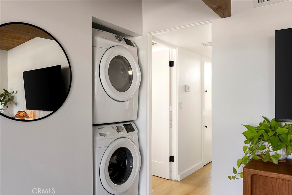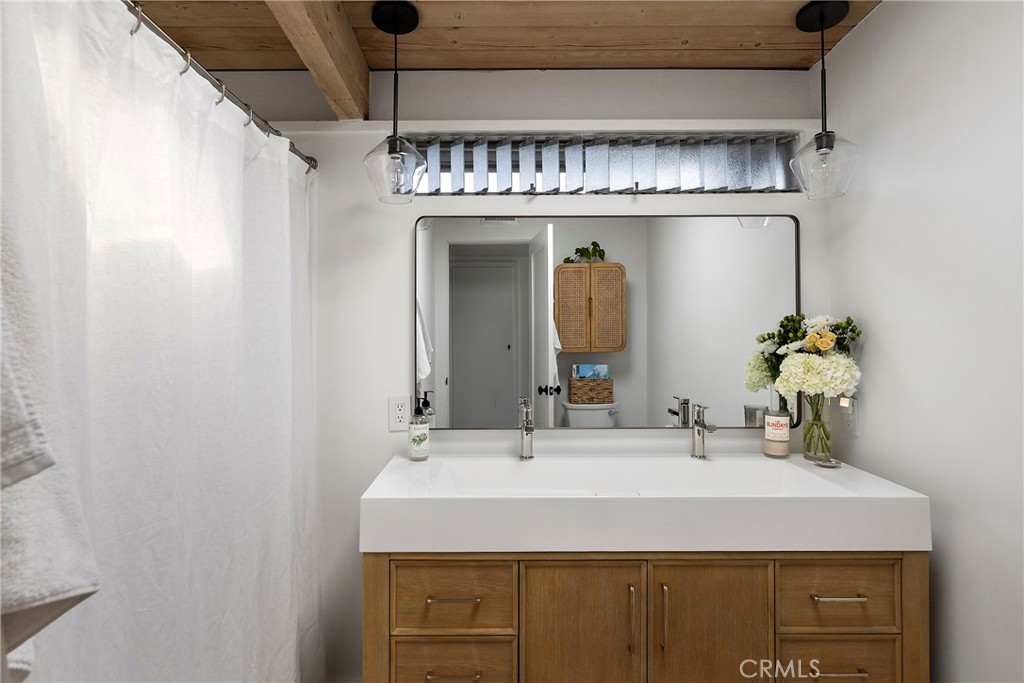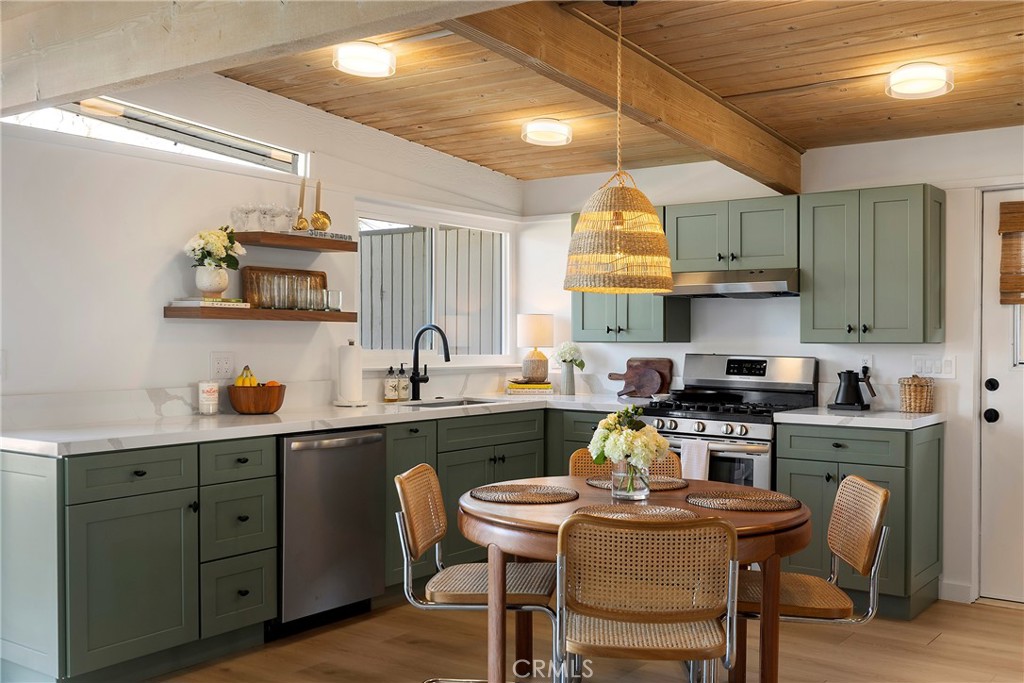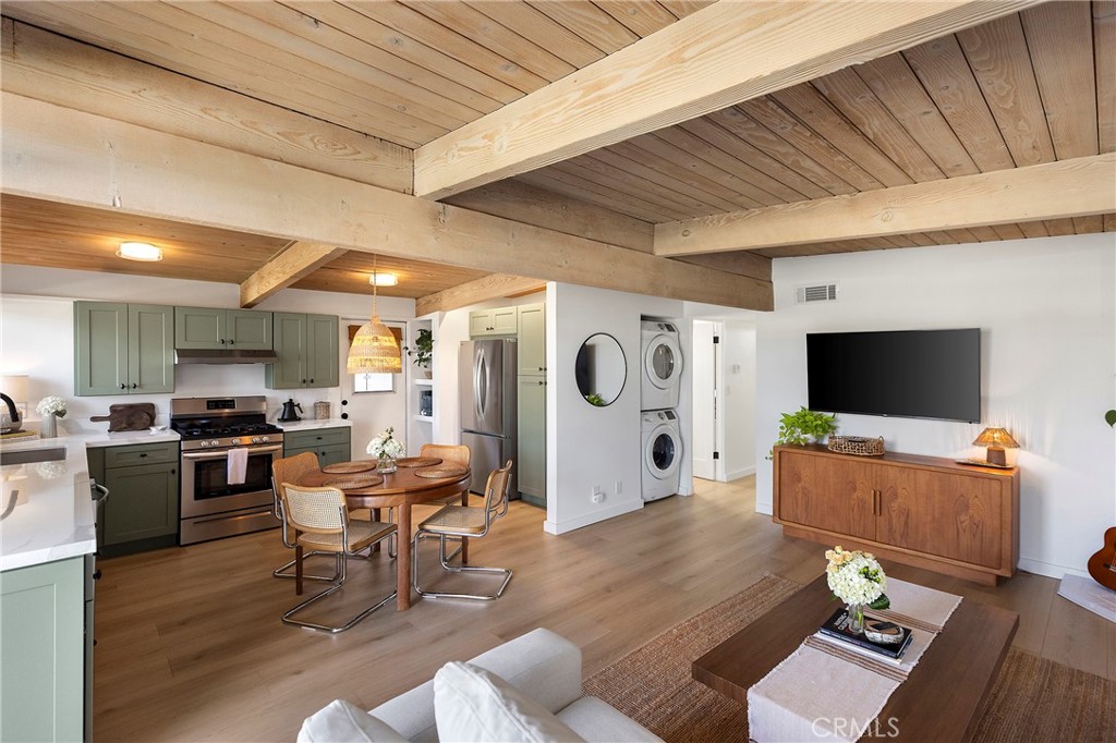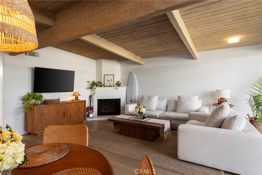 Ideally located near the beach in a dreamy mid-century enclave, this offering is absolutely stunning. Originally imagined in the early 1960s by renowned architect Chris Abel, these homes have been desired since. Upon arrival, an elevated & private patio welcomes you into this iconic single-level home with direct views of Saddleback mountain in the distance. Upon entry, it’s apparent this is one of the nicest options to ever come available in the community. Sandblasted ceilings lead you within the most beautiful great room. A unique & thoughtful approach to the floor plan centers the dining, offering a much more spacious family room. The use of different materials: painted block, wide-plank wood-like LVP flooring, agave-green shaker cabinetry, & large-scale windows including sleek upper gable windows for ample natural light, all create the most comfortable vibe inside. Newer stainless steel appliances, quartz counters, Walnut shelving, custom lighting, & fixtures and built-in storage all contribute to the upgraded appeal of the kitchen. A rare gas fireplace anchors the oversized family room finished in white brick, providing a cozy warmth throughout the entire open space. Two spacious bedrooms with vaulted ceilings, stylish draperies, newer carpet, ceiling fans, mirrored closet doors, & gable windows, both rooms offer the most relaxing place to wake up. The primary has a very private patio beyond accessed by sliding doors. This is another relaxing & sunny space to unwind outside. A newly-updated full bathroom with dual sinks, new vanity & fixtures with skylight services the home. Other newer values: central heater, water heater, solid-core shaker doors inside, casings & baseboards, stackable laundry, new paint & flooring throughout, one-car garage nearby + parking space, & its ideal location. Reminiscent of iconic mid-century Eichler-esk design, the neighborhood consists of 54 homes centered around a private solar-heated saltwater community pool & center. Very close to the ocean with nearby access to sandy beaches, a paved beach path runs north to south from SC to DP along the coast highway. Several restaurants, cafes, beautiful beaches and fun surf spots along the way, the SC Pier & beach trail, & easy access to the DP Harbor - currently undergoing a major renovation (value add for the entire area). This location offers an ideal central point to both cities. These mid-century homes within the Vista Del Gado are a special offering rarely available.