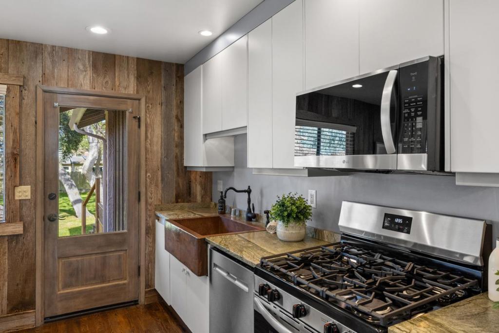 Rustic and urbane are not two words typically used together to characterize the mood of a place, but in the case of this single-level home in Pacific Grove, they fit perfectly. A wood-burning rock fireplace foretells intimate evenings spent in the glow of crackling flames, a book or glass of whisky in hand as you let yourself sink pleasurably into the tranquil stillness of night. Walk in the shadows of mature oak trees through your fenced yard, breathing in that cool, misty ocean air as you tune into the roar of the Pacific. Everything about life in Pacific Grove feels restorative to both intellect and spirit, as the promise of your next sunset stroll down Asilomar State Beach enlivens each day. And you're seconds down the street from the gate into Pebble Beach, where you can drive along iconic 17 Mile Drive, golf at MPCC, or walk the nature trails that wind through the forest. Back at home, each finish has a gorgeous, organic purity to it. Run your fingers along knotty, weathered gray wood panels. Or note how the light reflects off the earthy copper kitchen sink, shimmering against green stone countertops in shades of rich russet and bronze. With nearly 11,000 square feet of land, there is ample space for an ADU that mirrors the singular type of sophistication on display here.
