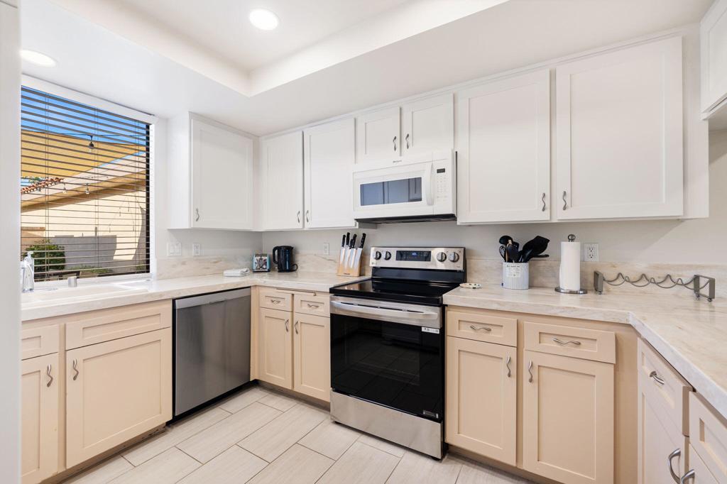SOUTH-facing and beautifully updated, this popular granada plan two-bedroom, two-bath condo is ideally positioned overlooking the lush green second fairway with sweeping VIEWS of the Santa Rosa mountains. Located within the highly desirable Sunrise Country Club, this spacious open-concept home offers privacy, comfort, and resort-style living.A private courtyard entry welcomes you with fresh paint and new furnishings, creating a warm and inviting first impression. Inside, the home has been thoughtfully upgraded with NEW flooring throughout, smooth ceilings following popcorn removal, and fresh interior PAINT for a clean, modern feel.The primary suite is a relaxing retreat featuring a stunning custom RENOVATED walk-in shower with elegant tile work and a built-in bench, along with a large private bath and walk-in closet. Both the living room and primary bedroom include sliding glass doors that open to the rear patio, perfect for entertaining or enjoying peaceful desert sunsets and golf course views.The kitchen has been updated with newer cabinetry and countertops and enhanced with new lighting, freshly painted ceilings and walls, and a new dishwasher. Additional improvements include a NEW washer and dryer, and freshly painted patio.The attached garage offers custom storage cabinetry and convenient laundry hookups. Ideally located near two community pools and a spa, this home is also just a short distance from the clubhouse.Sunrise country club is a 24-hour guard-gated community offering an 18-hole golf course, driving range, putting green, tennis and pickleball courts, bocce ball, 21 swimming pools, 19 spas, a fitness center, and multiple dining venues with beautiful fairway views. Centrally located in rancho mirage near the river complex, residents enjoy easy access to fine dining, shopping, and theaters.Come experience relaxed desert living at its best.