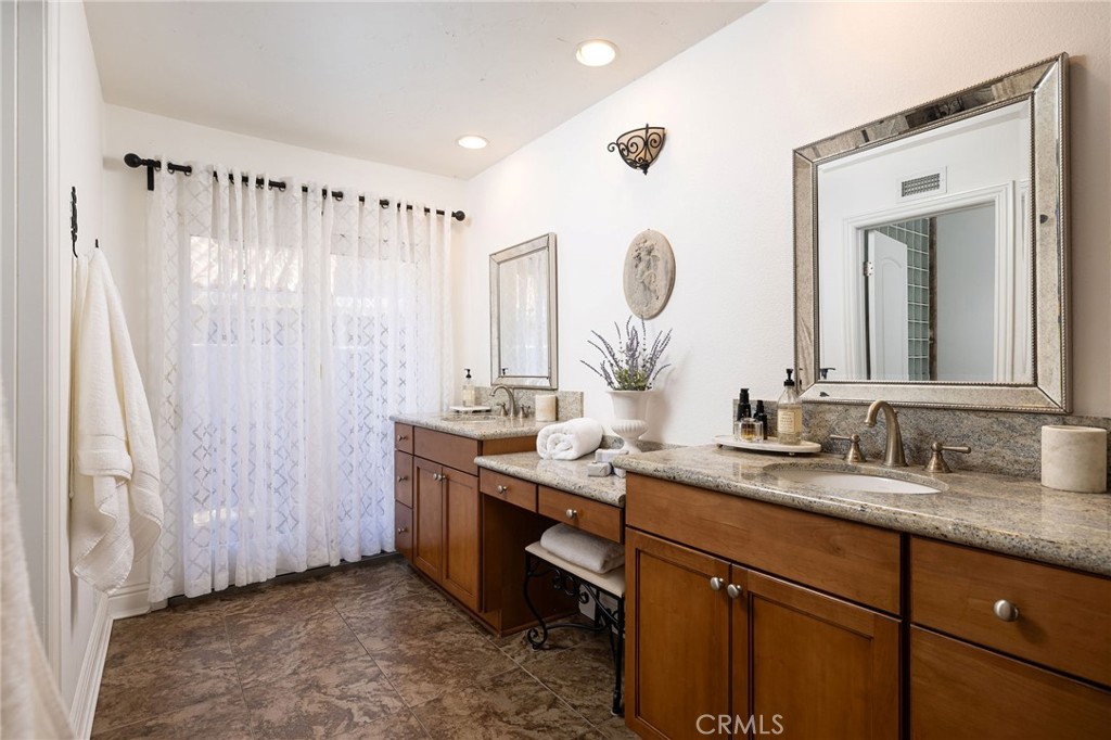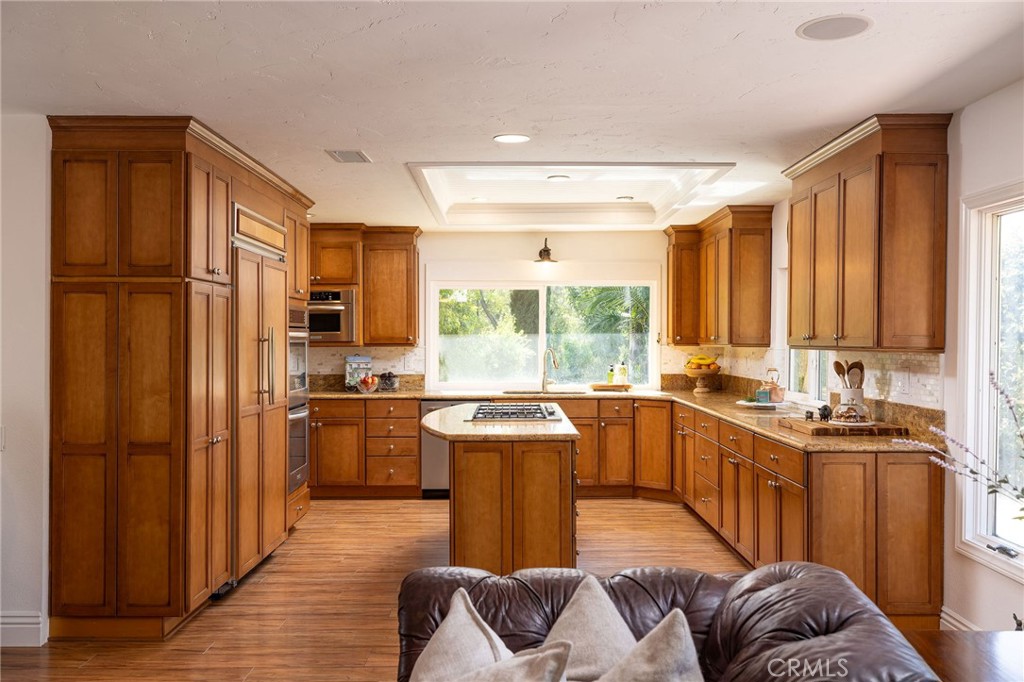Spanning over half an acre in desirable Nellie Gail Ranch, this single-level, equestrian property offers gracious interior living and outstanding outdoor amenities to create a true retreat. Welcome home to a private gated entry, lush landscaping, a three-car garage, and inviting curb appeal. Inside, dramatic beamed cathedral ceilings soar above the open-concept living and dining room, where French doors open to an idyllic covered patio and pool-sized lawn surrounded by tree-lined views. The heart of the home is a shared family room and kitchen, with a large brick fireplace and sliding glass doors for easy entertaining, natural light and outdoor living. The chef's kitchen is equipped with granite counters and center island with a breakfast bar, as well as Shaker-style cabinetry, a tile backsplash, and stainless-steel appliances. Retreat to the generous primary suite with a wall of mirrored closets and granite double-vanity bath, complete with walk-in shower. Three additional bedrooms and two more full baths provide comfortable accommodations for family, guests or office space. The updated laundry room adds a touch of style with tile flooring and white Shaker cabinetry. Step outside to discover your ideal equestrian setup with 2 designated stalls, 2 outs, and extra corral space. The home has been exceptionally-maintained with improvements including copper repiping, a newer water heater, epoxy flooring in the garage, and fresh exterior and interior paint. Your low monthly HOA fees cover roaming community security, trail maintenance, and membership to the swim, tennis, and pickleball club. The Nellie Gail clubhouse, bar/restaurant, 25 miles of trails, parks, and regular events create a tight-knit neighborhood lifestyle, all with convenient access to freeways, schooling, shopping, and beaches. Enjoy the best of ranch living with everything Southern California offers just minutes away!