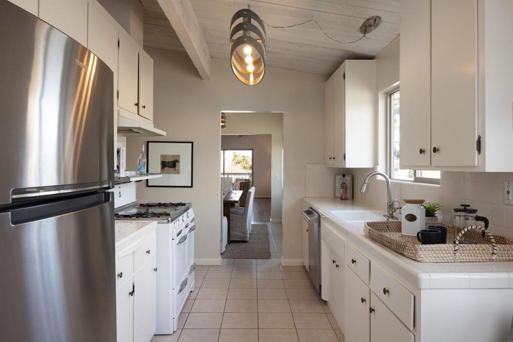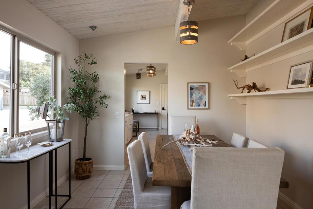This charming single-level residence is set in a desirable, centrally located Pacific Grove neighborhood, just minutes from downtown, local schools, and the coastline. The 1,378 square foot layout includes three bedrooms and two bathrooms arranged with an easy, natural flow. Wood-laminate flooring runs throughout the main living areas, while the living room is highlighted by vaulted, open-beam ceilings and a wood-burning fireplace with a gas starter. Recent updates include fresh interior paint, a remodeled hall bathroom, and a newer composition shingle roof. The 4,100 square foot lot features an oversized detached two-car garage with ample space for storage or a workshop, along with a backyard deck for outdoor enjoyment. This is a well-maintained home in a location that captures the best of Pacific Grove living.