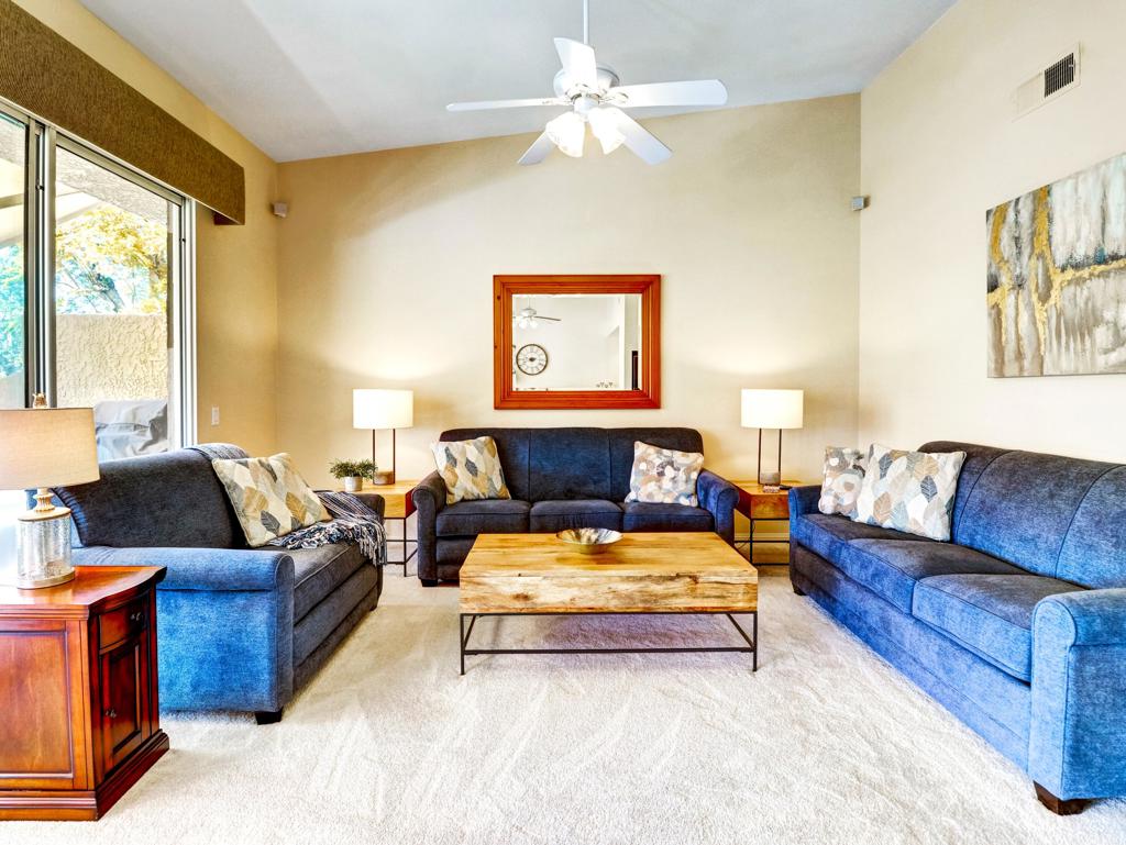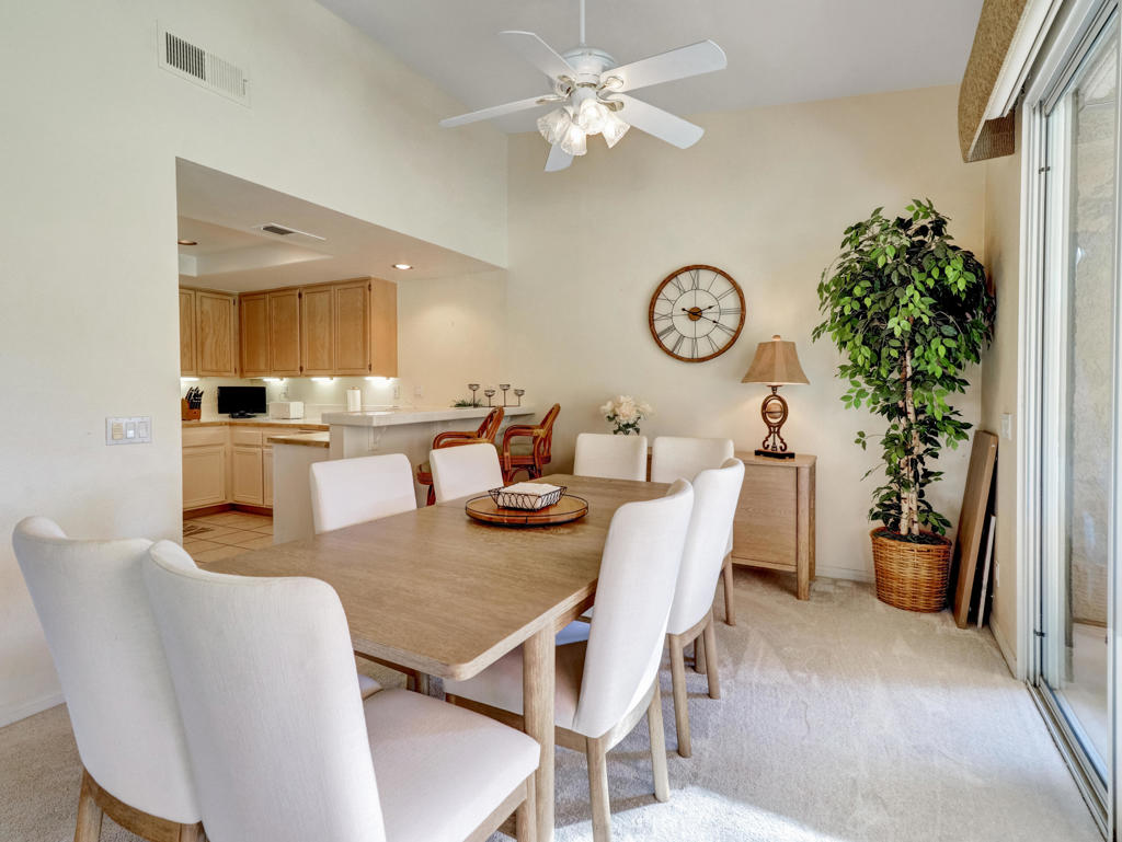 Great buy in PGA West that offers spectacular panoramic golf course and mountain views! Located on the 5th fairway and the ladies tee of the Jack Nicklaus Tournament course, you can enjoy beautiful desert sunsets from your living room or the balcony! Cute, comfy and move in ready with a new AC in 2025 and upgraded carpet. Two bedrooms and two bathrooms with remote control sun shades in the living room that allow the perfect amount of lighting! Also comes with an electric awning for that covers the patio balcony. There is a 2 car garage with lots of storage space and upgraded electrical access for charging your golf cart. This condo is only a short distance from the community pool and with these views would make a great weekend getaway or seasonal rental!