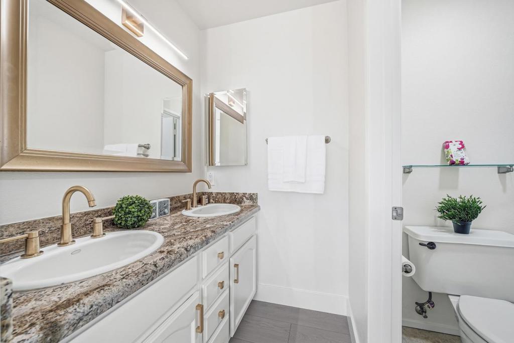 Beautifully maintained Silicon Valley townhouse located in the desirable Hamilton Place community. This light-filled 2-bedroom, 2.5-bath home offers a functional 1,224 sq ft layout with a welcoming living room featuring hardwood flooring, a cozy gas fireplace, and access to a private outdoor patio. The kitchen includes tile countertops, breakfast bar seating, dishwasher, gas oven/range, garbage disposal, and refrigerator. Both bedrooms are spacious suites with updated baths, including showers over tubs and a large primary with dual vanities. Additional highlights include in-garage laundry, double-pane windows, vinyl/linoleum flooring, and plenty of storage throughout. Attached side-by-side 2-car garage plus guest parking add convenience. Located in a quiet cul-de-sac adjacent to Los Gatos Creek Trail and minutes from downtown Campbell, Whole Foods, shops, dining, and entertainment. Easy commute with quick access to HWY 17, 85, 280, and San Tomas Expressway. Low HOA dues include exterior maintenance, management, common area electricity, landscaping, roof, fencing, and insurance. A wonderful blend of comfort, location, and value in one of Silicon Valleys best-established communities.