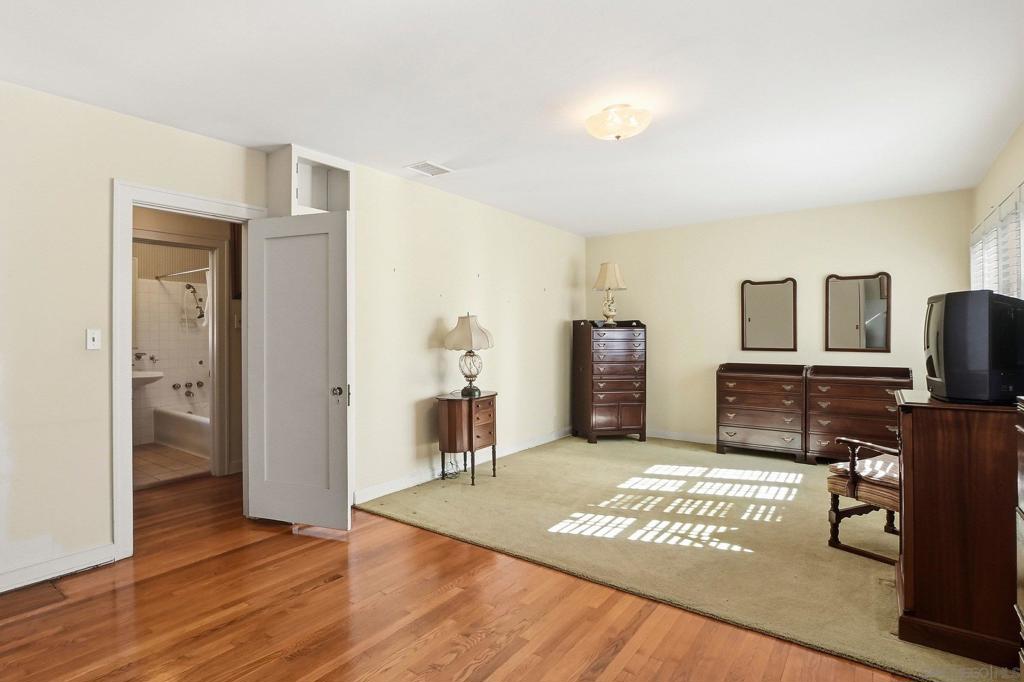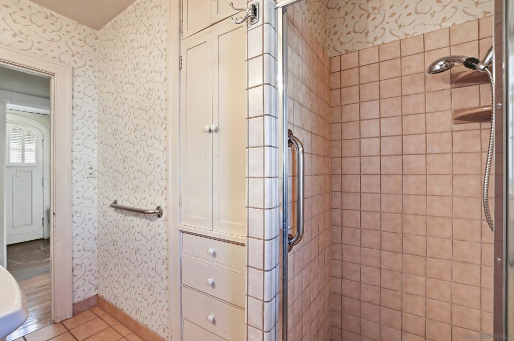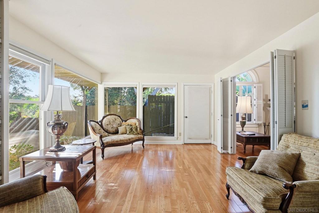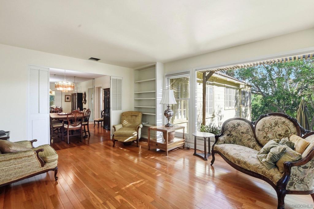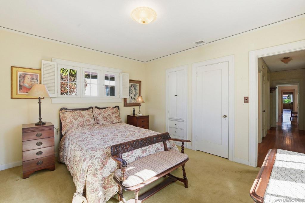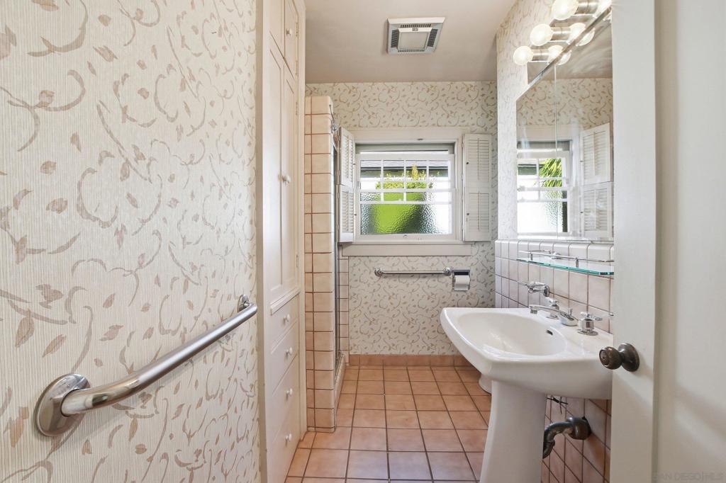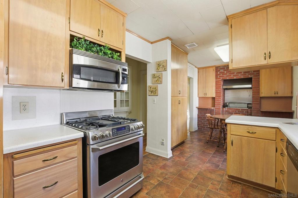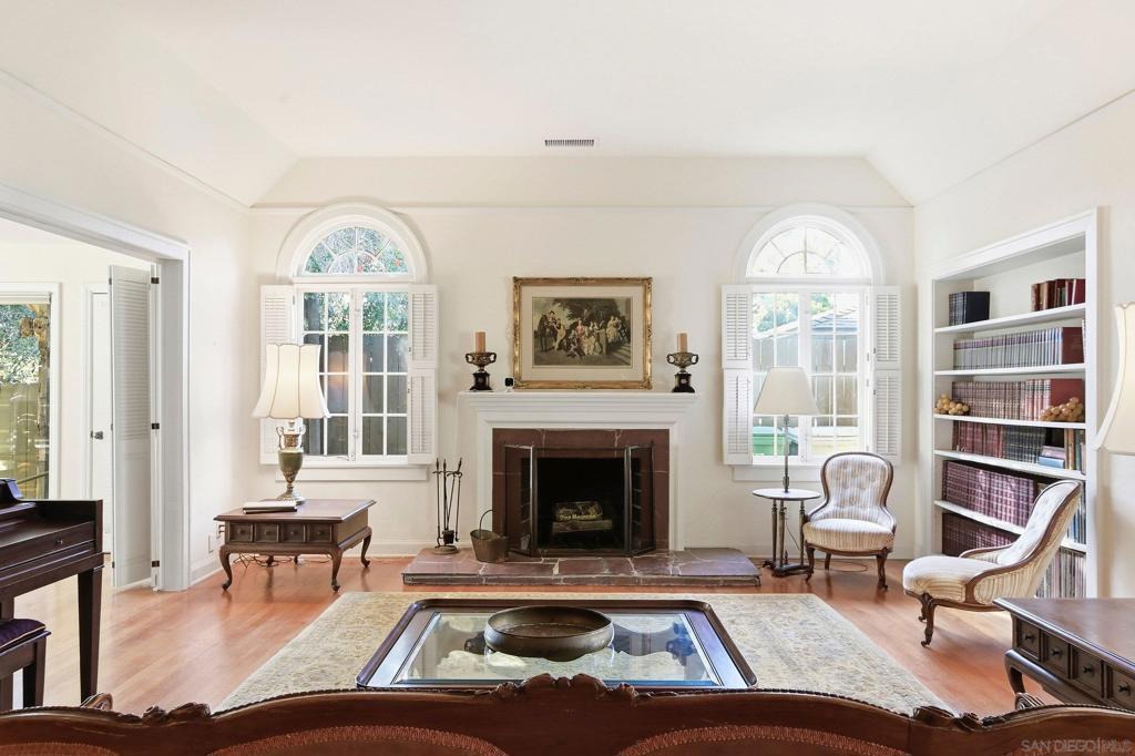 This spacious 2,048 sq. ft. Hillcrest residence offers a rare combination of architectural character and modern functionality. Situated on a quiet closed-end street, this 4-bedroom, 3-bathroom home provides exceptional privacy with immediate access to local dining and transit. Inside, the home showcases re-done wood floors and a living room centered around a brick fireplace and a unique rounded coffered ceiling. The kitchen is equipped for serious cooking with stainless steel appliances, a convection oven, a working built-in blender, and an indoor grill with a dedicated vent hood. The primary suite is complemented by a bright sitting area with wood plantation blinds. For added flexibility and seclusion, the lower-level bedroom features sliders that open directly to a back private patio. The property is protected by an owned, transferable security system with interior cameras. The lot footprint extends beyond the rear wood fence, and a detached garage provides additional built-in storage.