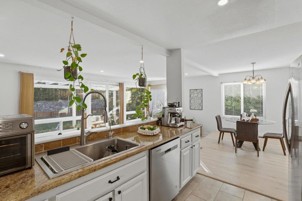 Tucked away on a quiet court at the base of the Santa Teresa Hills, this 4-bedroom, 2.5-bathroom home offers 2,386 sq ft of well-designed living space on a generous 6,900 sq ft lot. A two-story foyer sets the tone, leading into a living room anchored by a fireplace with mantel & flowing seamlessly into the dining area. The kitchen features granite countertops, a double oven, & opens to a second dining area while overlooking the spacious family room. A second fireplace & sliding doors connect to the backyard, complete with a pergola, views of the Santa Teresa Hills, & various fruit trees. The primary suite feels like a true retreat with glass French doors, ample space, crown molding, & two closets, including one with mirrored doors. The en suite bath offers dual sinks with new countertops & a walk-in shower. Two additional bedrooms include walk-in closets, while the fourth bedroom features a generously sized closet. New laminate flooring throughout & new carpet on the stairs are complemented by recessed lighting, dual-pane windows, & a water softener & filtration system. A three-car garage provides excellent storage & flexibility. Located near Highways 85 & Santa Teresa Boulevard, just minutes from grocery stores, shopping, & restaurants, & assigned to Santa Teresa High School.