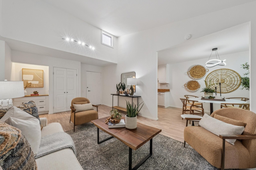 Welcome home to this beautifully updated third-floor end unit featuring vaulted ceilings and floor to ceiling windows for an abundance of natural light. As the largest 2-bedroom, 1-bath floor plan in the complex, this home offers an ideal blend of space, comfort, and style. New flooring throughout, brand-new carpet, fresh interior paint, and updated fixtures and hardware create a move-in-ready feel. The modern kitchen features stainless steel appliances, including a new refrigerator and dishwasher, plus a convenient pantry for extra storage. Just off the main living area, a charming reading nook provides the perfect space for a work-from-home setup or study area. Step outside to your private balcony and enjoy peaceful views of the surrounding redwoods. The community offers resort-style amenities, including multiple pools, a billiards room, and a fully equipped fitness center. Located just steps from vibrant downtown Walnut Creek, with easy access to major highways and top-rated schools, this home delivers exceptional convenience and lifestyle!