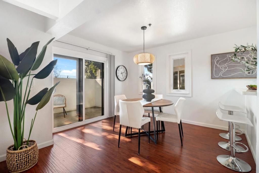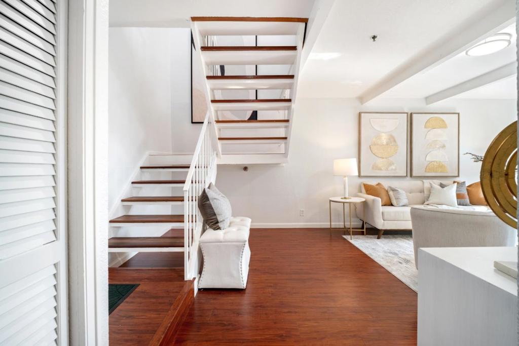 An updated townhome with vaulted ceilings, upgraded kitchen & baths, double-paned windows & a sun-filled enclosed room off the primary bed. Near top-rated Mountain View High, top tech campuses including Google, LinkedIn, Microsoft, Downtown Mountain View, Farmers Market, shopping, dining, parks. Inside, laminate flooring, fireplace & large sliding glass doors to a private patio. The kitchen features quartz countertop & stainless steel appliances: refrigerator, electric range, oven, built-in microwave, vent hood & dishwasher. Upstairs, bedrooms are spacious with high vaulted ceiling, the spacious primary bedroom features an sliding-door closet, windowed sitting area & an enclosed sun-filled space with floor-to-ceiling sliding glass panels and skylight. Bathrooms are upgraded & well appointed, with shaker-style vanities, designer tile finishes, tile flooring, frameless glass enclosures & modern lighting. One bathroom offers a spa-style shower panel system with rainfall showerhead, handheld wand, multiple body spray jets & built-in shower niche, while the other features skylights, a dual-sink vanity, wall-mounted showerhead, soaking tub, upgraded toilet with bidet seat & built-in open shelving. With easy access to Highways 82, 85, & 237, Caltrain & Light Rail stations.