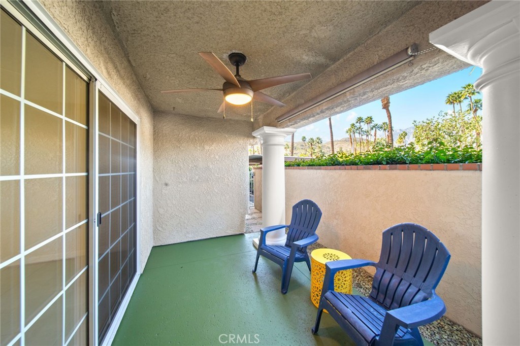 PRICE ADJUSTMENT! This renovated first floor 2BR/2BA unit in the gated Esprit community offers modernization in a prime South Palm Springs location. Features include new tile flooring, fresh paint, and designer lighting throughout the entire home. The main bedroom includes a large walk-in closet and a fully renovated bathroom with a new vanity, sink, and fixtures. The kitchen is outfitted with stainless steel appliances and a refrigerator with in-door filtered water/ice. The private patio has mountain and sunset views, and is equipped with a roll-down shade and lighted fan. Amenities: Steps away from 1 of 2 pools, 3 hot tubs, and lighted tennis/pickleball courts. Prime Access: Easy walk (1 block) to Trader Joe’s and Starbucks; minutes from the Goat Trail and the new CV Link bike path. This all-age boutique community is impeccably managed, has extremely low taxes and is ready for immediate enjoyment!
