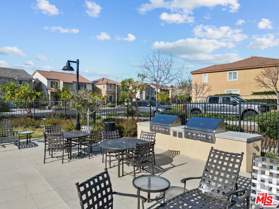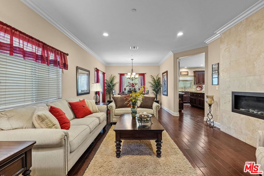 Welcome home to Living Smart Homes in Moorpark Highlands, located in one of Moorpark's most desirable master-planned communities. This charming two-story 4-bedroom, 2.5-bath home is surrounded by lush greens and beautiful mountain views. Step inside to a welcoming entry where high ceilings, crown molding, recessed lighting, rich wood floors, and natural sunlight set the tone. The space opens into an elegant formal living and dining area perfect for entertaining. The kitchen floor plan blends well to the family room, creating an ideal open-concept layout. The kitchen features rich cabinetry, granite countertops, custom tile backsplash, a large center island with bar seating, pendant lighting, stainless-steel appliances, and a modern touch-activated faucet for added convenience. The adjoining family room offers a comfortable gathering space with a sliding glass door to the backyard for effortless indoor-outdoor living. Additional features include direct access to the attached garage, central heating and air conditioning for year-round comfort, dual-pane windows for energy efficiency, ceiling fans and thoughtful finishes throughout. As you make your way upstairs, you arrive at a spacious landing. This versatile space connects all bedrooms, a full bathroom, and a large laundry room for added convenience. The primary suite serves as a private retreat, offering generous space, a walk-in closet, and an ensuite bathroom with dual vanities, a soaking tub, and a separate glass-enclosed shower, creating a spa-like atmosphere. Backyard highlights include stamped concrete, mature palms, a decorative water feature, an orange tree, and a built-in natural gas BBQ hookup for effortless outdoor entertaining. A side yard provides added versatility for pets or storage. The Moorpark Highlands community offers resort-style amenities including a pool, spa, scenic trails, and access to Mammoth Park, featuring 7.5 acres of play areas, multi-use fields, picnic spaces, and lighted tennis and sport courts. Conveniently located near shopping, dining, award-winning schools, and freeway access, this home is nestled in a highly desirable, family-friendly neighborhood.