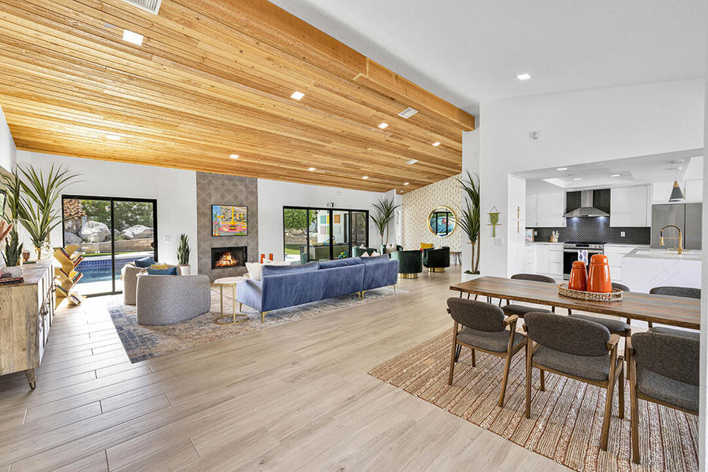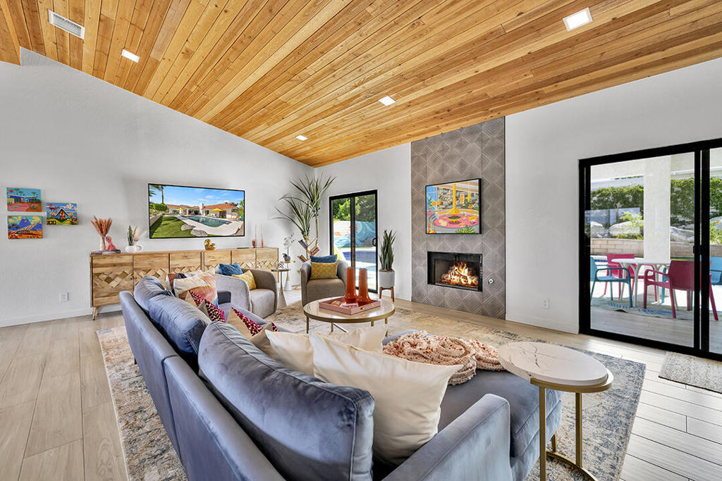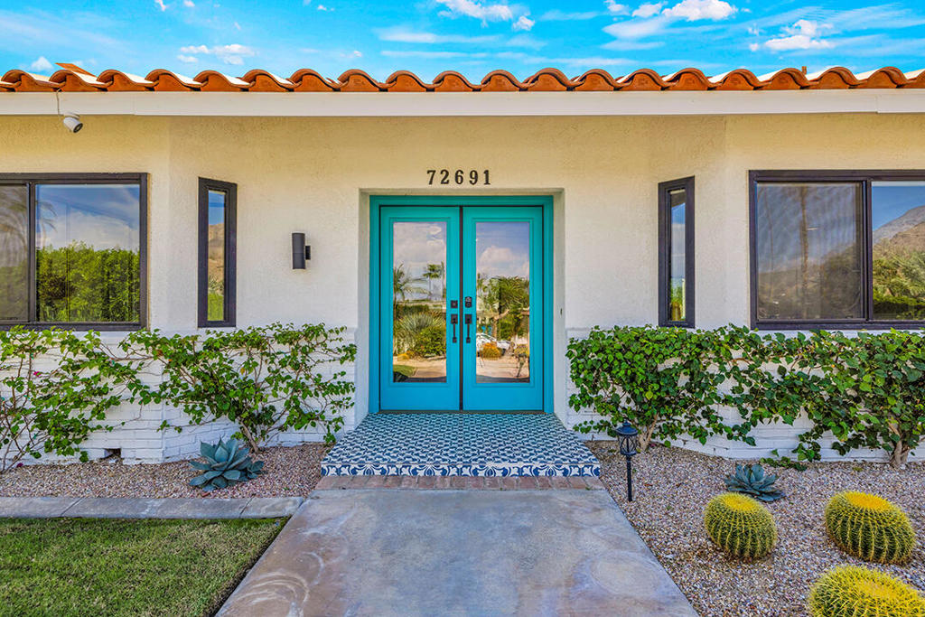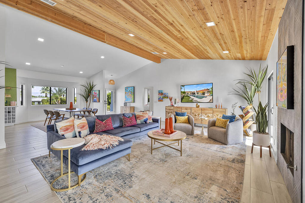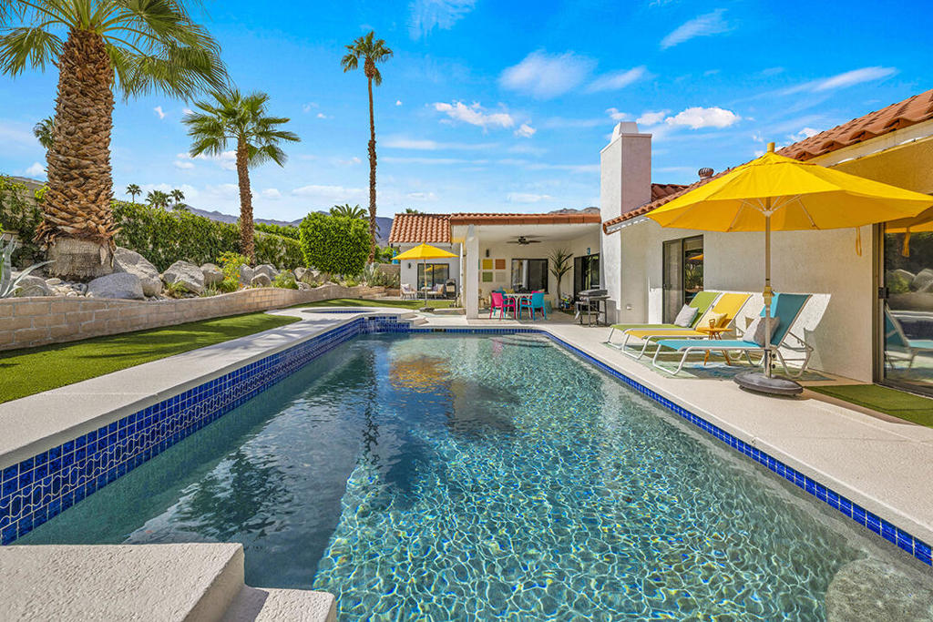 This fully furnished, professionally designed home in South Palm Desert offers modern style perfectly balanced for comfort with indoor-outdoor living. Extensively updated throughout, the open floor plan features vaulted ceilings, a spacious living room, a generous dining area, and a spectacularly renovated kitchen. Sliding doors from the living room open to a private backyard featuring lush landscaping, artificial turf, a beautiful hand-painted mural wall, and an immaculate saltwater pool with spa.Inside, entertaining is easy with the fully updated kitchen completed in 2023. Here you have quartz waterfall counters and striking tile backsplash, a dine-in prep island, and a sitting counter at the separation to the living room. Other features include a bar area, pantry, updated stainless steel appliance package, and sliding door access to the front patio.The expansive primary suite offers sliding doors to the backyard pool area and a spa-inspired bathroom with access to the large walk-in closet. Two additional bedrooms are located in the main house: one with backyard access near the full guest bath and a front bedroom with an ensuite bath. The fourth bedroom is part of a private attached guest house, complete with its own bathroom, full kitchen, and sitting and dining areas. This space has backyard access with separate patio, a dedicated washer and dryer, and dual ductless mini-split A/C systems, providing privacy for guests or the possibility for rental, or caretaker's quarters.Just minutes from El Paseo's premier shopping and dining, along with being sold furnished, this home is ready for you to purchase and enjoy immediately.