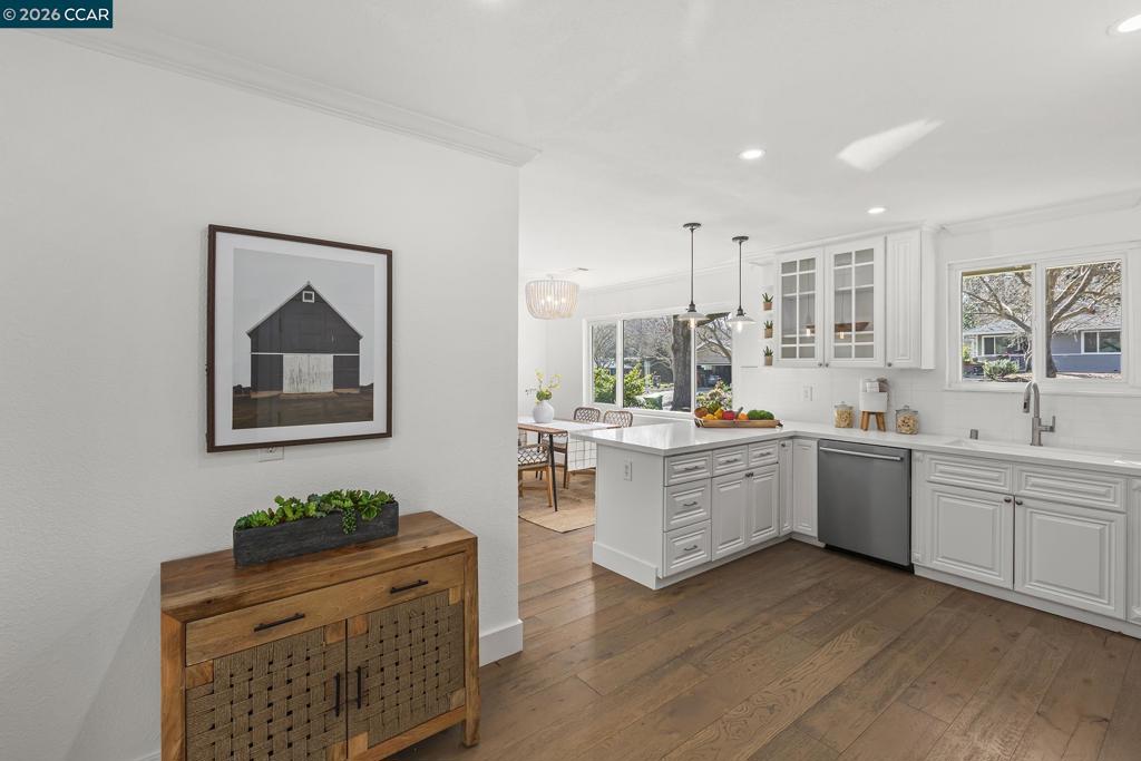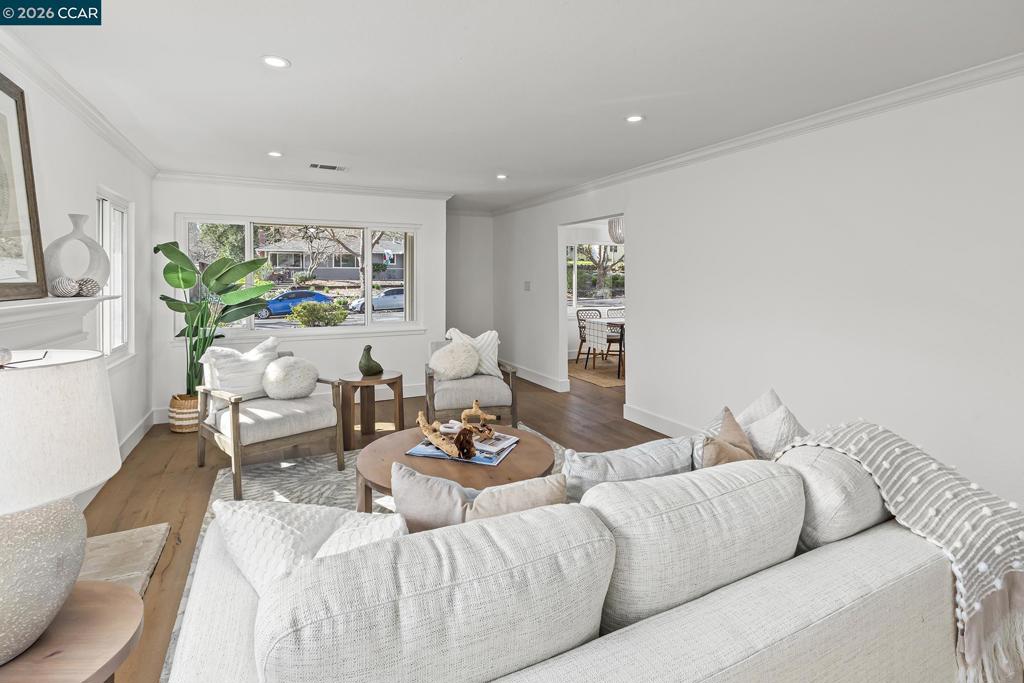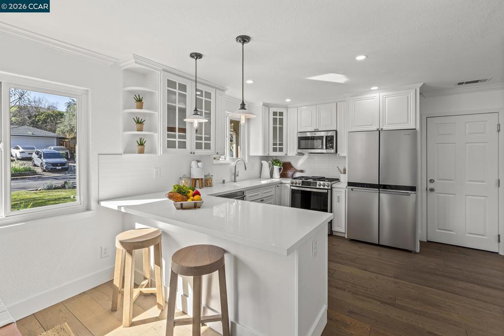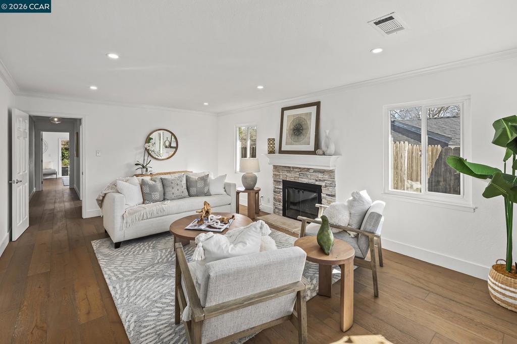 Just steps from the popular Lafayette/Moraga Trail, this updated single-story home on a flat lot offers a perfect blend of charm and modern convenience. The interior features four bedrooms, two bathrooms, with stylish, wide-plank oak hardwood floors throughout. The centerpiece of the home is the updated kitchen, which features quartz countertops and stainless appliances and it opens directly to the dining room and backyard for a perfect entertaining flow. The living room is light and bright with ample windows and a fireplace anchoring the space. The spacious primary bedroom is as much retreat as it is bedroom with dual closets and private access to the backyard patio and hot tub, while the ensuite bath impresses with a double vanity and oversized shower. Outside, the level backyard is built for year-round fun with a built-in BBQ, two spacious patios, gardens, and a lush lawn. Lafayette Estates is coveted for its serene, tree-lined streets and close proximity to the Lafayette Community Center, Lafayette Community Park fields and playground, and top-rated Burton Valley Elementary.