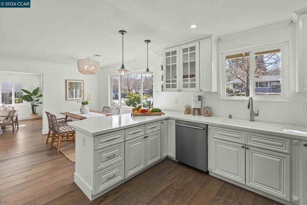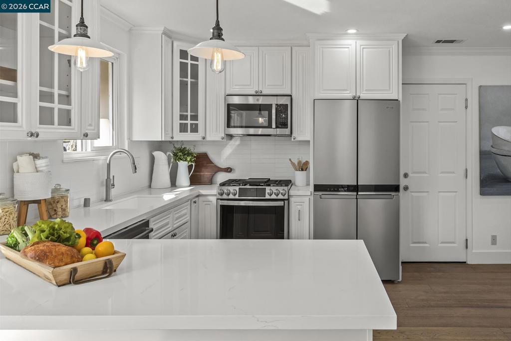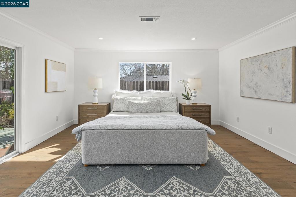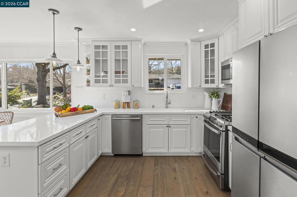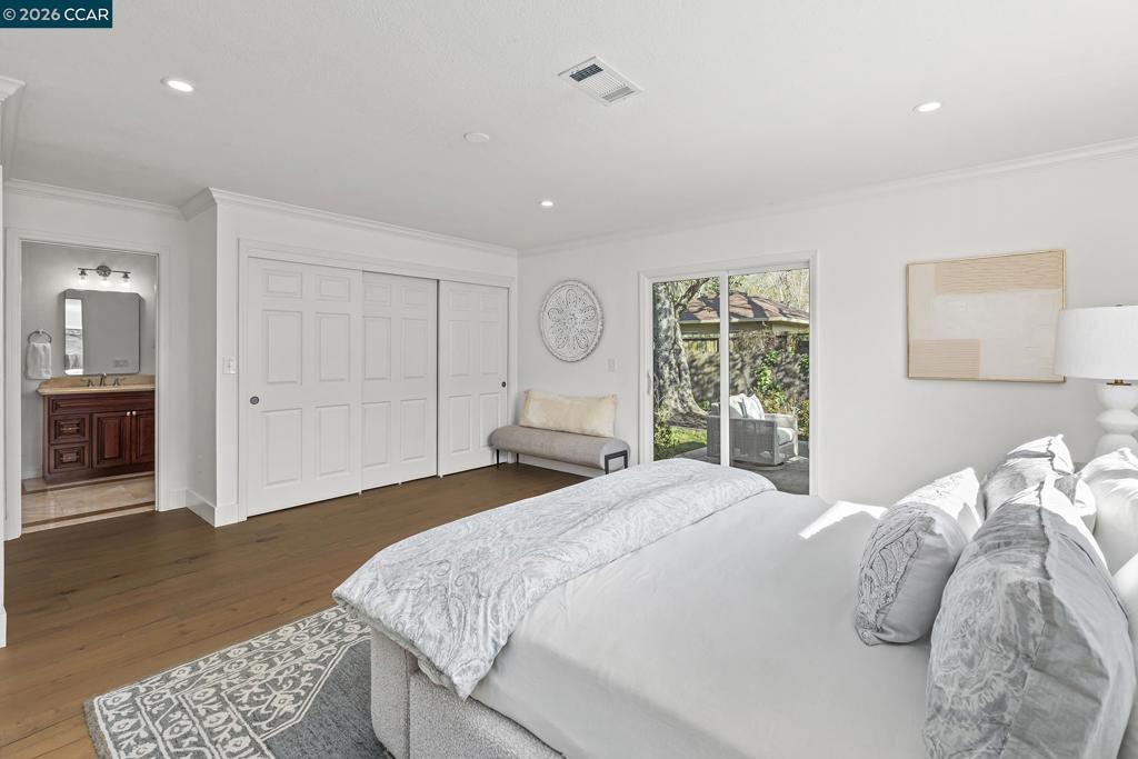 Just steps from the popular Lafayette/Moraga Trail, this updated single-story home on a flat lot offers a perfect blend of charm and modern convenience. The interior features four bedrooms, two bathrooms, with stylish, wide-plank oak hardwood floors throughout. The centerpiece of the home is the updated kitchen, which features quartz countertops and stainless appliances and it opens directly to the dining room and backyard for a perfect entertaining flow. The living room is light and bright with ample windows and a fireplace anchoring the space. The spacious primary bedroom is as much retreat as it is bedroom with dual closets and private access to the backyard patio and hot tub, while the ensuite bath impresses with a double vanity and oversized shower. Outside, the level backyard is built for year-round fun with a built-in BBQ, two spacious patios, gardens, and a lush lawn. Lafayette Estates is coveted for its serene, tree-lined streets and close proximity to the Lafayette Community Center, Lafayette Community Park fields and playground, and top-rated Burton Valley Elementary.