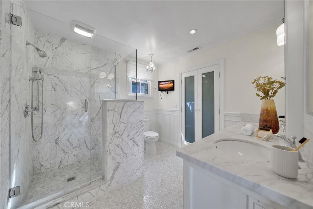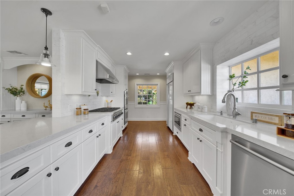 Gorgeous 4-bedroom, 3-bath home set on nearly half an acre, showcasing sparkling city lights and mountain views. Designed around an open-concept great room, the layout flows seamlessly between the kitchen, dining area, family room with fireplace, wet bar, and recreation space — all opening to inviting outdoor living areas. The backyard is ideal for entertaining, featuring a spacious patio with a built-in barbecue and stainless storage, outdoor fireplace, fire pit, and multiple gathering areas. The well-proportioned primary suite offers a marble-accented bath and a highly functional walk-in closet. A dedicated office with custom built-ins provides an excellent work-from-home setup, all bedrooms are generously sized. Wide-plank hardwood flooring runs throughout the home, complemented by abundant storage, including a stand-up attic area. The finished two-car garage features epoxy flooring for a clean, polished look. The expansive grounds include a large lawn, paver sport court, and a relaxing jacuzzi — the perfect spot to unwind while taking in the city lights.