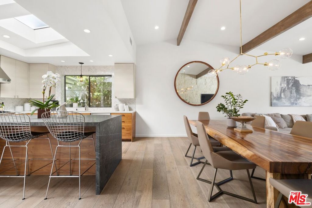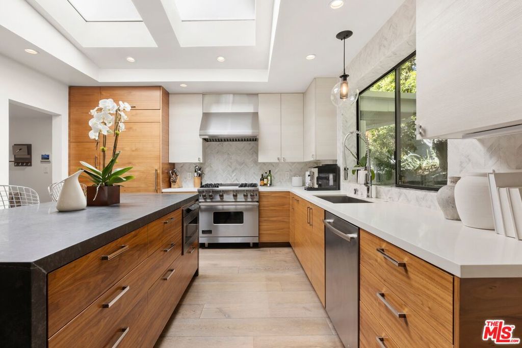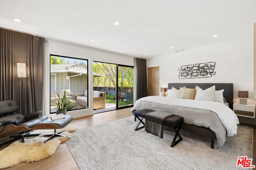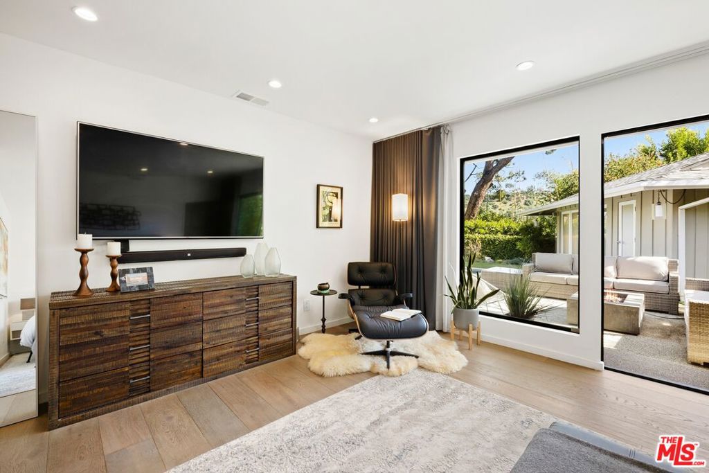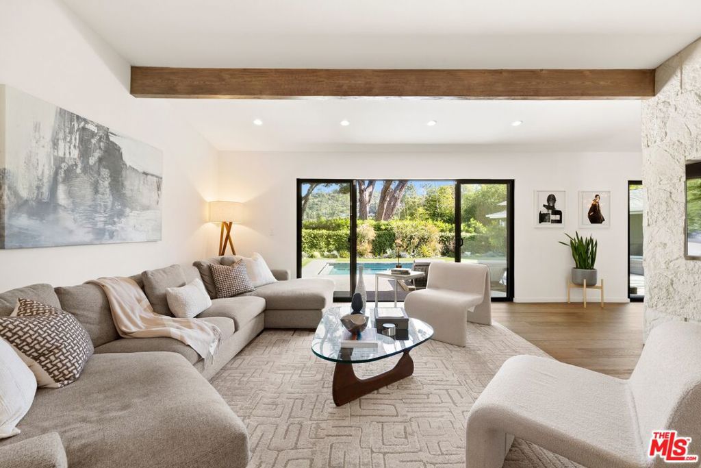 Originally built in the mid-century era, this remodeled Studio City home delivers a sharp, current take on classic California modernism. Set on a corner lot in the coveted Dona streets, the property sits minutes from Laurel Canyon's creative core, major film and television studios, and the dining, shopping, and nightlife along Ventura Boulevard and the Sunset Strip. The single-level 4BR/4BA floor plan is open and architectural, highlighted by 12-foot vaulted ceilings, strong sightlines, and walls of glass that pull in canyon light. The living room and great room are anchored by a gas fireplace wrapped in Getty stone with custom walnut shelving, creating a natural focal point for everyday living and entertaining. Sliding glass doors open directly to the outdoors, blurring the line between interior spaces and the serene setting beyond. The kitchen blends mid-century warmth with modern performance, featuring custom walnut cabinetry, a Viking range, generous pantry storage, and a leathered granite island with seating. A dedicated laundry and mud room connects to a two-car garage equipped with a workbench, sink, beverage refrigerator, and storage. The primary suite offers privacy and calm with a spa-style bath that includes an oversized dual shower, round soaking tub, and direct access to the pool and spa. The backyard is designed for effortless entertaining with a built-in outdoor kitchen, a rectilinear pool with spa, and a pool house/flex space with a fifth bathroom. Additional features include a Control4 smart home system, solar panels, EV charging, Tesla battery, and drive-up off-street parking.