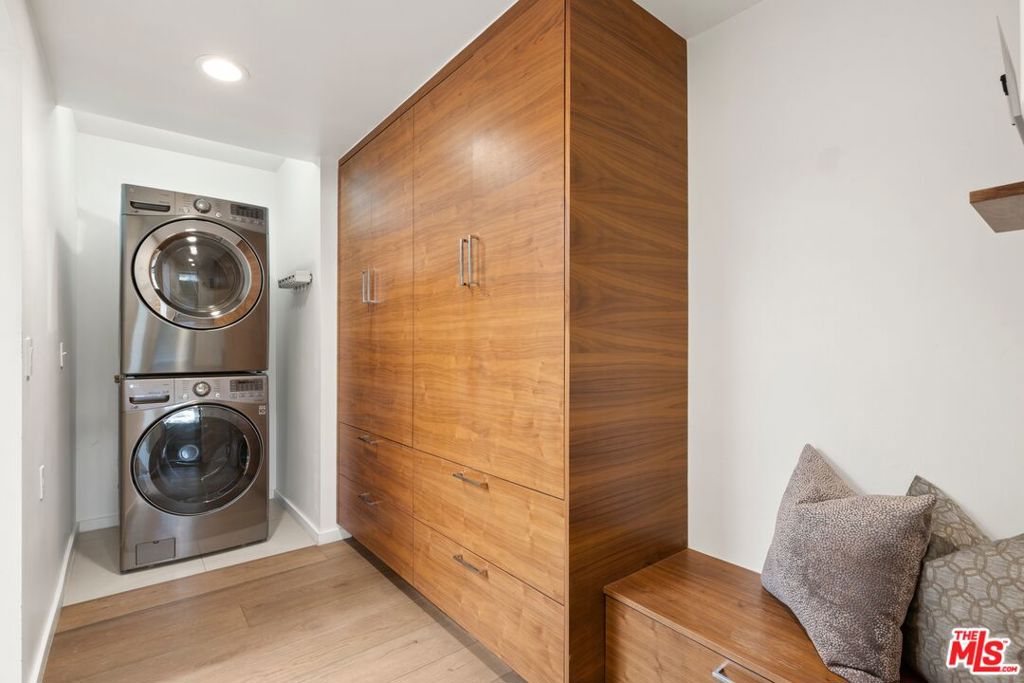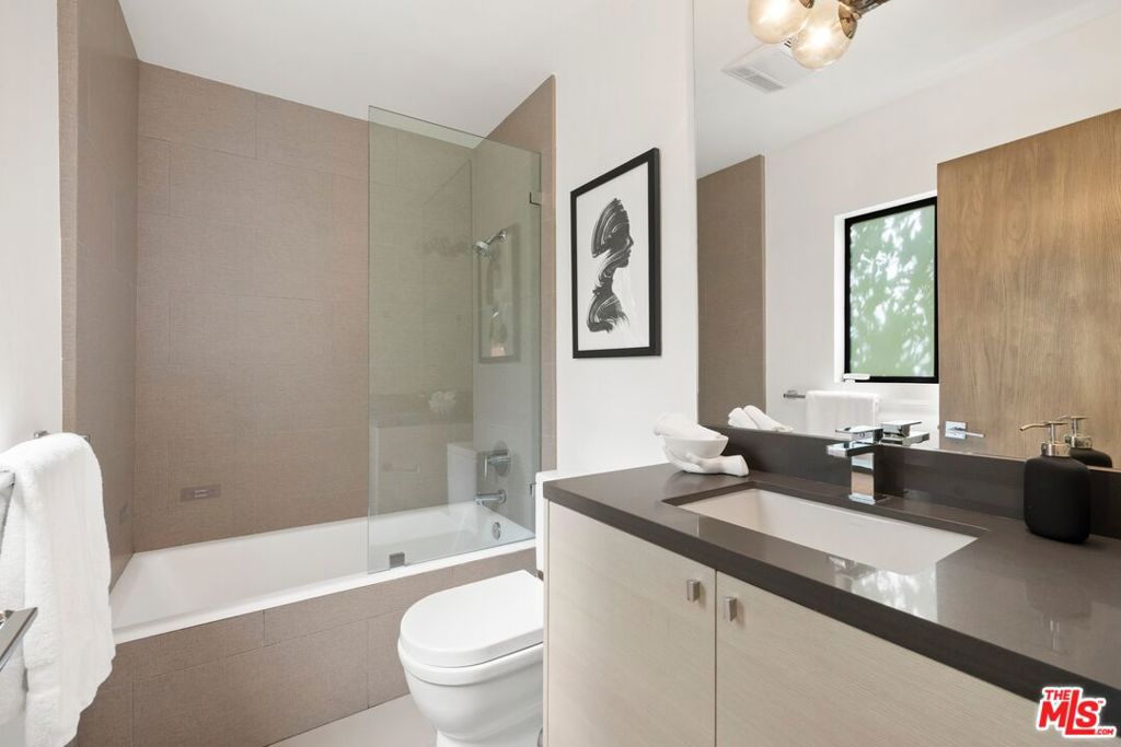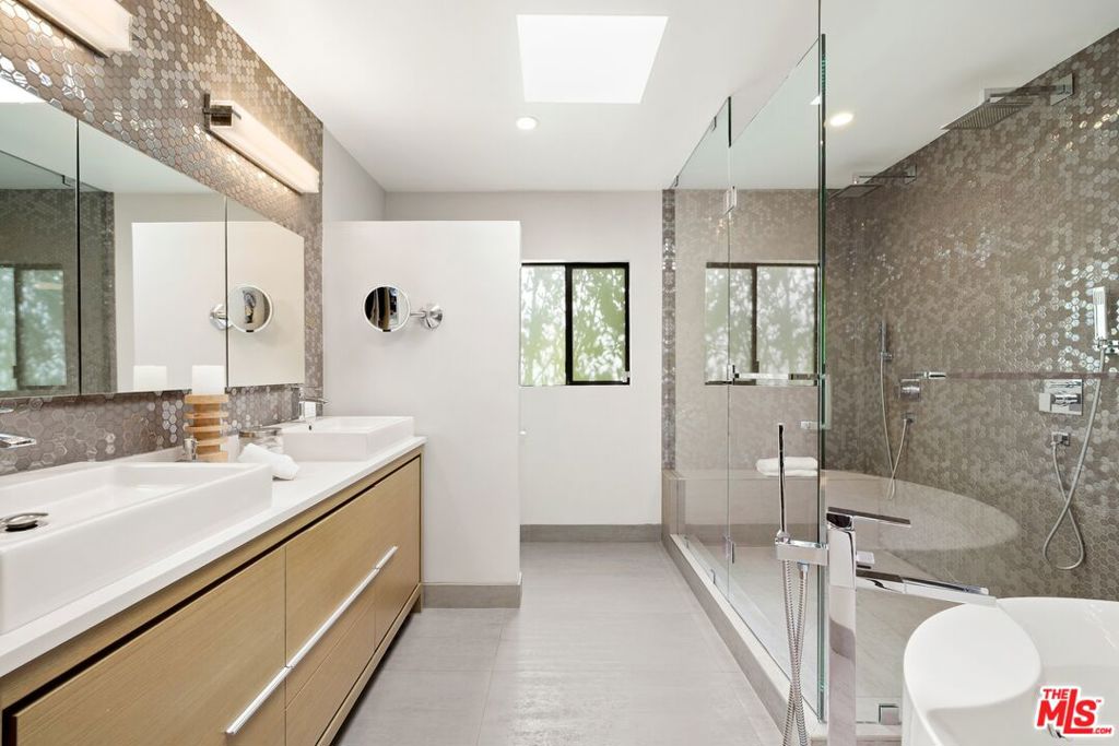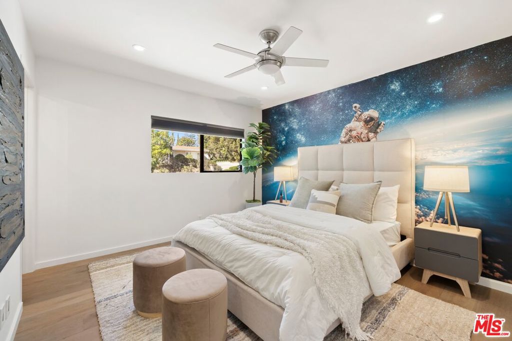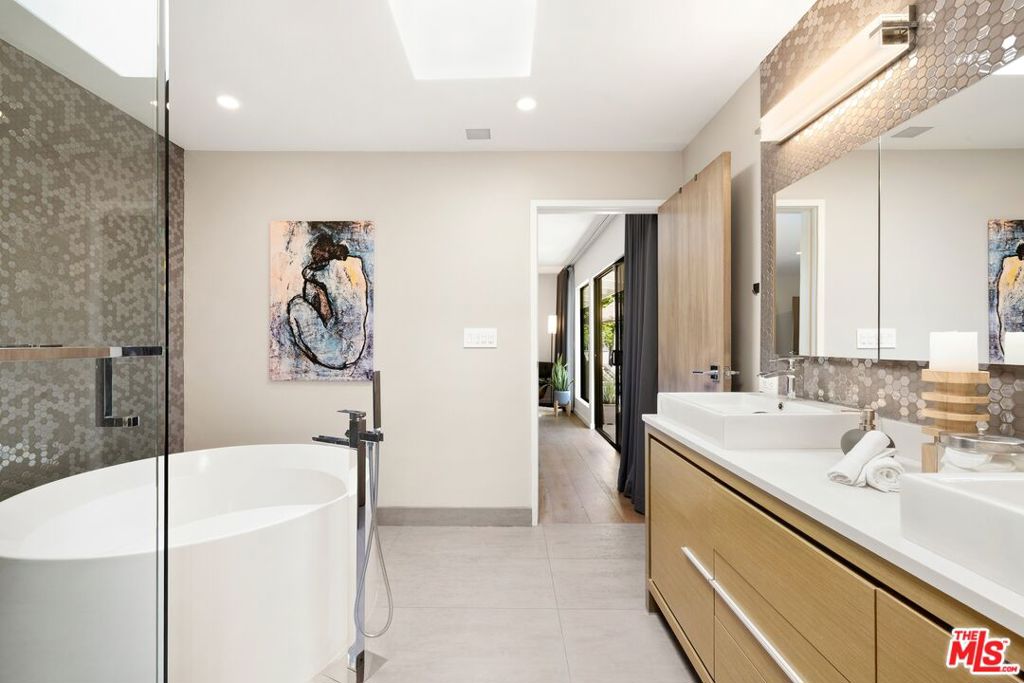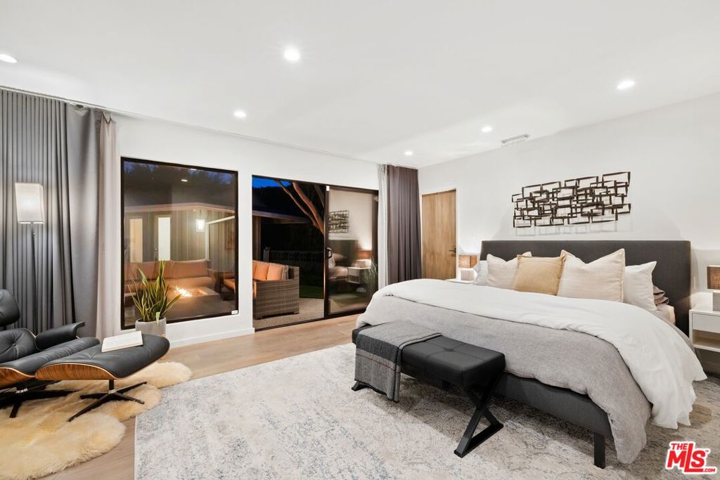 Originally built in the mid-century era, this remodeled Studio City home delivers a sharp, current take on classic California modernism. Set on a corner lot in the coveted Dona streets, the property sits minutes from Laurel Canyon's creative core, major film and television studios, and the dining, shopping, and nightlife along Ventura Boulevard and the Sunset Strip. The single-level 4BR/4BA floor plan is open and architectural, highlighted by 12-foot vaulted ceilings, strong sightlines, and walls of glass that pull in canyon light. The living room and great room are anchored by a gas fireplace wrapped in Getty stone with custom walnut shelving, creating a natural focal point for everyday living and entertaining. Sliding glass doors open directly to the outdoors, blurring the line between interior spaces and the serene setting beyond. The kitchen blends mid-century warmth with modern performance, featuring custom walnut cabinetry, a Viking range, generous pantry storage, and a leathered granite island with seating. A dedicated laundry and mud room connects to a two-car garage equipped with a workbench, sink, beverage refrigerator, and storage. The primary suite offers privacy and calm with a spa-style bath that includes an oversized dual shower, round soaking tub, and direct access to the pool and spa. The backyard is designed for effortless entertaining with a built-in outdoor kitchen, a rectilinear pool with spa, and a pool house/flex space with a fifth bathroom. Additional features include a Control4 smart home system, solar panels, EV charging, Tesla battery, and drive-up off-street parking.