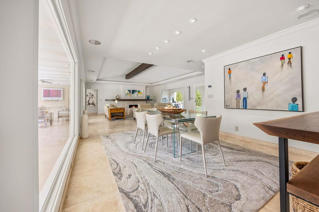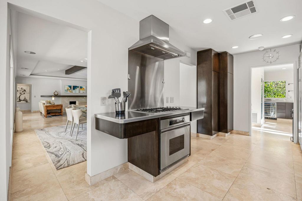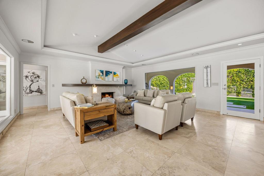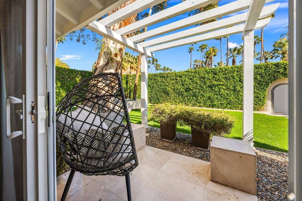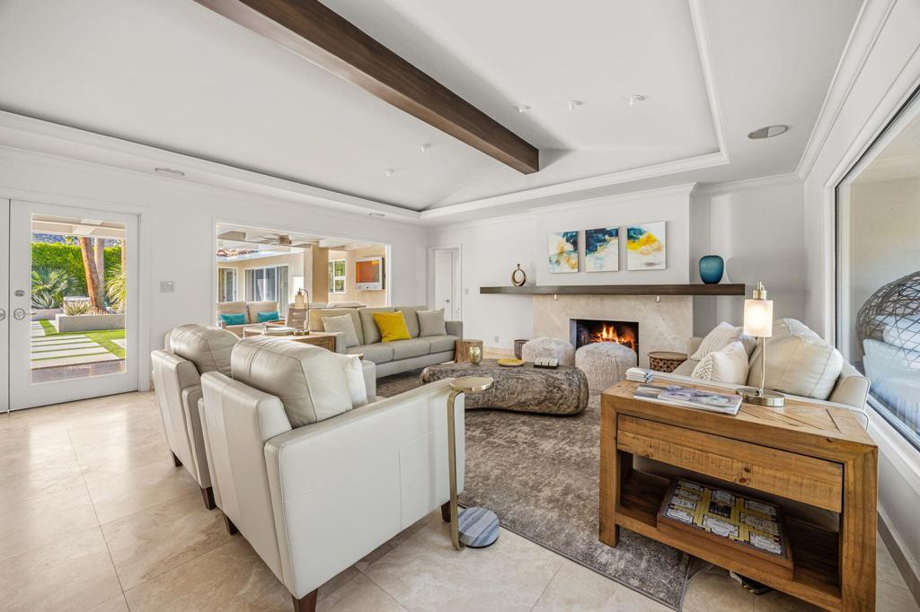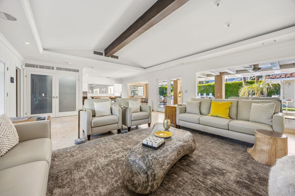 Set behind private gates on a coveted corner lot in Old Las Palmas, 1255 Camino Mirasol is a rare contemporary estate once owned by Claudette Colbert, offering sweeping mountain views and exceptional privacy. Thoughtfully remodeled, the home blends refined design with effortless indoor outdoor living, featuring travertine flooring throughout the interior and exterior and expansive windows and doors that fill the home with natural light. The residence includes four ensuite bedrooms and four and a half baths, highlighted by a serene primary suite with an attached office or library, a spacious walk in closet, and a well appointed bath featuring an outdoor shower and tranquil water feature. A guest bedroom with an attached gym offers dramatic walls of glass and an open outdoor inspired feel, paired with a complete spa bath featuring a steam shower, deep soaking tub, and waterfall shower creating a true private retreat. A dedicated media and theater room is complemented by Bang and Olufsen surround sound throughout the home, delivering an immersive entertainment experience both indoors and out. The kitchen is designed for both serious cooking and entertaining, featuring brand new cabinetry, stainless steel countertops, and a generously sized butler pantry that functions as a full prep kitchen ideal for catering with matching stainless counters, ice machine, wine refrigerator, and built in beer keg. A temperature controlled wine fridge is also located in the finished garage, which includes epoxy flooring, a Tesla car charger, and a dedicated mini split air conditioning system. Outdoor spaces are framed by a lush ficus hedge and sweeping mountain views, creating a private setting ideal for relaxation and entertaining with an outdoor television, firepit, Fire Magic grill, multiple seating areas, soothing water features, and mature citrus trees producing lemon, lime, pink grapefruit, and white grapefruit. This is a sophisticated and private desert retreat offering historic provenance, modern luxury, and exceptional attention to detail.