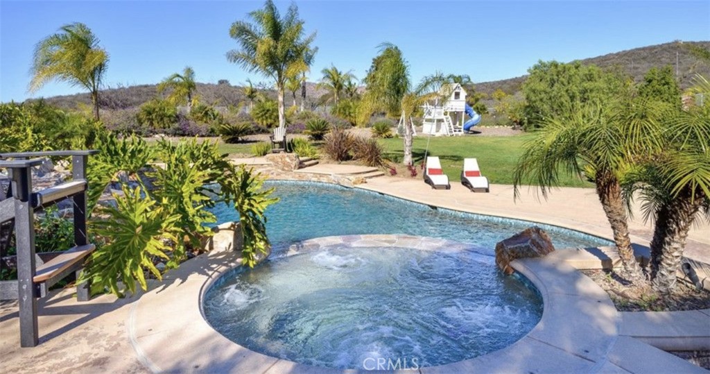 A rare opportunity to own one of the largest and most private estates in Dos Vientos Ranch. Located behind the gates of prestigious La Serena Estates, this exceptional single-story Spanish residence sits on approximately 7.5 acres of irreplaceable land, offering sweeping mountain and canyon views, unmatched privacy, and true resort-style living. A dramatic 600-foot private driveway creates a grand sense of arrival and leads to a beautifully designed estate featuring six bedrooms, five bathrooms, a three-car garage, and extensive guest parking. A new state-of-the-art solar system enhances efficiency while complementing the home’s luxury profile. Inside, soaring ceilings, refined architectural details, and expansive windows fill the home with natural light and frame stunning views. The chef’s kitchen showcases a large center island, quartz countertops, custom cabinetry, walk-in pantry, and premium appliances, flowing seamlessly into a spacious family room ideal for both intimate gatherings and large-scale entertaining. The primary suite is a private retreat with a fireplace, custom walk-in closet, and spa-inspired bath. Outdoors, the grounds rival a private resort. Amenities include a saltwater pool with cascading water slide and raised spa, fire pit, built-in BBQ, sports court, in-ground trampoline, zip line, half-pipe skateboard ramp, and multiple scenic seating areas designed for entertaining and recreation. With significant usable acreage, the property offers exceptional future potential to add a guest house, tennis court, expanded garage facilities, or further enhancements to the main residence—a critical value driver in luxury real estate where land scarcity defines long-term appreciation. Ideally located near State and National Parks, award-winning Sycamore Canyon School (K-8), premier hiking, biking, and equestrian trails, and minutes from upscale shopping and dining, this estate delivers a rare balance of privacy, convenience, and prestige. An extraordinary offering of land, lifestyle, and long-term value in one of Southern California’s most coveted gated communities.