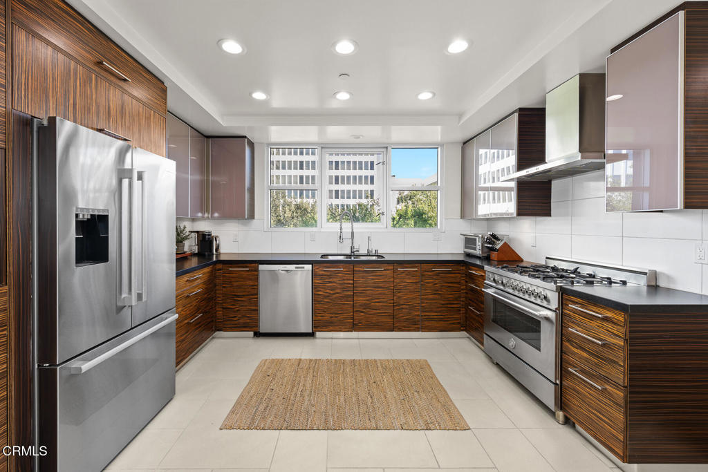 Inspired by Bauhaus architecture, Hudson Terrace is a modern luxury penthouse built in 2009 in Pasadena's vibrant South Lake Avenue District. Ideally positioned across from the Pasarroyo Business Complex and 1 block from dining, shopping, and fitness--including Trader Joe's, Erewhon, Macy's, and LA Fitness--this front‑facing penthouse offers exceptional urban convenience in one of the city's most desirable neighborhoods. The exterior features a Trespa Meteon rain shield system, ivory brick and stucco detailing, sandblasted glass balcony railings, and expansive floor‑to‑ceiling windows that fill the home with natural light. Spanning three levels with no common walls, the residence provides loft‑like living experience. The dramatic living room showcases resurfaced hardwood floors, a precast stone corner fireplace, French Deco capiz shell sconces, custom Hunter Douglas roller blinds, and floor‑to‑ceiling dual‑paned glass doors opening to a balcony overlooking oak‑lined Hudson Ave. Updated electrical circuitry and Lutron Caseta dimmer‑controlled recessed lighting enhance the modern ambiance. An elegant guest bath with marble counters and intricate tilework completes the main level. The gourmet kitchen features sleek Italian‑designed cabinetry, honed black granite countertops, a Bertazzoni gas range and hood, Bosch stainless steel appliances, filtered water at both sink & refrigerator, a walk‑in storage room, utility closet, and a dedicated balcony with stainless FireCraft smoker grill. The primary suite offers vaulted ceilings, remote‑controlled roller shades, a craftsman wood ceiling fan, a gas fireplace, and a custom Dall'Agnese walk‑in closet. The spa bath includes a 6 jet soaking tub, floor‑to‑ceiling glass shower, double Duravit sinks with Kohler polished nickel fixtures, and imported stone. A second bedroom with a mirrored wall functions as a guest room, gym, or office, with an adjacent bath featuring a spacious travertine and mosaic steam shower. A private rooftop terrace crowns the penthouse, offering sweeping city & mountain views. Additional highlights include 4 balconies, 2 side‑by‑side parking spaces near the elevator and storage room. Upgrades: Nest climate control, Lutron Caseta lighting, Hunter Douglas blinds, Restoration Hardware lighting, Bosch refrigerator, LG ThinQ washer/dryer. This pristine residence is moments from Pasadena's iconic: Caltech, ArtCenter, Langham, Huntington Library, Norton Simon, Old Town, Playhouse & Rose Bowl.