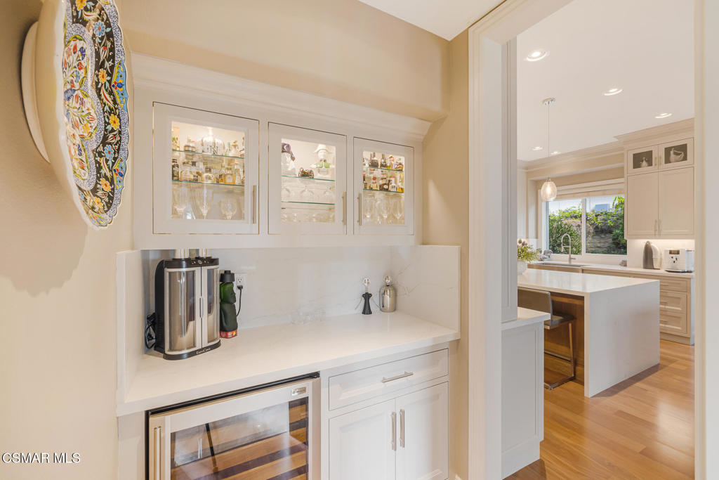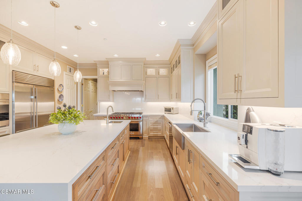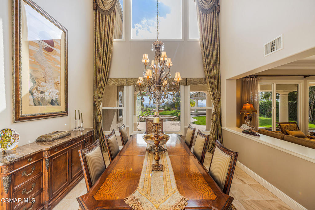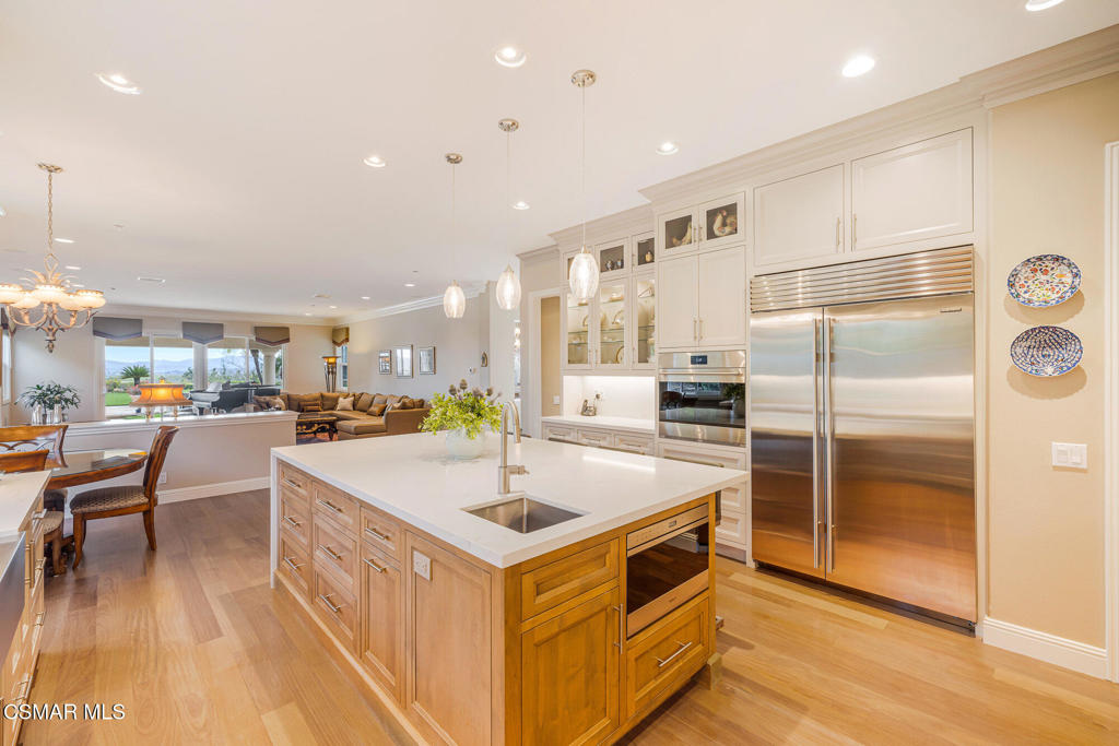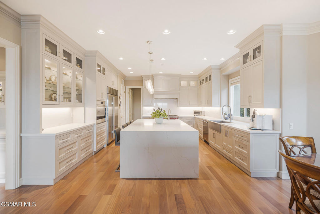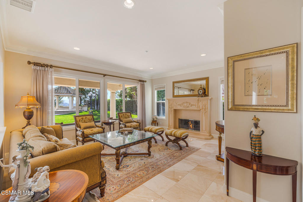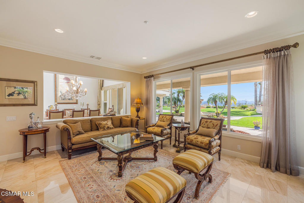 A Crown Jewel in Moorpark's Prestigious Country Club Estates. Set on a premium half-acre view lot within Moorpark's coveted Country Club Estates golf course community, this extraordinary estate is a rare offering where timeless elegance meets uncompromising luxury. With verdant views stretching both front and back, the setting feels private, peaceful, and truly exceptional.From the expansive motor court, a grand double door entry welcomes you into a residence where no expense was spared and every detail was thoughtfully curated. The highly sought after Santa Barbara floorplan spans 5,164 square feet of refined living, featuring a full bedroom and bath on the main level along with a private office, ideal for today's lifestyle.Palatial interiors unfold with dramatic impact. A soaring two story dining room is framed by raw silk drapery and a statement chandelier. A secluded living room with fireplace provides a perfect setting for intimate gatherings, while the inviting family room is designed for both comfort and connection. Throughout the home, stunning upgrades, rich finishes, and impeccable craftsmanship create an atmosphere that is truly incomparable.The heart of the home is the entirely reimagined kitchen, nothing short of spectacular. Anchored by a massive waterfall edge quartz island with secondary sink, the space features custom ceiling height cabinetry with accent lighting, real mahogany flooring, professional grade Wolf and Sub Zero appliances, designer pendant lighting, and an unrivaled pantry with custom shelving and task lighting. A beautifully updated powder room and custom service pantry with wine refrigerator and display cabinetry complete the main level.Upstairs, the primary suite is a private sanctuary. Enjoy hillside vistas from your own balcony, custom built ins, a cozy fireplace, and sumptuous luxury carpeting reminiscent of the world's finest resorts. The fully updated spa like primary bath features a generous walk in shower, soaking tub, and dual vanities, creating an indulgent retreat you may never want to leave. All additional bedrooms offer updated ensuite baths, ensuring comfort and privacy for all.Outdoors, the expansive pool size lot is a showpiece unto itself. Lush landscaping, a covered patio, garden gazebo, and tranquil water fountains create a setting that dazzles the senses and soothes the soul, perfect for both grand entertaining and quiet moments of reflection.Perfectly positioned within this prestigious golf course enclave, the home offers the ideal balance of resort style living, scenic beauty, and everyday convenience. A residence of this caliber, paired with such an enviable setting, is exceptionally rare.Homes of this magnitude, quality, and setting seldom come to market. This crown jewel estate is a testament to elevated living, where luxury is not just seen, but felt.