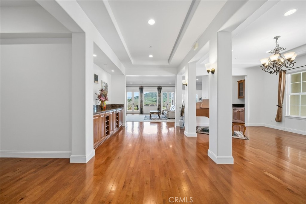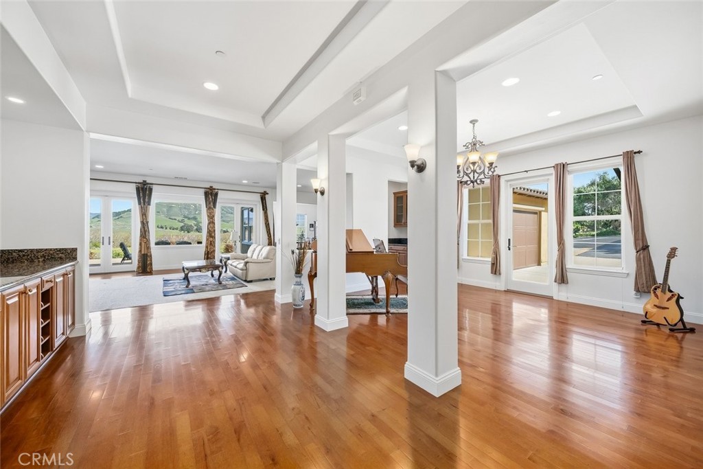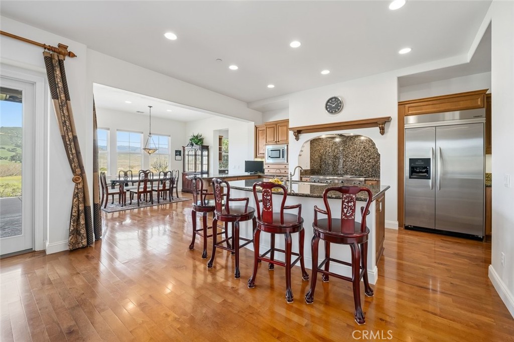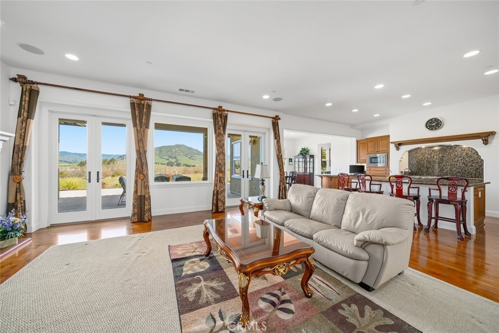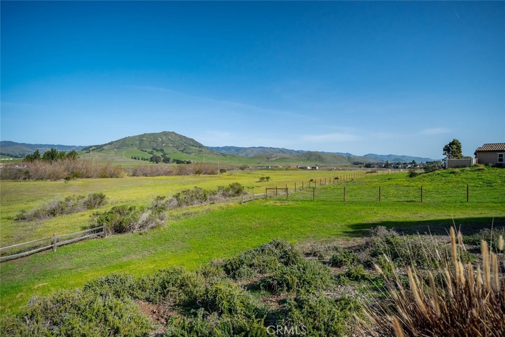 Exceptional Mediterranean-style home captures breathtaking panoramic views of Bishop Peak and the surrounding hills. From the moment you arrive, you’re welcomed by beautifully landscaped grounds and a charming brick walkway that leads to a spacious concrete patio and grand entry. In addition to the two-car and single-car garages, the brick paver area provides parking for three additional vehicles, offering a total of six parking spaces. Inside, the foyer impresses with soaring ceilings, rich wood flooring, and custom built-in sideboard, opening seamlessly to the formal dining area. The living room is elegant and inviting, featuring a striking fireplace and dual French doors opening to the back patio—perfectly framing the incredible Central Coast views. The well-appointed kitchen is designed for both everyday living and entertaining. Highlights include a large island with seating, a dual basin sink with reverse osmosis system, granite countertops, a professional 6-burner stove with center griddle set within an arched alcove with matching granite backsplash, and stainless steel appliances including a dishwasher, refrigerator, microwave, and a double oven. A cozy breakfast nook just off the kitchen provides an ideal space for casual dining. A walk-in pantry and a hallway with wall-to-wall desk space offer exceptional functionality as office space or mail center. The laundry room features ample storage and a folding counter. The home is equipped with a Hague soft water system. The owner’s suite is a true retreat, complete with sitting area, walk-in closet, linen closet, and a luxurious ensuite bath with dual-sink vanity, walk-in shower, and separate soaking jet tub. Four additional bedrooms provide exceptional flexibility, including one with its own ensuite bath, two bedrooms with walk-in closets and private vanities sharing a connected toilet and shower, and a fifth bedroom currently set up as a home office. A convenient powder room adds to the thoughtful layout. Home is prewired with a central alarm system featuring anti-burglary sensors on every door and window, four Swann exterior security cameras, and is fully wired with Cat5 internet connectivity ports throughout. With stunning views, custom features, and an unparalleled Central Coast location that offers privacy while remaining close to town, this approximately 1.31-acre Valle Vista Ranch residence is a rare opportunity to enjoy space, beauty, and comfort in one extraordinary setting.