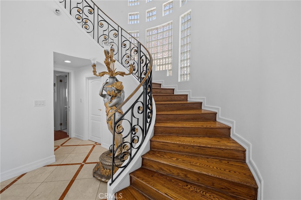 Nestled at the end of a private gated cul-de-sac in prestigious Glendale, 759 Foxkirk Rd represents an extraordinary opportunity to own over 5,267 square-foot architectural tour de force on nearly half an acre of meticulously landscaped grounds. This custom-designed estate, held by only its second owner for over two decades, offers an unparalleled combination of sophisticated luxury, breathtaking views, and ultimate privacy just minutes from downtown Los Angeles. From the moment you enter through the private gates, this Mediterranean-inspired masterpiece captivates with its soaring 30-foot ceilings in the marble entry foyer and a magnificent grand spiral staircase that serves as the home's centerpiece. For ultimate convenience and accessibility, a private elevator provides seamless access between all levels of the home. Nearly every room frames panoramic vistas of downtown Los Angeles and Glendale, creating a living gallery where city lights become your evening entertainment and mountain backdrops define your daily experience. The main level flows seamlessly for grand-scale entertaining, featuring 21-foot ceilings in the living room, dining room, and family room. Floor-to-ceiling windows throughout maximize the spectacular views while flooding interiors with natural light. Rich hardwood floors and imported marble stone create an elegant foundation throughout, reflecting the impeccable attention to detail that defines this property.The spectacular master suite offers a true retreat with panoramic views from every window, creating a sense of floating above the city. The suite features a cozy fireplace for intimate evenings, a luxurious jacuzzi tub for ultimate relaxation, and an expansive walk-in closet that rivals the finest boutiques. Every detail has been carefully considered to create a private sanctuary within this exceptional home.The newly remodeled pool and spa create a private resort experience in your own backyard, perfectly positioned to capture both mountain and city views. The outdoor spaces have been designed as natural extensions of the interior living areas, providing multiple venues for alfresco dining, poolside relaxation, and outdoor entertaining against the dramatic backdrop of the Verdugo Mountains.