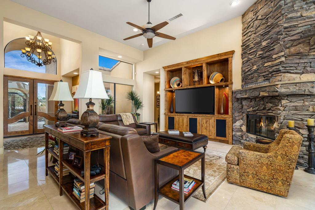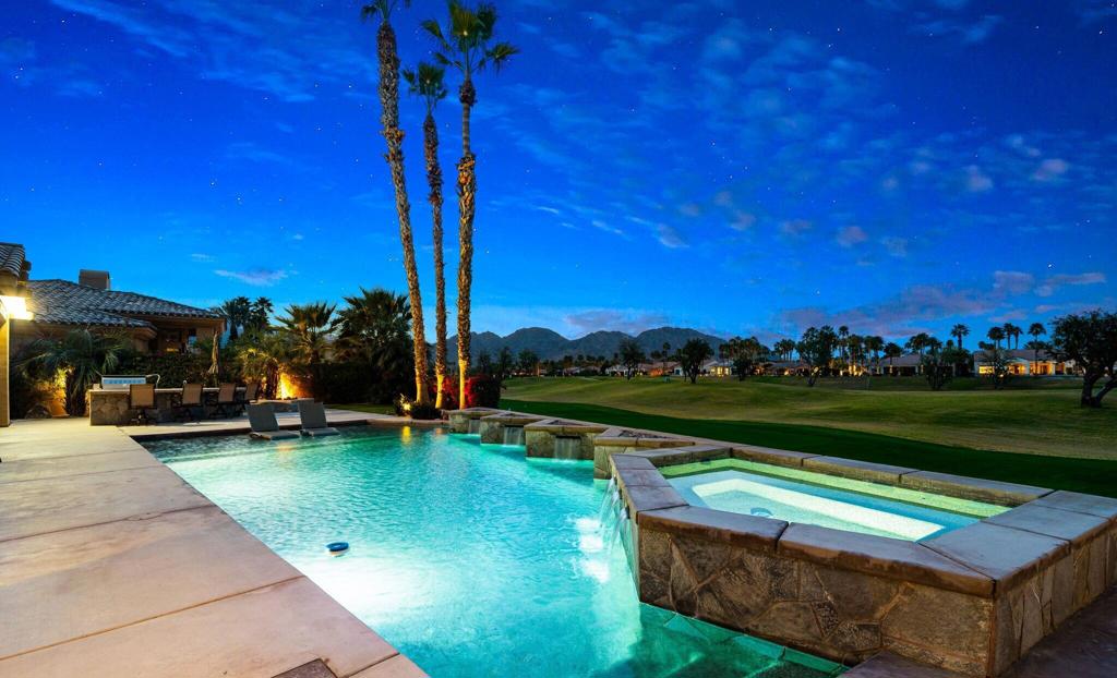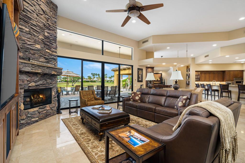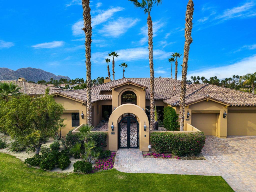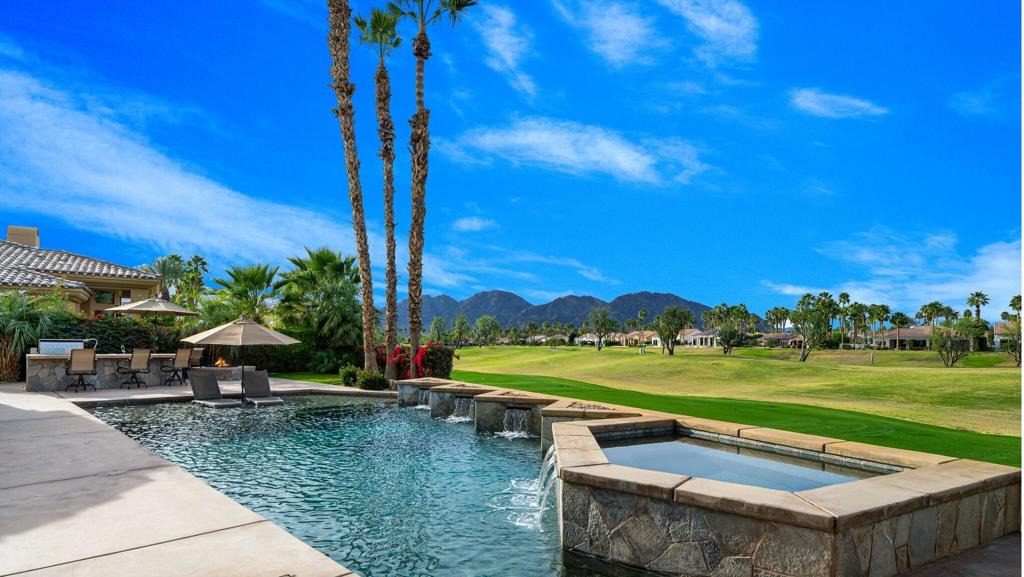 Exceptional elevated semi-custom estate home situated on a 1/2-acre lot overlooking the 13th hole of the private Weiskopf Course, located within the prestigious Summit at PGA WEST. This open and spacious floor plan offers 3 bedrooms and 3.5 baths, including a den/office with sleeper sofa that functions as a flexible fourth-bedroom option. The thoughtfully expanded layout features two primary bedroom suites, along with a well-positioned third guest bedroom off the front courtyard--ideal for guests and entertaining. Designed for desert lifestyle and everyday luxury, the great room serves as the heart of the home, offering an expansive living space anchored by a chef's kitchen. The kitchen features a convenient dining nook for casual meals, complemented by a formal dining room ideal for hosting gatherings. A sunken wet bar enhances the home's entertaining appeal, creating a seamless blend of lifestyle, comfort, and sophistication. Offered turnkey furnished and ready for immediate enjoyment, the home captures the ultimate desert lifestyle with expansive private views, a sparkling pool and spa, built-in BBQ with entertaining island, and firepit. A true car collector's dream, the property includes a 3-car attached garage plus a separate 2-car garage with dedicated work area, perfectly suited for a car collection, additional office, artist or hobby retreat, or extra storage. The expansive lot offers ample space for pets, enhanced outdoor living, or the addition of a guest casita. PGA WEST is an active luxury community offering a variety of membership options to suit your lifestyle. Move in and begin enjoying desert living at its finest.