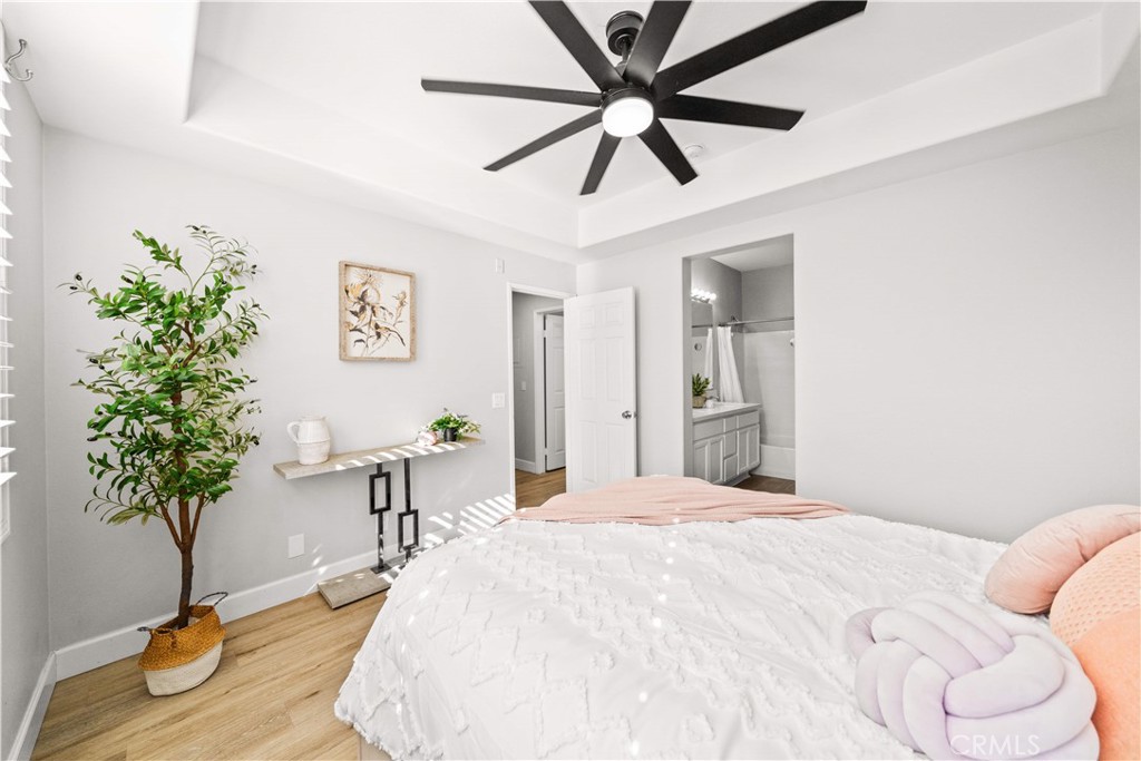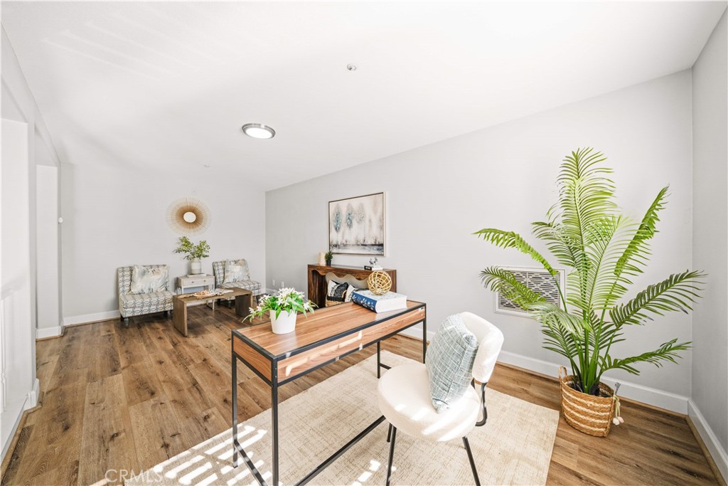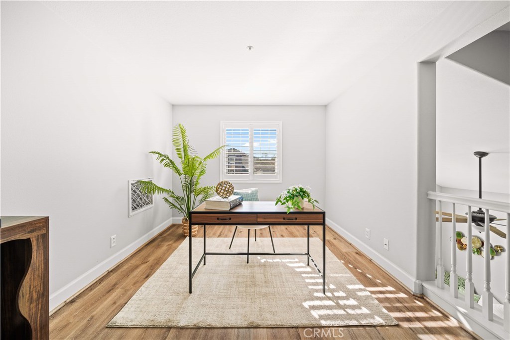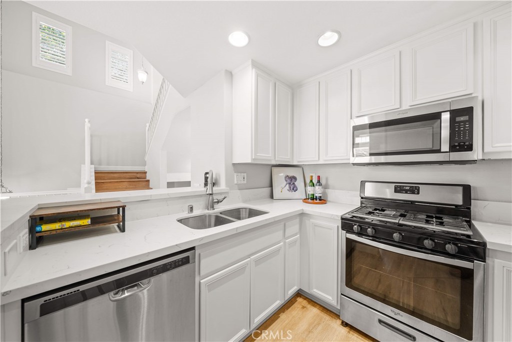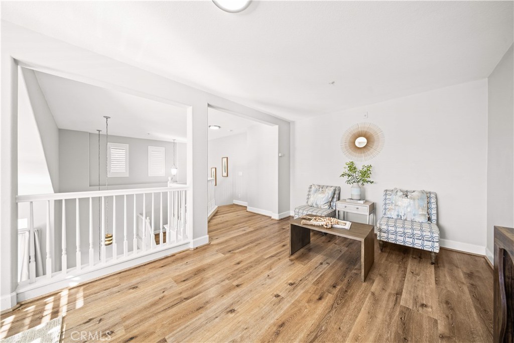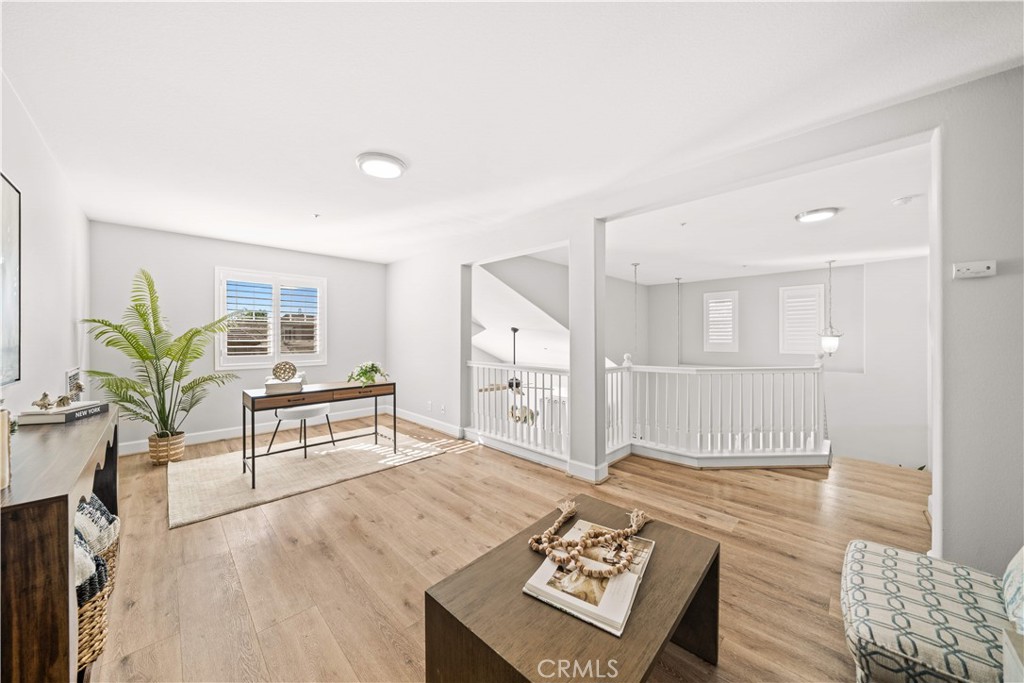 Welcome to this stunning end-unit residence in the highly sought-after Chambray community of Ladera Ranch, featuring soaring two-story ceilings, abundant natural light, and tasteful upgrades throughout. This worry-free living community includes high-speed internet, fire insurance, and exterior maintenance. The bright and open 2-bedroom, 2-bath floor plan is enhanced by new laminate wood flooring and a warm, inviting main living area. The modern kitchen offers white cabinetry, quartz countertops, stainless steel appliances, and recessed lighting, seamlessly connecting to the living and dining spaces. Step outside to the private front patio—perfect for relaxing or entertaining while enjoying neighborhood views and evening lights. The spacious primary suite includes a walk-in closet and an updated en-suite bath with dual sinks, while the secondary bedroom is served by a full hall bath. An expansive upstairs loft provides flexible living space and can easily be converted into a third bedroom. Additional highlights include an in-unit washer and dryer. There are two car parking space: an attached one-car garage, and an assigned parking space #82 located directly in front of the unit. Residents enjoy resort-style amenities, including pools, splash parks, clubhouses, sports courts, trails, a dog park, and community gardens, all within walking distance to Bridgepark Plaza with shopping and dining. This exceptional end-unit home offers comfort, style, and the best of Ladera Ranch living.