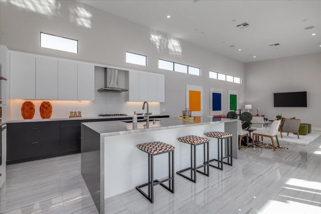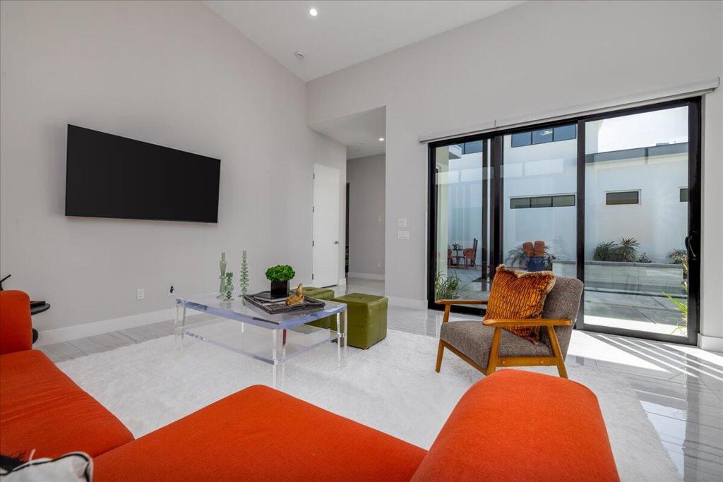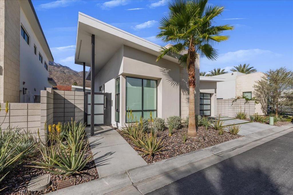 Iconic mid-century design meets modern luxury in The Vue, a gated enclave in the heart of central Palm Springs. Completed in 2023, this single-story architectural residence offers refined design, seamless indoor-outdoor living, and timeless desert appeal. The home's striking butterfly roof sets the tone, while an open-concept layout is flooded with natural light from expansive clerestory windows. Thoughtfully designed for both entertaining and everyday comfort, the residence features 2 spacious bedrooms, 2.5 bathrooms, and a versatile office/den.The chef's kitchen commands attention with premium Thermador appliances, quartz countertops, and a dramatic waterfall island, flowing effortlessly into the living area for a clean, contemporary aesthetic. Dual multi-slide glass doors open to a private backyard retreat with a covered patio ideal for dining and relaxation. A south-facing cocktail pool with Pebble Tec finish and three cascading waterfalls delivers a true resort-style experience, complemented by stunning views of the San Jacinto Mountains. Notable upgrades include built-in speakers with Sonos system, custom electric blinds throughout, a hardwired alarm system, and owned solar panels, blending luxury with energy efficiency. Just minutes from Palm Springs' top restaurants, shopping, and iconic hotels, this is a rare opportunity to own a nearly new architectural home in one of the city's most desirable locations.