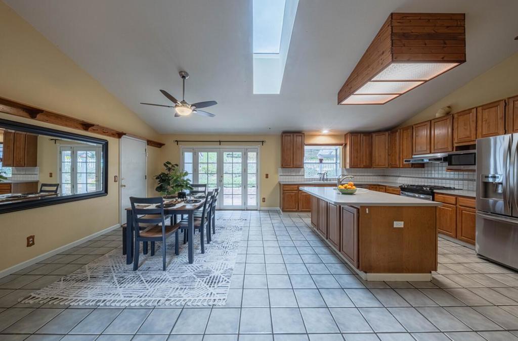 Welcome to Berta Meadows, a private gated community. This single level four bedroom home with a three car garage sits on an expansive 1.15 acre lot and offers space, light, and a strong connection to the outdoors. Vaulted ceilings and skylights create an open, airy feel, with tile flooring in the dining area and hardwood floors in the living room. The eat in kitchen features stainless appliances, an island with sink, and French doors that open to a private backyard with a covered pergola and terraced garden space, ideal for outdoor dining or quiet afternoons. Four well sized bedrooms include mirrored closet doors and an updated hallway bath. The primary bedroom is generous, with windows that look out over the property's natural landscape. One of the guest bedrooms is ideally suited for a home office or flexible workspace. Throughout the home, views capture the natural landscape of a mix of mature native trees, and thoughtfully placed walkways leading to a sunny front patio beneath majestic oaks. The three car garage includes a utility and laundry room with a dedicated work area. Ample parking and room to spread out complete this special property.