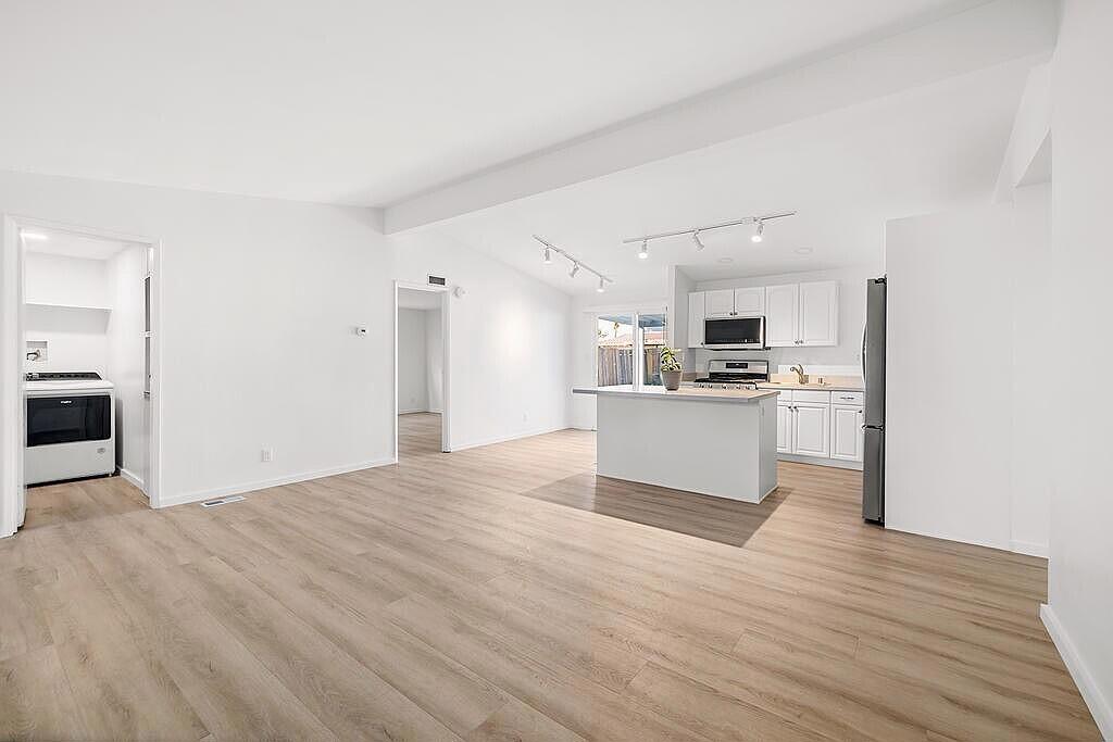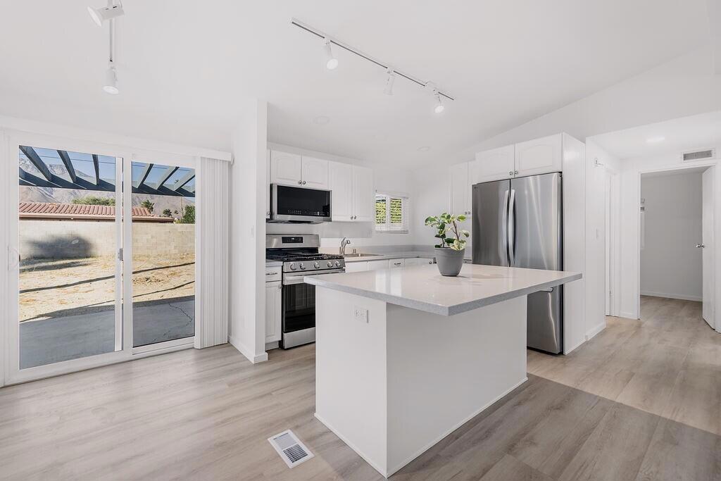 Finally, housing that is affordable in Palm Springs with this recent PRICE REDUCTION!This beautifully updated open-concept home features 3 bedrooms and 2 bathrooms. The kitchen boasts a spacious Silestone quartz island and sparkly countertops. The bright open kitchen is equipped with brand-new stainless-steel appliances, including a refrigerator, dishwasher, gas stove, microwave. The inviting living room is complemented by luxury, wood backed vinyl flooring throughout, new dual-pane windows, and a combination of recessed and track lighting. The bathrooms have been modernized, and the primary bedroom has a generously sized walk in closet. This home also includes a full sized, attached two-car garage! The backyard sports gorgeous views of Mt. San Jacinto and has plenty of room to add a pool and a casita. Access to the CV LINK in right around the corner!In addition, for your peace of mind... YOU OWN THE LAND and there are NO LEASE agreements or HOA fees. Your home is ALL yours!Located just minutes from downtown Palm Springs, you'll enjoy excellent shopping, dining, and a lively nightlife scene, including nearby casinos. Plus, you have convenient access to Palm Springs International Airport and I-10, making it easy to reach Acrisure Arena, Coachella, and Stagecoach Festivals.