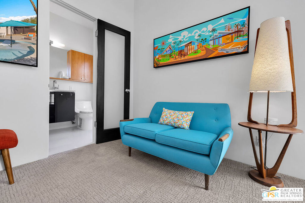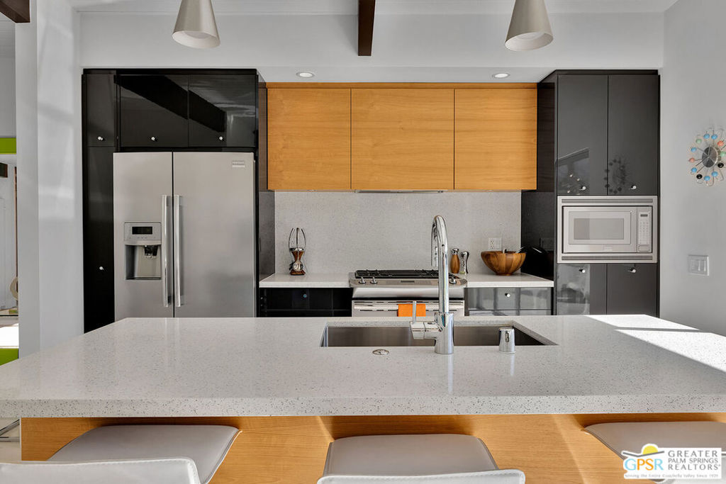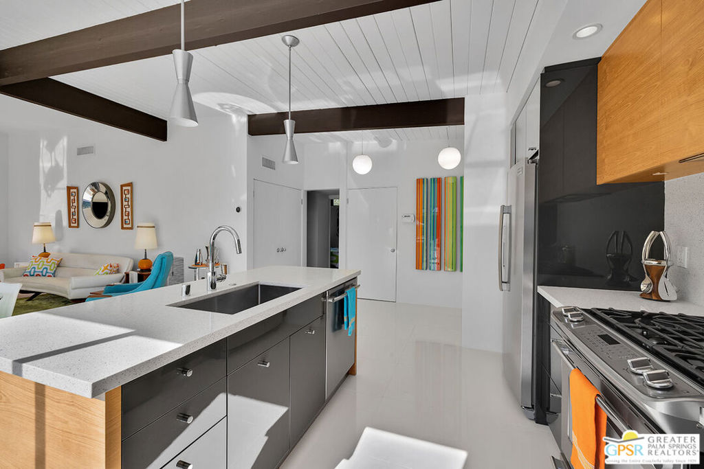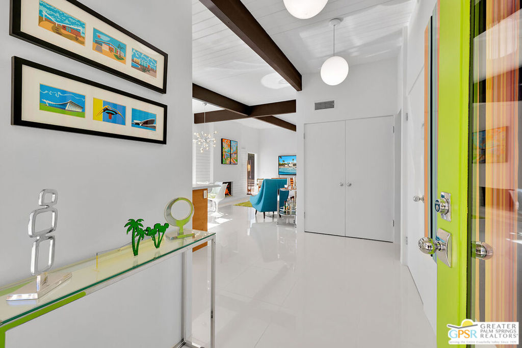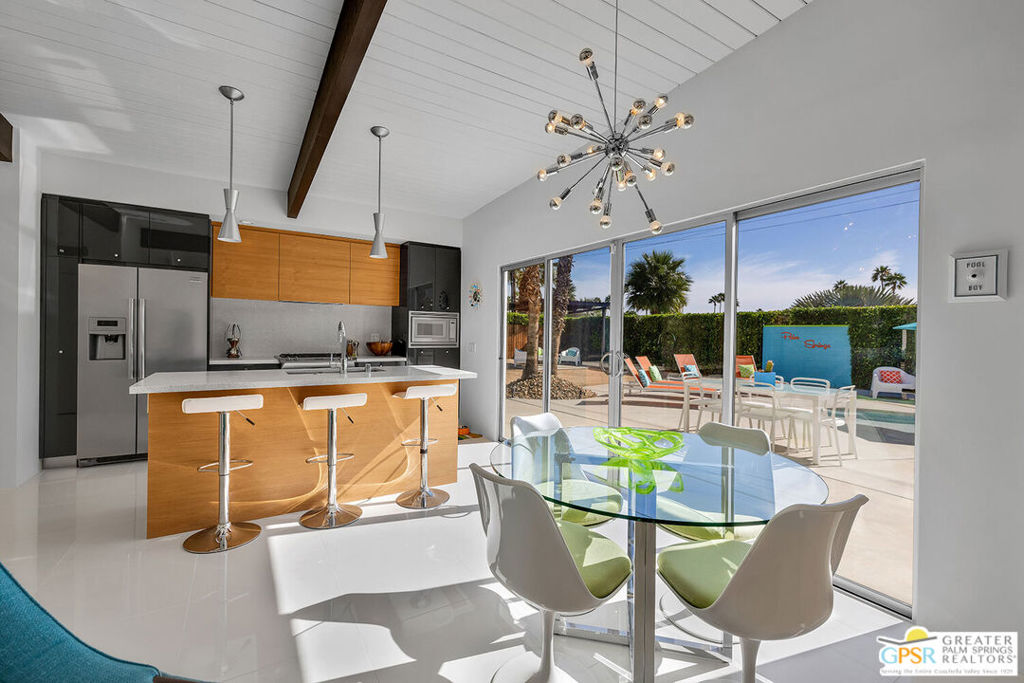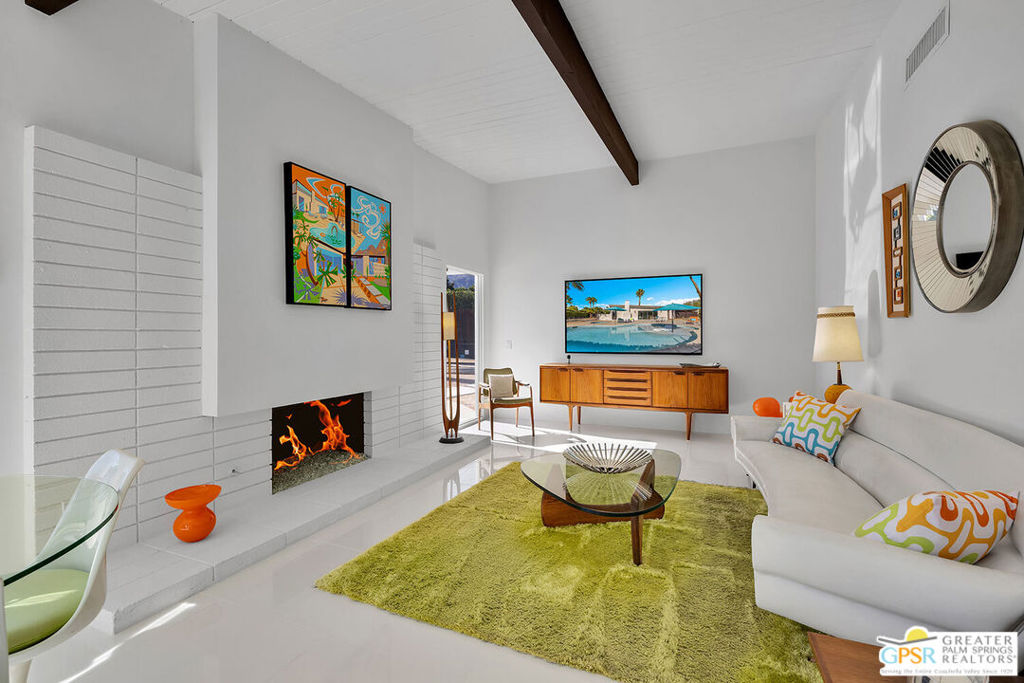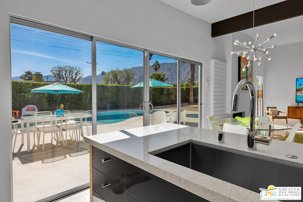 Believed to be one of the last Alexander-built butterfly roof homes constructed in Racquet Club Estates in 1962, this impeccably restored mid-century modern residence is a rare Palm Springs offering. Set on one of the largest lots in the neighborhood and enjoying coveted full southern exposure, the home delivers an exceptional modern desert lifestyle. Originally designed by Palmer & Krisel in the late 1950s, the iconic floor plan has been thoughtfully restored to honor its post-and-beam architecture, soaring clerestory windows, and clean modern lineswhile seamlessly adapting to today's living standards. The residence offers three bedrooms and two spa-inspired baths, complemented by a sleek European-style kitchen with quartz countertops and stainless steel appliances. Polished white porcelain floors and a striking block wall fireplace complete the refined interior aesthetic. Outdoors, the property truly shines. A sprawling resort-style pool and in-ground spa anchor the expansive grounds, joined by a bocce ball court, gazebo with fire pit, and meticulously designed desert landscaping. Wraparound mountain views and effortless indoor-outdoor flow create a setting ideal for both everyday living and entertaining. Recent upgrades include a newly coated foam roof, updated plumbing, refreshed pool systems, an on-demand water heater, and dual-pane windows throughout. Rare, iconic, and impeccably maintained, this is a home that must be experienced in person to be fully appreciated. Contact the listing agent to arrange a private showing.