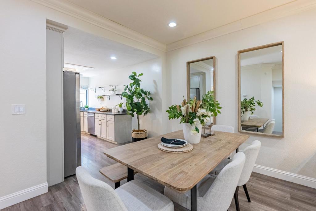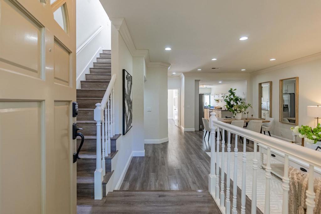 Towering 3-story townhome nestled in a park-like community, within walking distance of parks schools and less than a mile away from downtown Sunnyvale, which is your Caltrain connection. Featuring a welcoming open floorplan, high ceilings with recessed lighting, laminate flooring, tons of natural light from the dual pane windows, skylight, ring doorbell, WiFi smart light switches, heat/AC, fireplace, laundry room with washer/dryer and bonus office/den/gym. Gourmet kitchen featuring high-end stainless steel appliances, quartz countertops, tons of cabinet space and open dining area. 2 bedroom suites each with their own en-suite bathroom and closet w/ custom organizer. The over-sized primary bedroom suite ft. a walk-in closet and a spa-like en-suite bathroom featuring a frame-less stall shower and dual sinks. To top it all off, a two car garage, spacious patio with two separate entrances, extra storage and relaxing community swimming pool/spa. Located in a convenient location near restaurants, shopping, parks and major tech giants (LinkedIn, Google, Apple). Easy access to highway 101, 237 and Central Expressway. Do not miss your chance to own this newly remodeled stunner. It will go FAST!