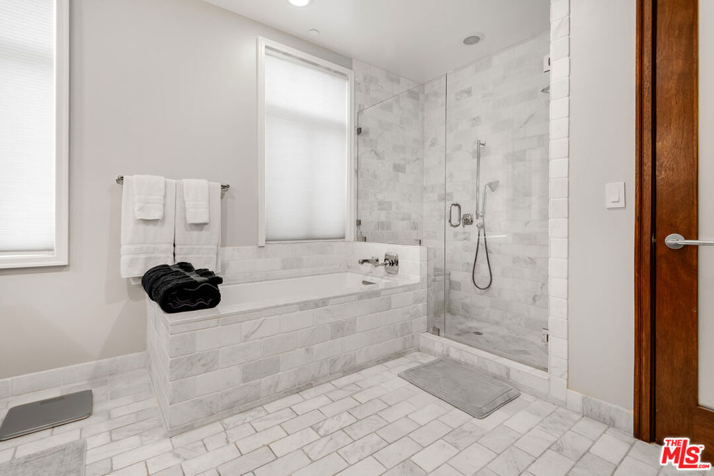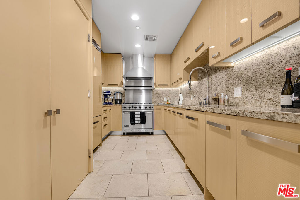 Front-facing 2-bedroom, 2.5-bath residence in the full-service La Terrasse condominium building in Beverly Hills. This luxury condo features brushed walnut and limestone flooring, a floor-to-ceiling limestone fireplace, solid-core mahogany doors, and high-gloss Italian burled walnut and sycamore cabinetry. The kitchen offers polished marble and granite countertops along with top-of-the-line appliances.The spacious primary suite includes a spa-style bathroom with separate soaking tub and shower. Multiple walk-in and built-in closets provide ample storage. In-unit washer and dryer included.Unit includes three side-by-side parking spaces and two large private storage units. La Terrasse amenities include concierge/guard service, secure gated parking, reception lobby, media room, fitness center, club terrace, and a fourth-floor sun terrace with city views. Conveniently located in Beverly Hills and near the Sunset Strip, the Golden Triangle, Bristol Farms, Melrose Place, and Robertson Boulevard shopping and dining.