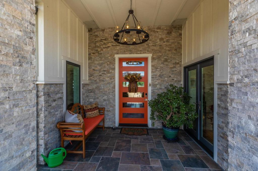 This beautiful exceptionally maintained home is located in one of Hollister's newer 5 acre neighborhoods, east of Fairview Road and nestled near the base of the beautiful Santa Ana Mountains. 2,986 square foot custom built Green Home with 360 degree views of the surrounding mountains and valley. Solar panels (leased) boost its energy efficiency. High end Water Purification System insures excellent water. This home has 4 bedrooms-2.5 bathrooms, large living room, separate breakfast nook and formal dining room, bright spacious office and pantry. Open concept kitchen upgraded with large leathered-granite island, granite countertops and custom cabinets. Floor to ceiling stone fireplace (gas) with attractive Alder bookshelves on both sides. Clerestory windows in living room, hallways. Beautiful engineered hardwood floors plus carpet. Oversized 3 car garage, 2 driveways with extensive landscaping that includes over 30 olive trees, pepper trees, oleander bushes, rock lined pathways, ground cover. Imported Indian tiles on entryway, front patio, and rear patios. Custom arbor in rear with levered panels. Ample room for ADU and barn. Refrigerator, washer and dryer include in sale. Sellers are original owners. No HOA