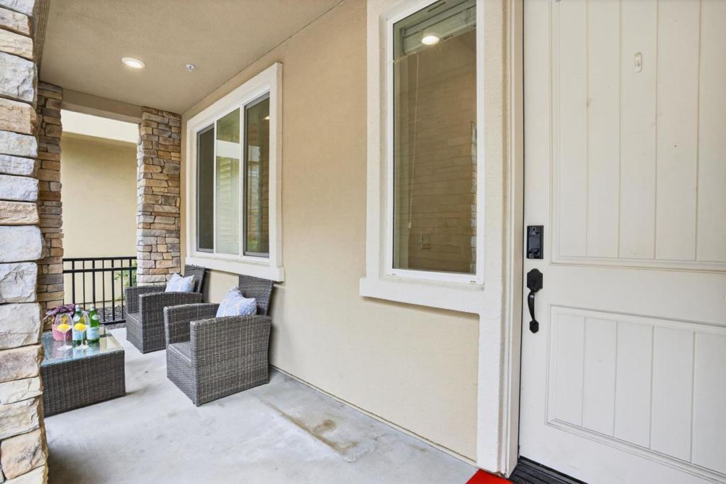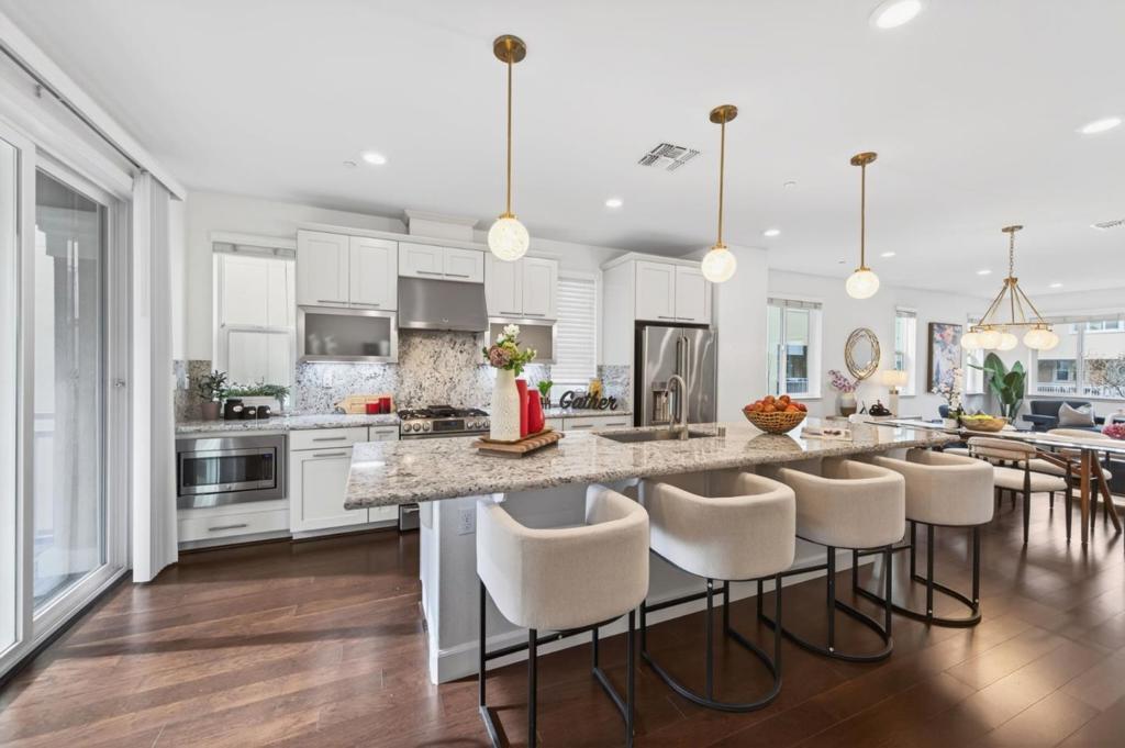 Discover elevated living at Avenue One. This turnkey, upgraded 4-bedroom, 3.5-bath end-unit townhome is just 9 years old and is located on the interior side of the community, offering a quieter setting away from freeway exposure. The sought-after floor plan features the community's largest kitchen island, paired with an expansive pantry. The light-filled open-concept living level flows from the kitchen to the living and dining areas and extends to a private balcony. Finishes include granite countertops, stainless steel appliances with a gas range, soft-close cabinetry, recessed lighting, custom fixtures, and built-in storage. A first-floor bedroom with a full bath offers flexibility for guests or a home office. Upstairs, the primary suite features dual vanities, a walk-in shower, a soaking tub, a walk-in closet, two additional bedrooms, and a side-by-side laundry. Additional highlights include wired AT&T Fiber internet, 3-zone HVAC with independent climate control including an Ecobee smart thermostat, smart-home features, and a two-car garage equipped with 240V EV-ready outlet. Residents enjoy a clubhouse with pool, spa, fitness center, BBQ areas, playground, gated dog park, nearby parks, and convenient access to Costco, Village Oaks, VTA Light Rail, and Highways 85 and 101.