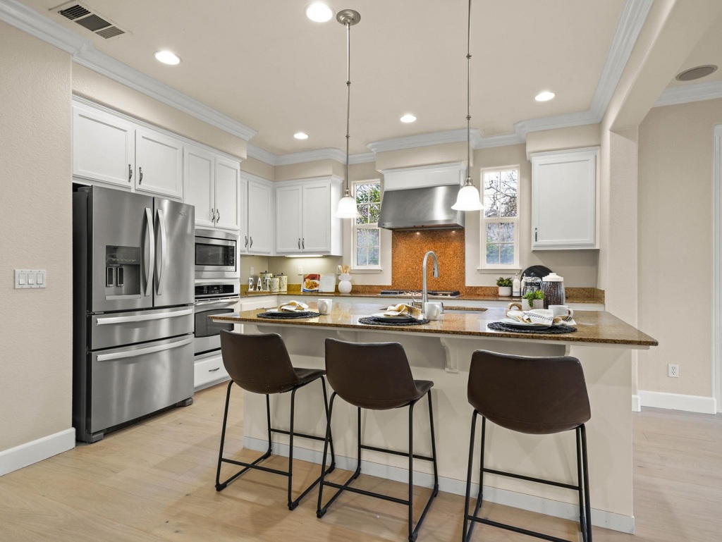 Beautifully updated Windemere home with brand new hardwood flooring, new carpeting, fresh paint & tankless water heater. Walk to Live Oak Elementary School & San Ramon Sports Park. Ideal floorplan w/downstairs bedroom has ceiling fan, mirrored closet doors & hardwood flooring perfect for guests or family and separate full bathroom with tiled counters & oversized shower. Formal Living Room w/Gas Fireplace & Formal Dining Room w/Chandelier & Sliding Glass Door to Side Yard w/stone patio for Entertaining or Summer BBQ's. Chef's Kitchen has large island w/deep sink & breakfast bar seating, white cabinets, stainless steel appliances, built-in 5-Burner Gas Cooktop & French Door Refrigerator. Casual Dining Area w/built-in cabinets & Family Room with built-in shelving & speakers, ceiling fan & gas fireplace. Double Door Entry Primary Suite w/sitting nook & ceiling fan, Spa-like bathroom w/dual vanities, make-up counter, jetted tub, walk-in shower & large walk-in closet w/custom built-in shelving. Three bedrooms upstairs w/ceiling fans share a hall bathroom with dual sinks & separate shower/tub combo. Tech Center Area w/Built in Desk Space & Cabinets. Upstairs Laundry with Washer, Dryer, Sink & Storage. Backyard retreat has pergola & stone patio & walkway, mature trees & water fountain.