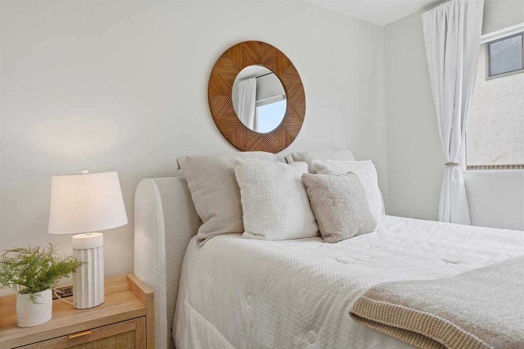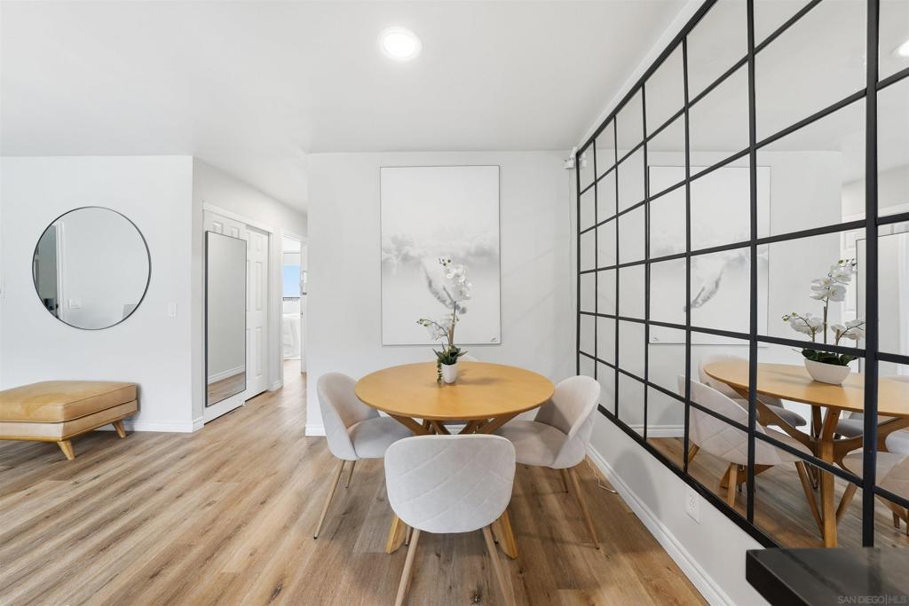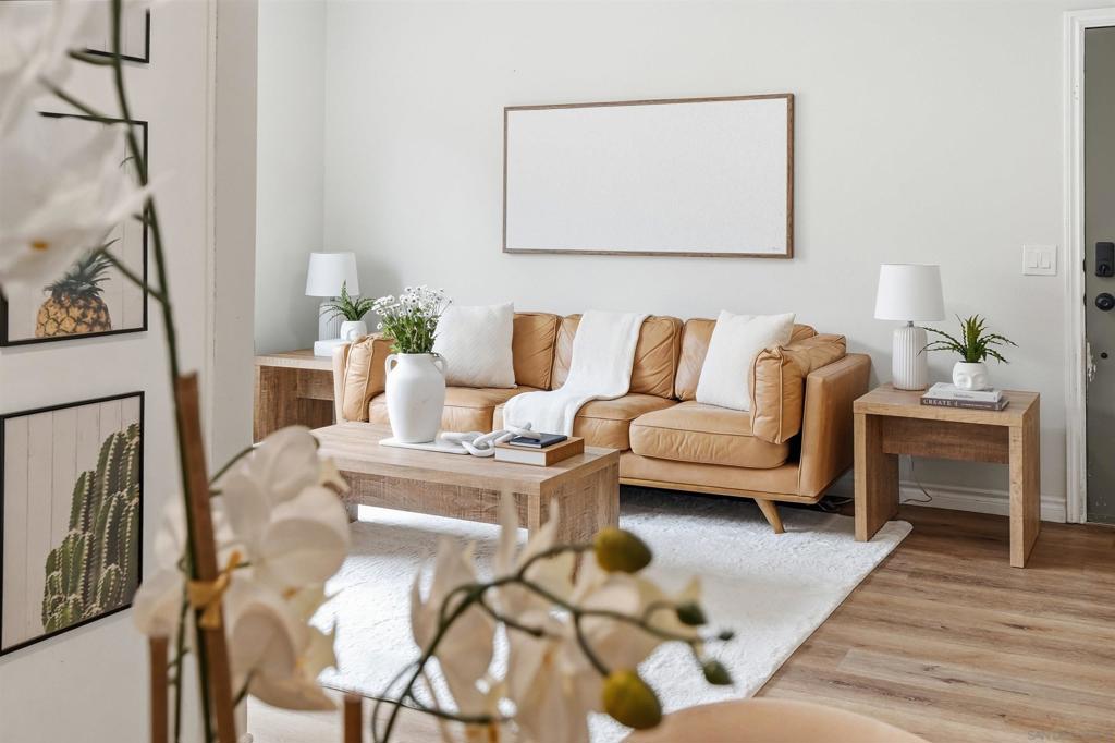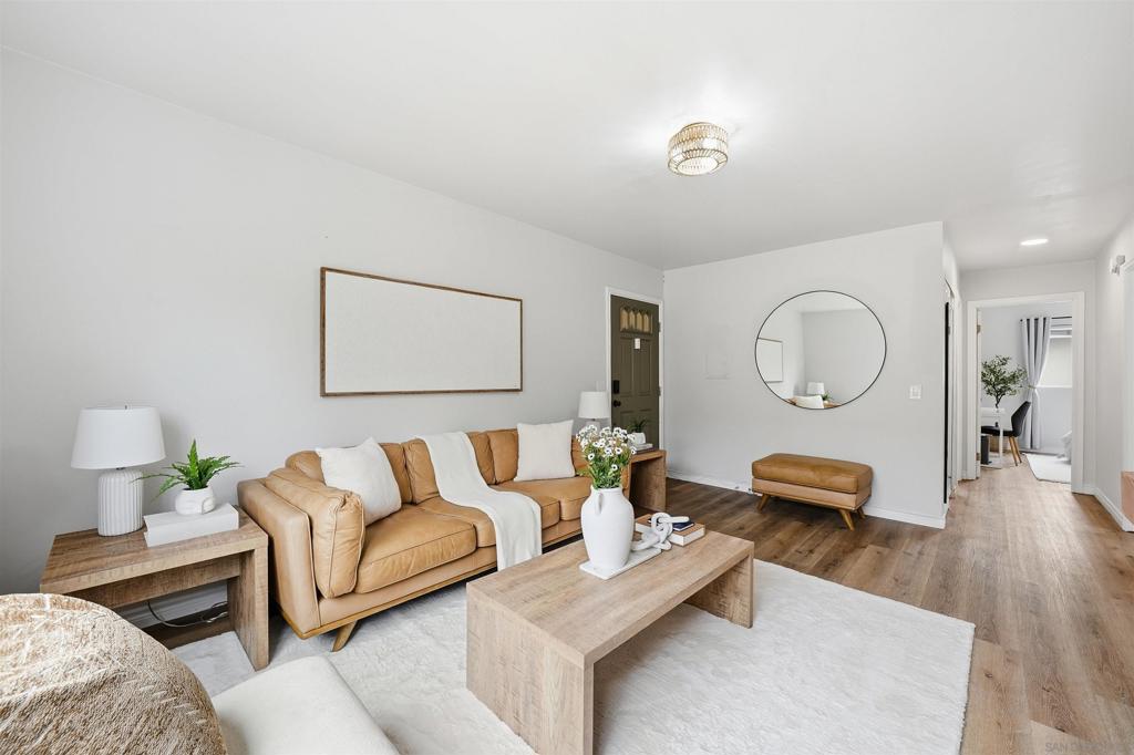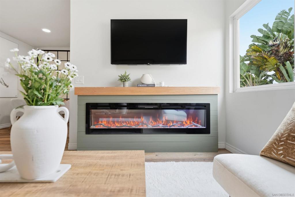 Welcome to this beautifully updated residence in the heart of Imperial Beach. This light and bright home features luxury vinyl plank flooring throughout, an updated kitchen with modern finishes, and a convenient in-unit stackable washer and dryer. The renovated bathroom showcases stylish tile work, a contemporary vanity with integrated lighting, and quality fixtures. The primary bedroom offers a walk-in closet, and both bedrooms are generously sized. Enjoy cozy evenings by the built-in electric fireplace with shiplap surround, adding warmth and charm to the living space. Additional highlights include one assigned parking space and a well-maintained community setting. Ideally located near local shops, dining, and the beach, this home offers comfort, style, and coastal living at its best.